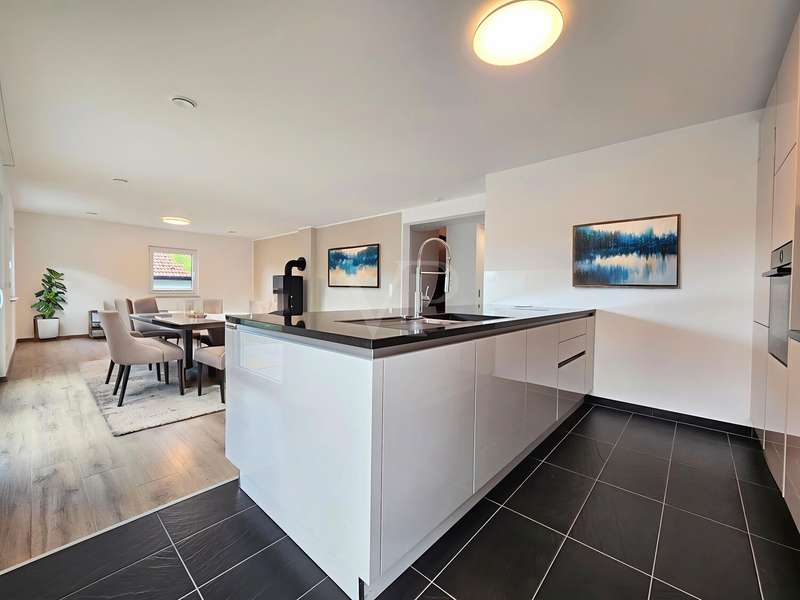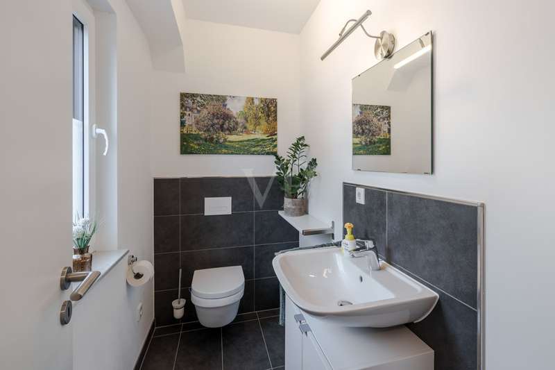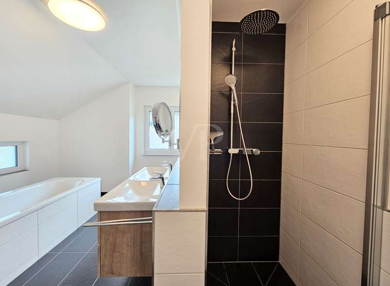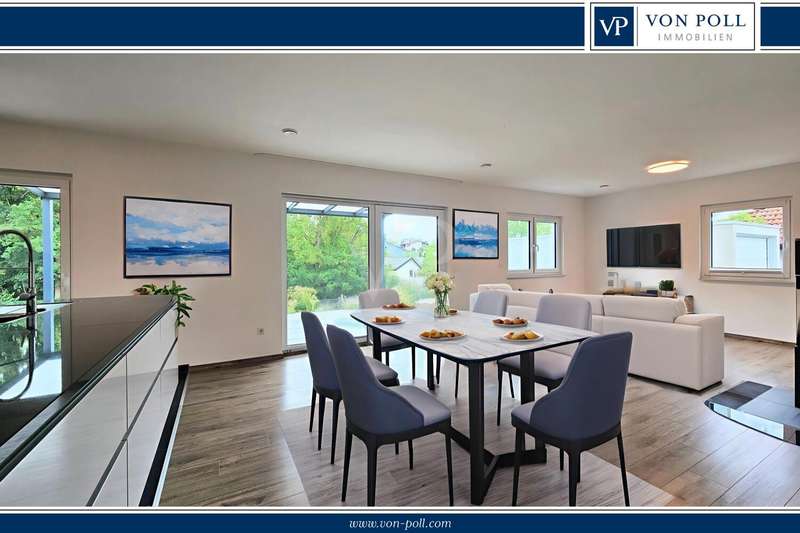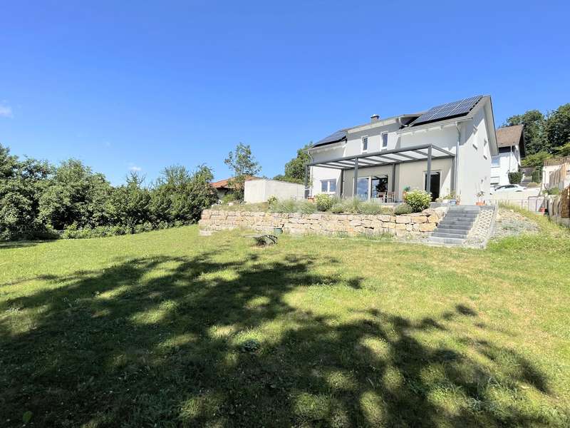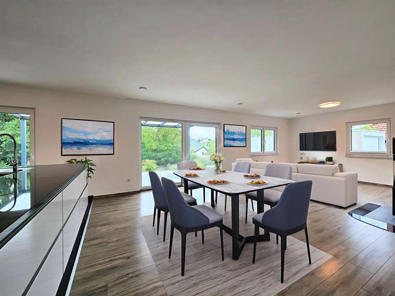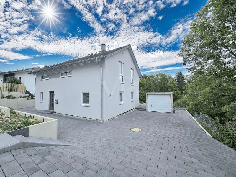 Discover an impressive detached house in Usingen that impresses with its as-new condition and first-class fittings. With an outstanding energy standard of A+, this home offers modern amenities and maximum energy efficiency. This appealing home combines modern luxury with the beauty of nature. The spacious garden invites you to relax and offers a picturesque view of the greenery, while the quiet location creates an oasis of relaxation. Inside, an exquisite Nolte fitted kitchen awaits you with its special details. The elegant bathrooms, including two daylight bathrooms and a guest WC, are harmoniously designed and offer a high level of living comfort. The tasteful floor coverings and well thought-out room layout create an atmosphere of modern design and functionality. The master area with dressing room and a spacious bathroom with free-standing bathtub and floor-level shower is a real highlight. There is also space here to install an infrared cabin. The well thought-out architecture of the house opens up numerous possibilities, including the option of integrating an elevator - ideal for all stages of life. The spacious rooms are perfect for families and offer plenty of space for individual design. In terms of technology, this home sets standards: a photovoltaic system, a solar battery storage unit and a smart meter ensure a sustainable energy supply. The double heat pump ensures a pleasant indoor climate, whether you want to heat or cool, and supplies fresh air for a healthy living environment. Enjoy the view through the floor-to-ceiling windows of the largely finished outdoor area with natural stone wall, large lawn and large terrace with atmospheric lighting. Thanks to the roof, the terrace can be used almost all year round. The quiet surroundings nevertheless offer good connections to shopping facilities and public transport, which you can reach by car in just a few minutes. This property is an excellent choice for couples or families looking for a stylish and energy-efficient home. It can be occupied by arrangement. Don't miss out on this opportunity and arrange a viewing today to see this exceptional offer for yourself!
