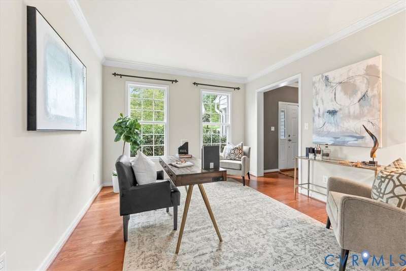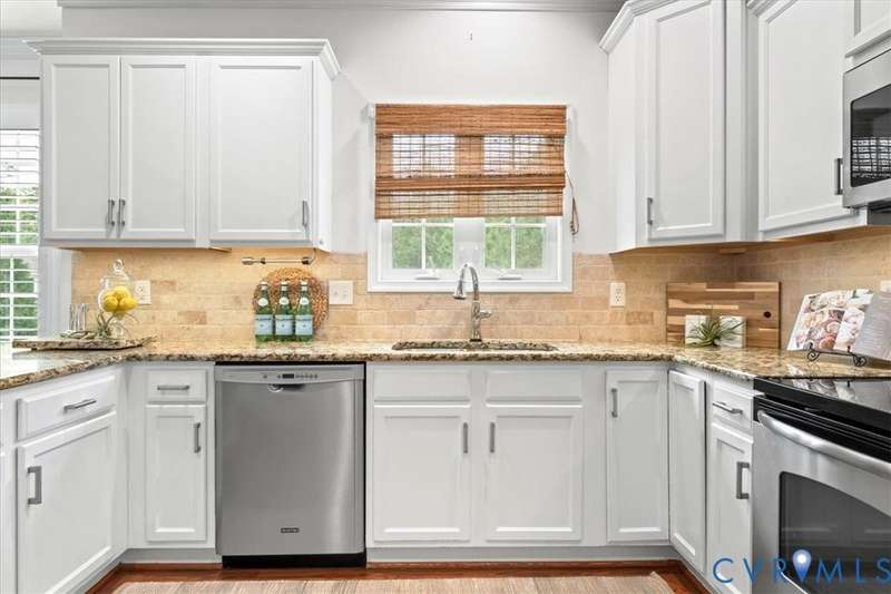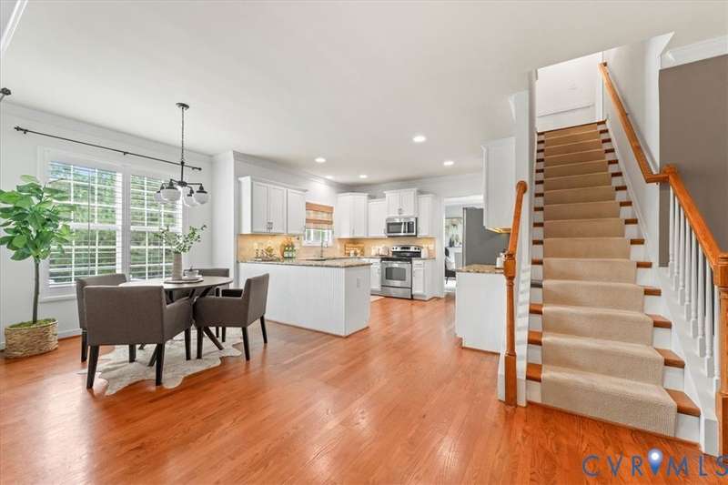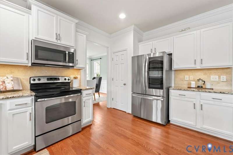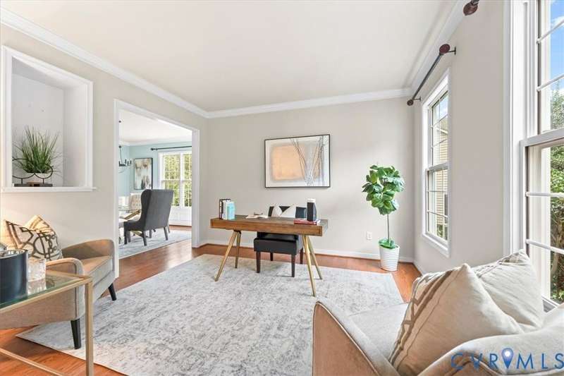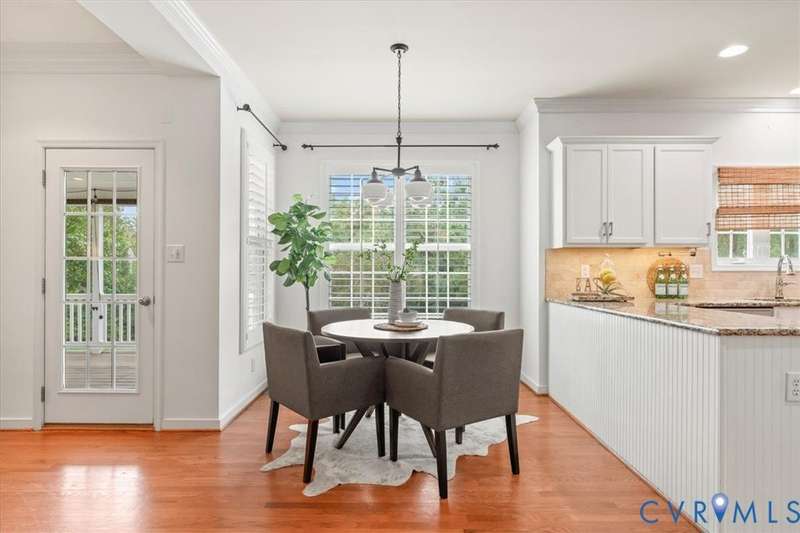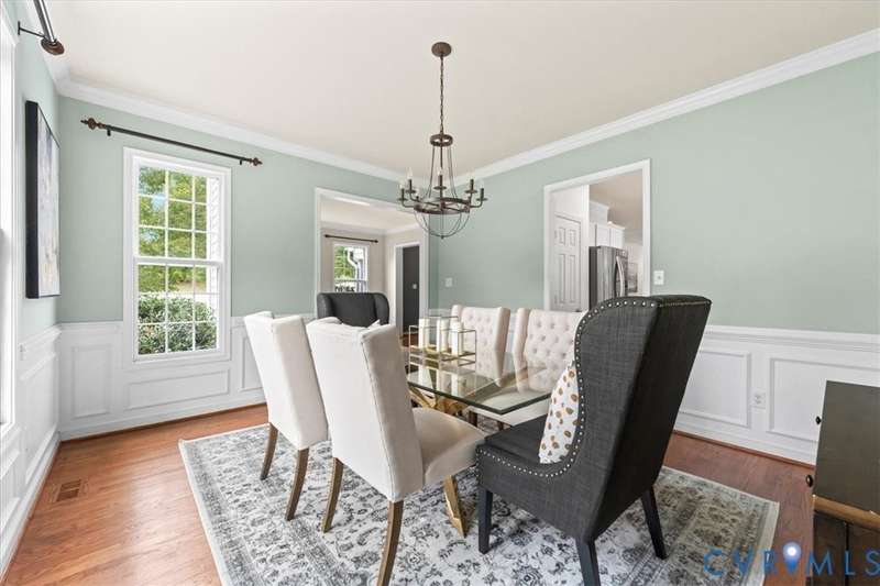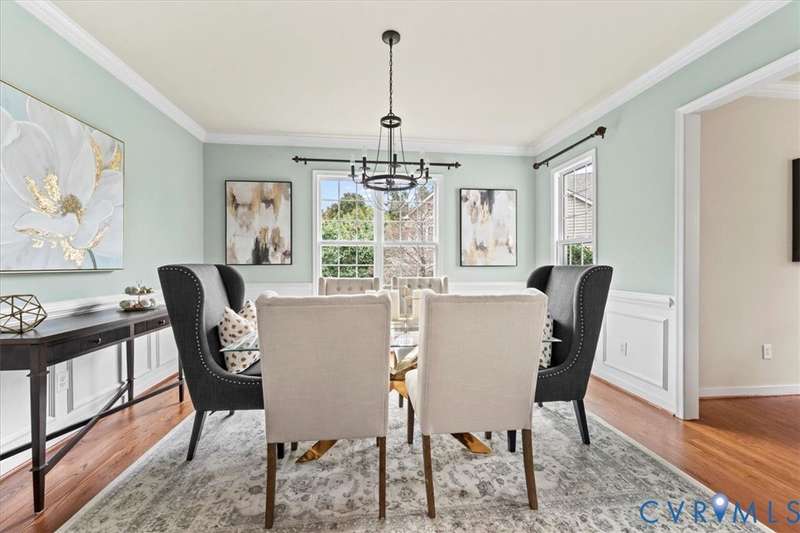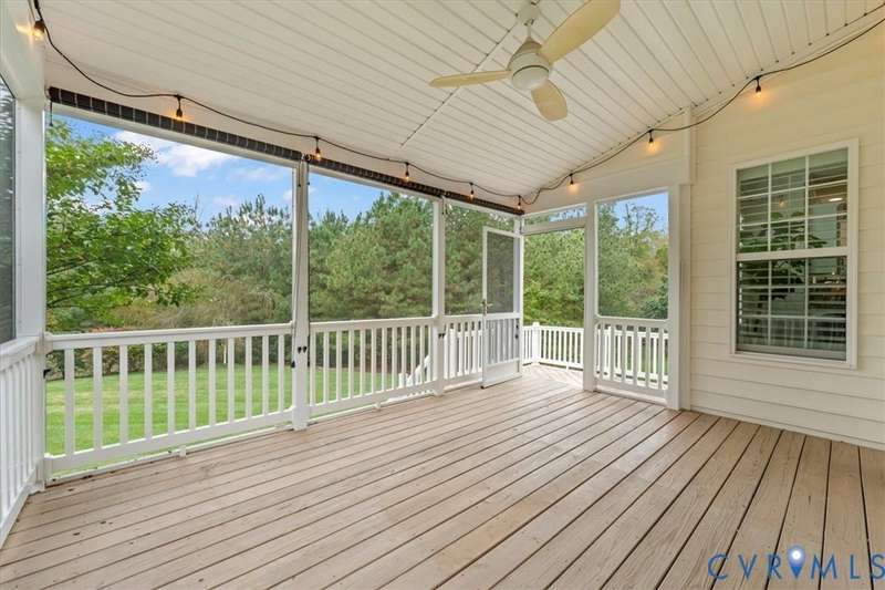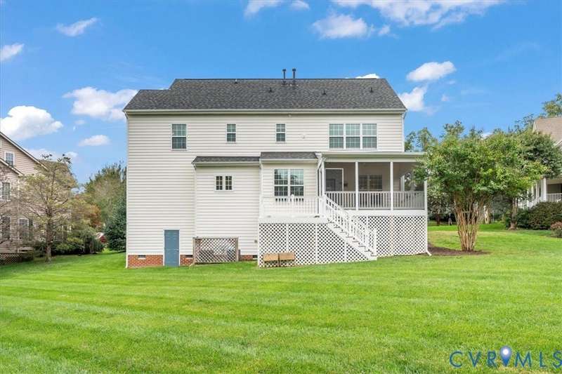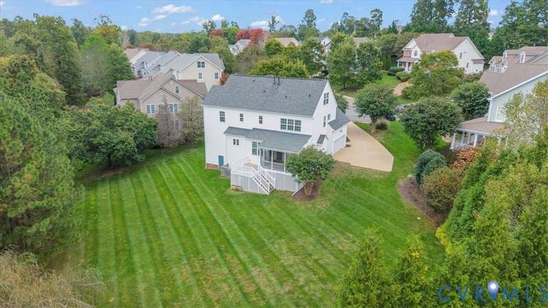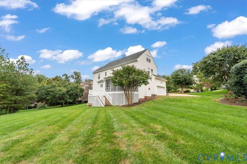 Welcome to 1407 Lundy Terrace in Mallory Village at Charter Colony. This spacious 5-bedroom, 3.1-bath home sits on one of the largest cul-de-sac lots in the neighborhood-two to three times the size of most-and backs to a wooded Charter Colony buffer, offering privacy and a park-like setting. Enjoy the view from the screened porch or grill on the open deck while taking in the sunset. Inside, wood floors flow throughout the first and second levels. Detailed millwork includes wainscoting and crown molding, complemented by updated lighting, flush wood vent covers, and generous closet and storage space. The open kitchen connects to a bright breakfast area and family room featuring a fireplace with dental-molded mantle, built-ins, and access to the screened porch. The flexible floor plan includes five bedrooms, with options for a recreation room or home office on the third floor. The large primary suite feels like its own retreat, and tall ceilings paired with abundant natural light create an inviting atmosphere throughout. Mallory Village residents enjoy a true sense of community with amenities such as pools, clubhouse, tennis and pickleball courts, playground, and walking trails-plus monthly neighborhood events. Conveniently located near 288, Powhite Parkway, and Midlothian Turnpike. A rare combination of space, character, and convenience in one of Midlothian's most desirable neighborhoods.