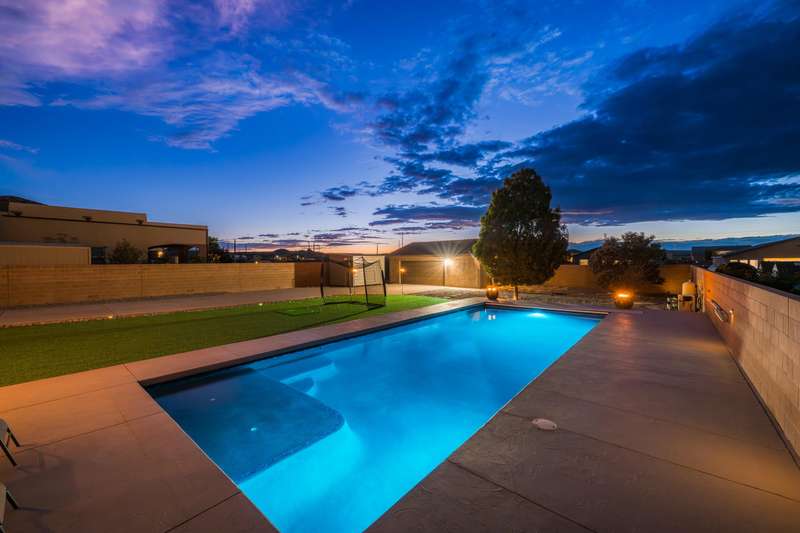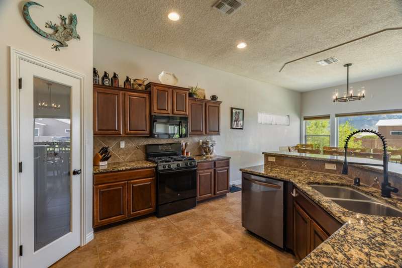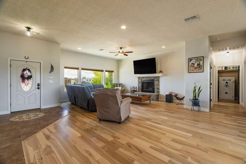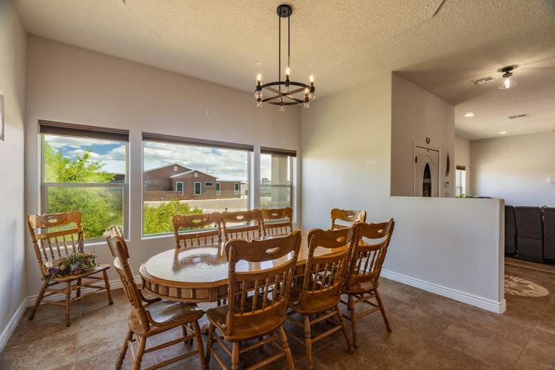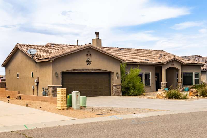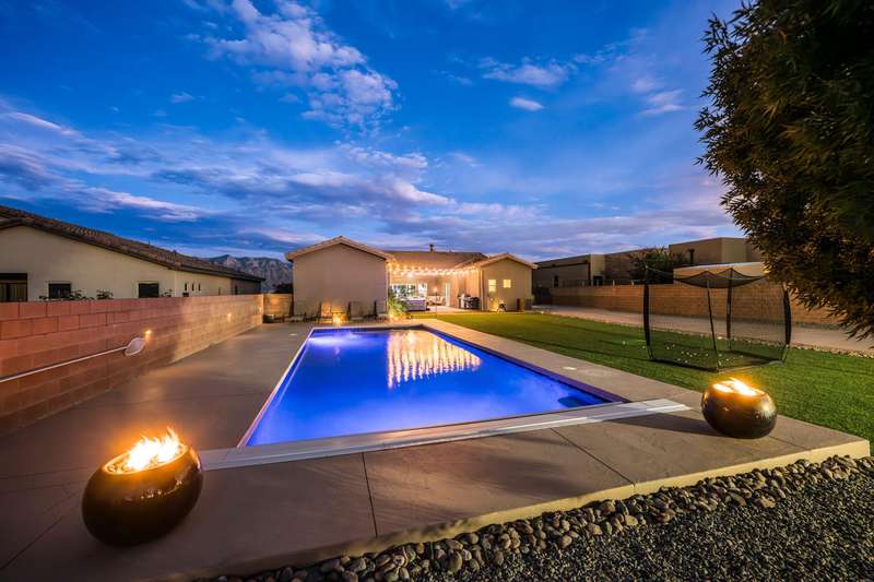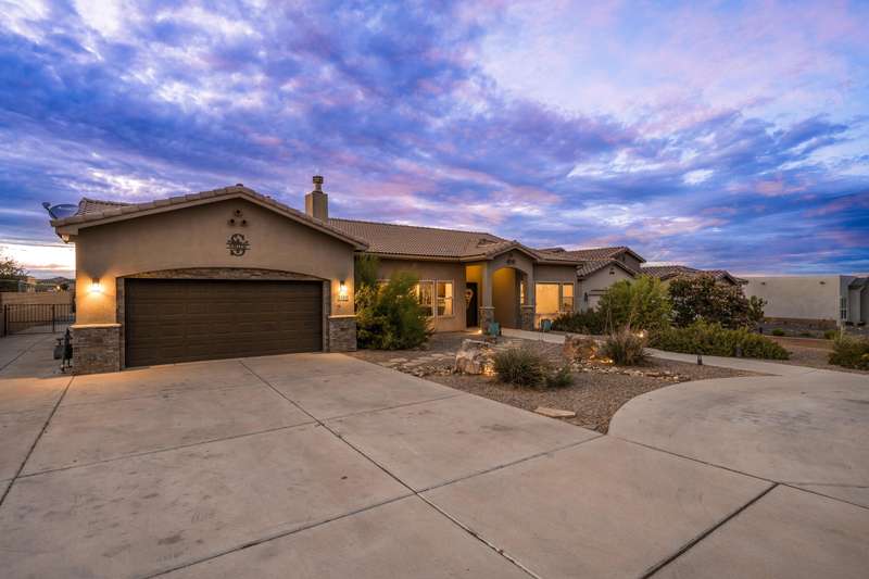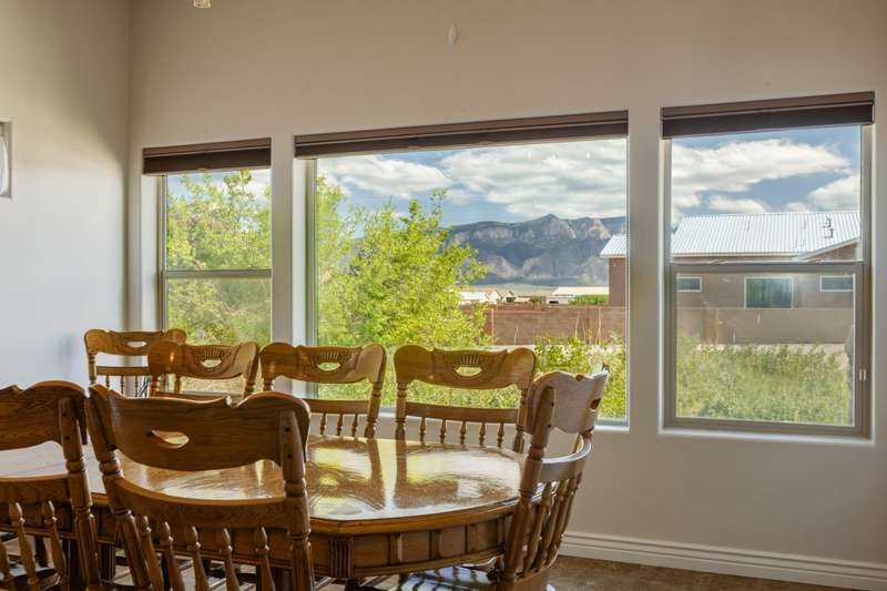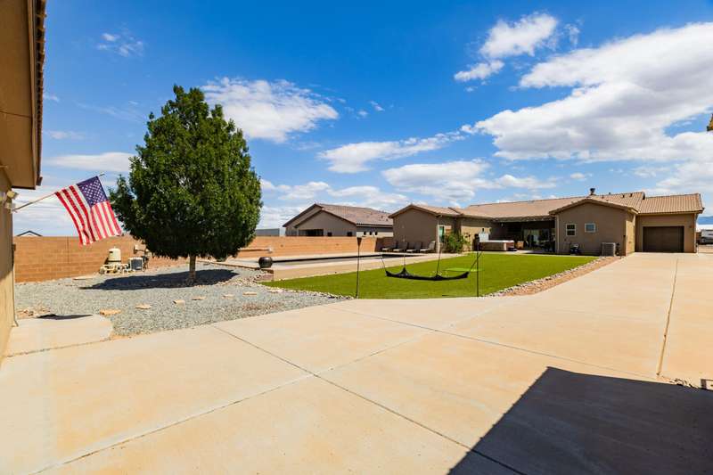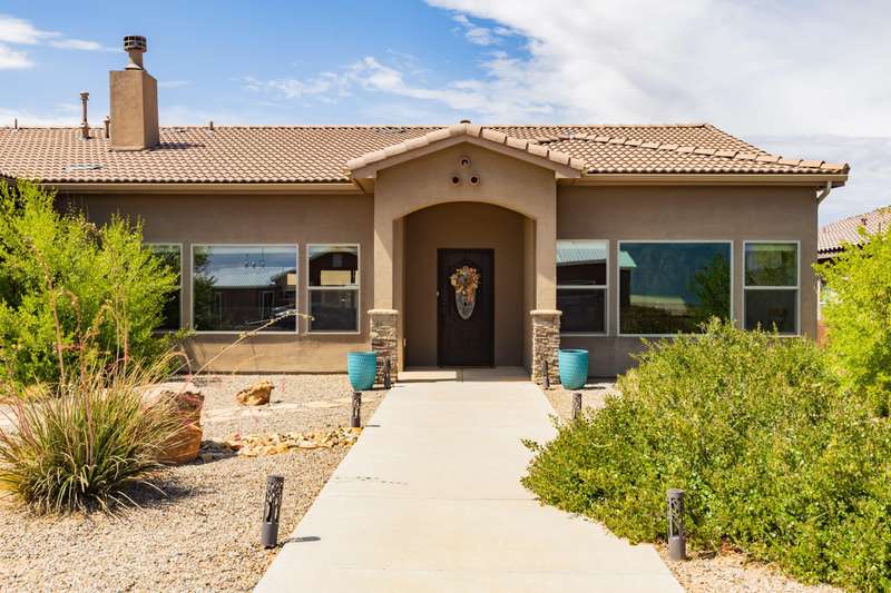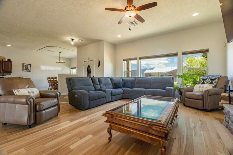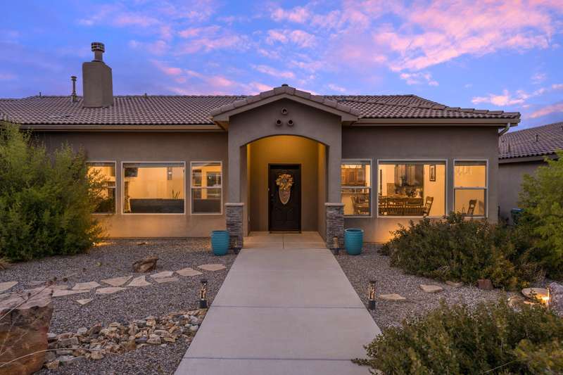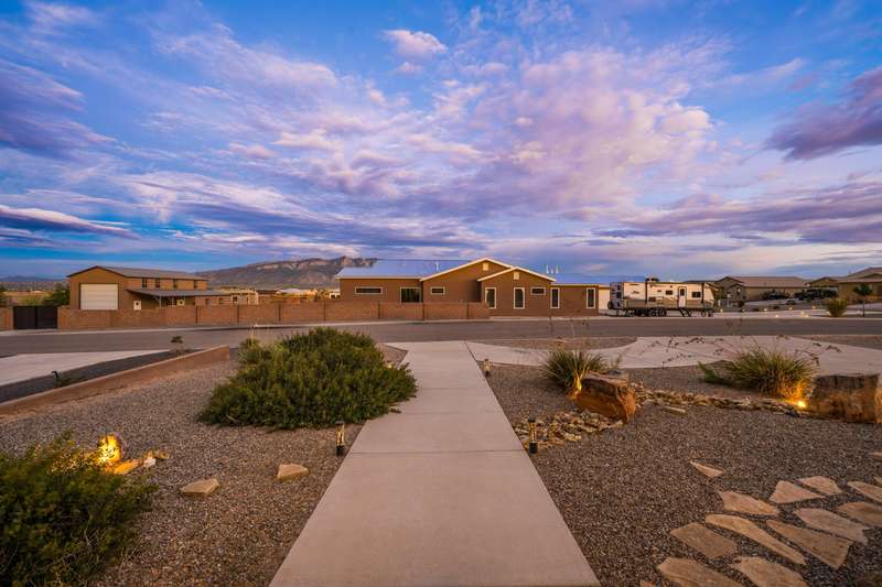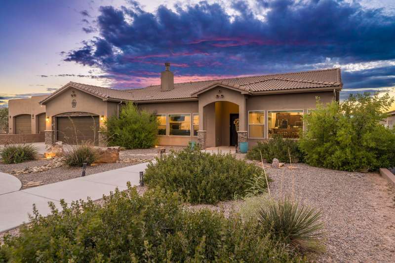 This amazing home will check some boxes! Mountain views! Single story! Total of 5/6 car garage with drive through option to the detached garage that could fit up to 3 cars). Backyard access! Pool! Hot tub! Wow! Enter to open great room, kitchen, dining concept w/great natural light & access to rear covered patio. Spectacular 3/4'' hardwood floors throughout except wet areas. Kitchen w/granite counters , gas stove, pantry & bar. Mountain views from dining rm. Custom blt-ins in office/flex space. Primary BR w/patio door to hot tub & pool. Two closets! Nice bath w/multi-head shower. Sue Cleveland High School, Mountain View Middle School & Sandia Vista Elem. Lovely home to live in and space to enjoy all your hobbies and fun!