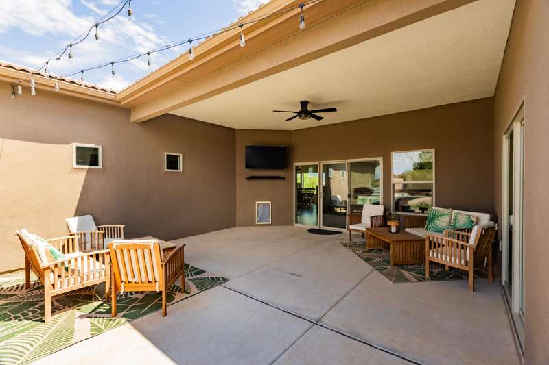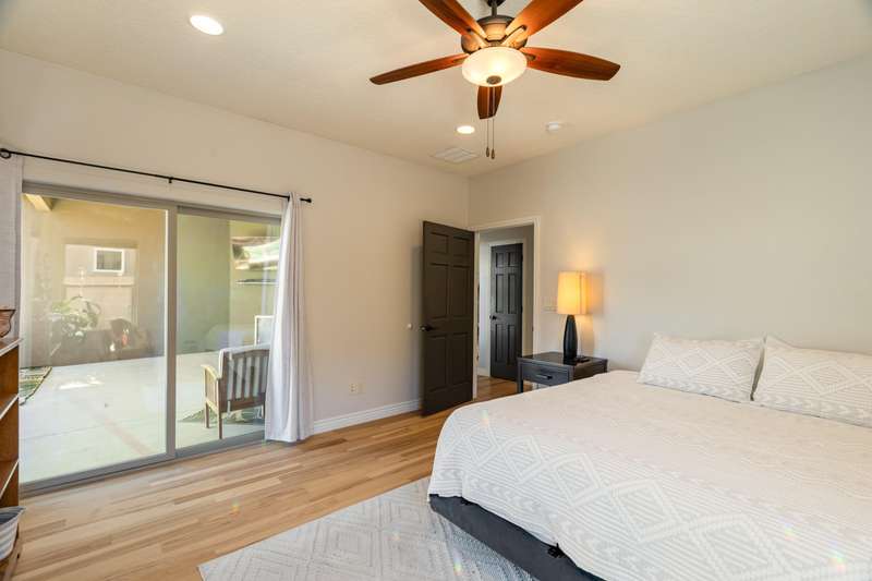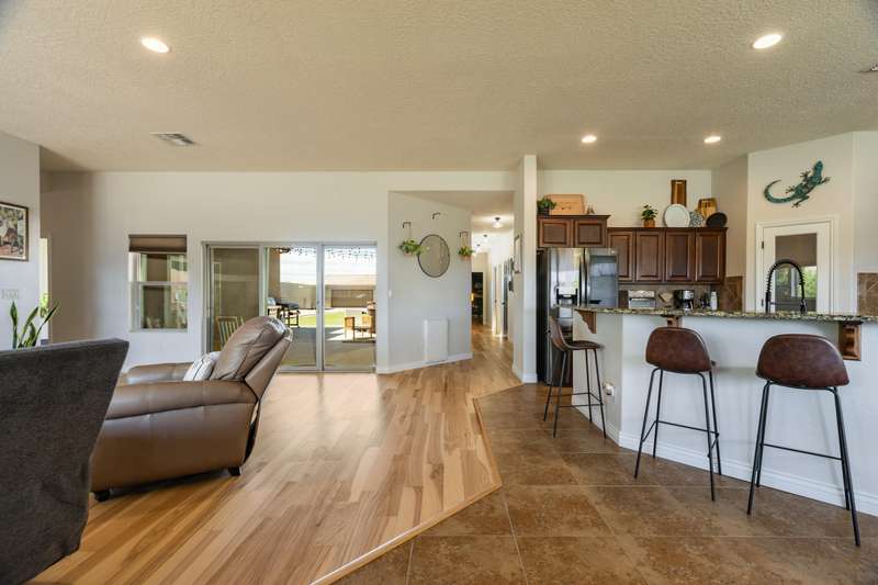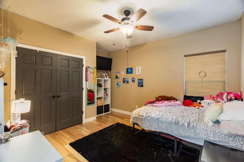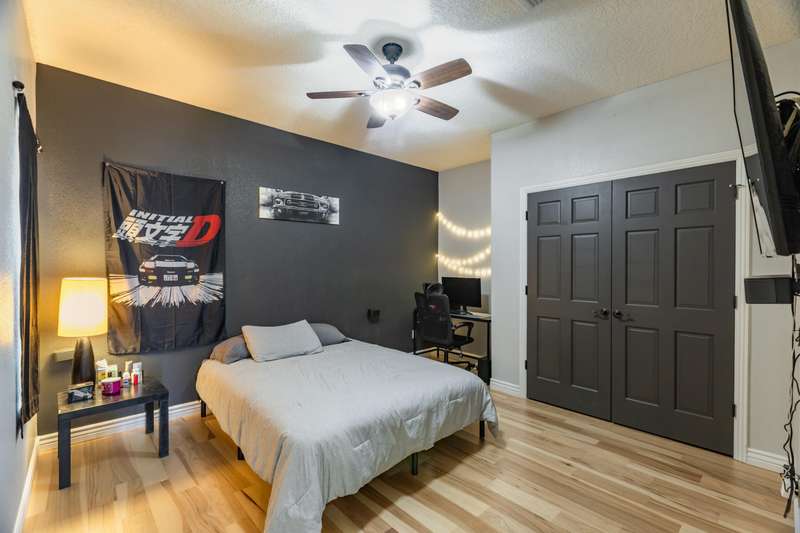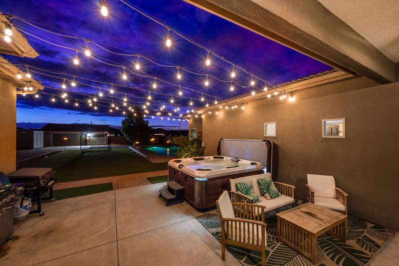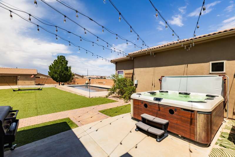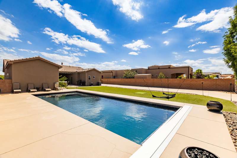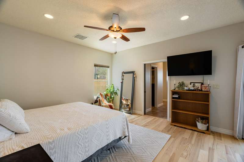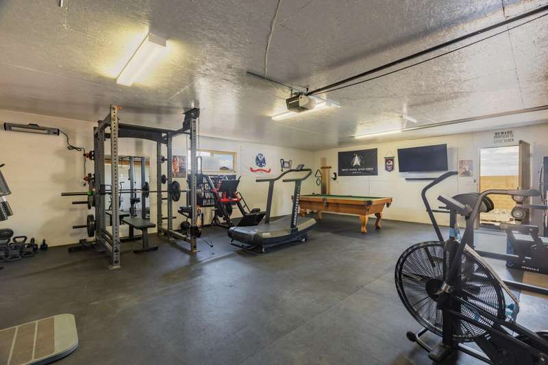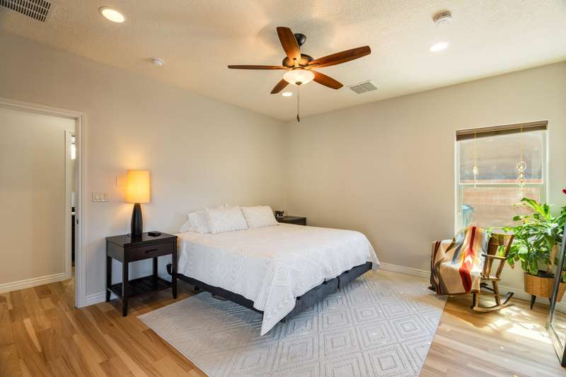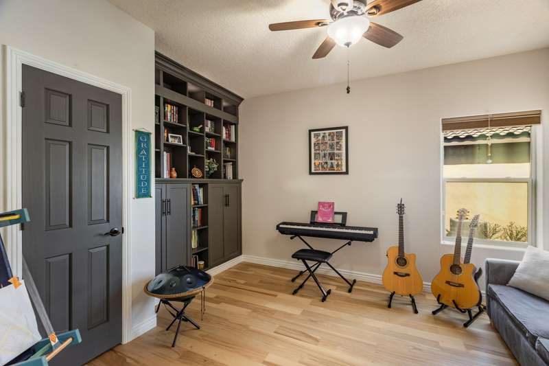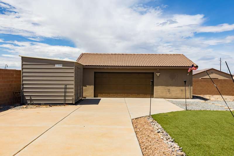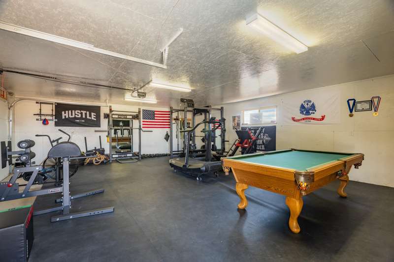 This amazing home will check some boxes! Mountain views! Single story! Total of 5/6 car garage with drive through option to the detached garage that could fit up to 3 cars). Backyard access! Pool! Hot tub! Wow! Enter to open great room, kitchen, dining concept w/great natural light & access to rear covered patio. Spectacular 3/4'' hardwood floors throughout except wet areas. Kitchen w/granite counters , gas stove, pantry & bar. Mountain views from dining rm. Custom blt-ins in office/flex space. Primary BR w/patio door to hot tub & pool. Two closets! Nice bath w/multi-head shower. Sue Cleveland High School, Mountain View Middle School & Sandia Vista Elem. Lovely home to live in and space to enjoy all your hobbies and fun!
