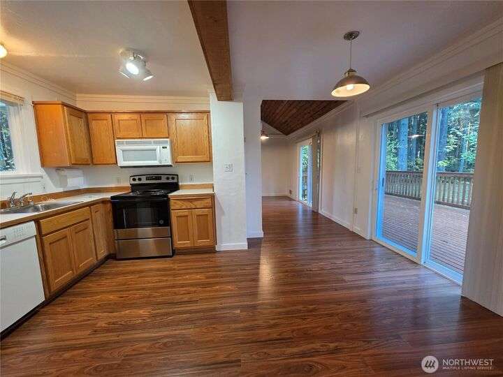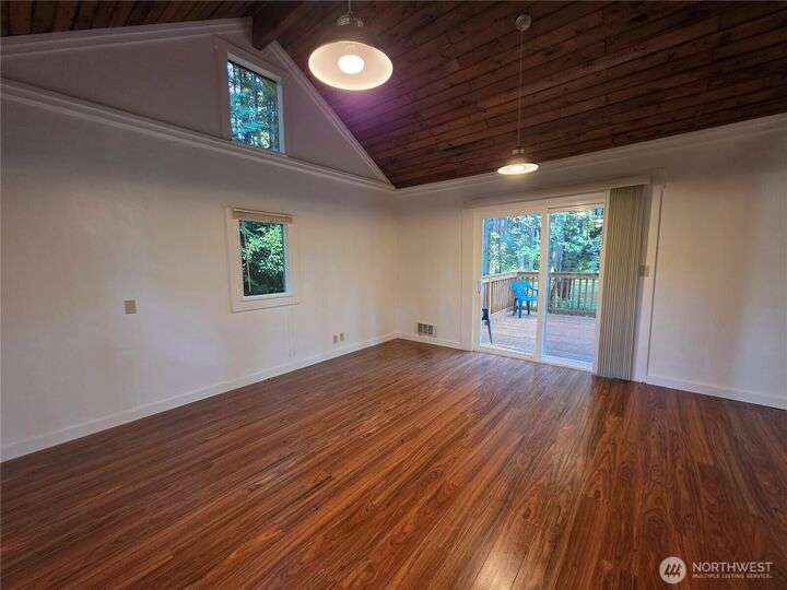 Charming studio cottage nestled in a tranquil, wooded setting! Vaulted wood ceilings, loft area, and abundant natural light create a warm, spacious feel. The open layout features durable hard flooring throughout, a full kitchen with plenty of counter space, and a large laundry room for added convenience. Relax in the full bath with soaking tub, or step through the sliding glass door to a huge deck perfect for entertaining or enjoying peaceful forest views. Come see this cozy retreat today.