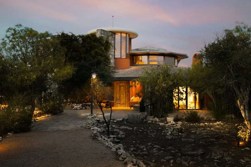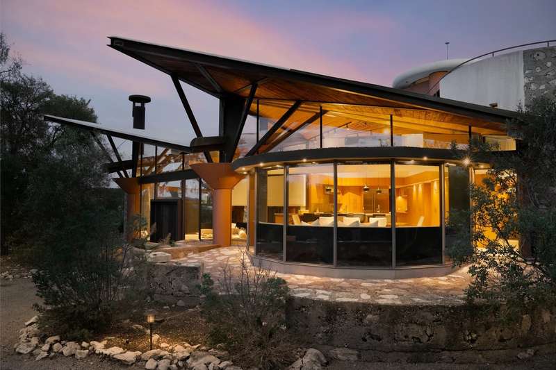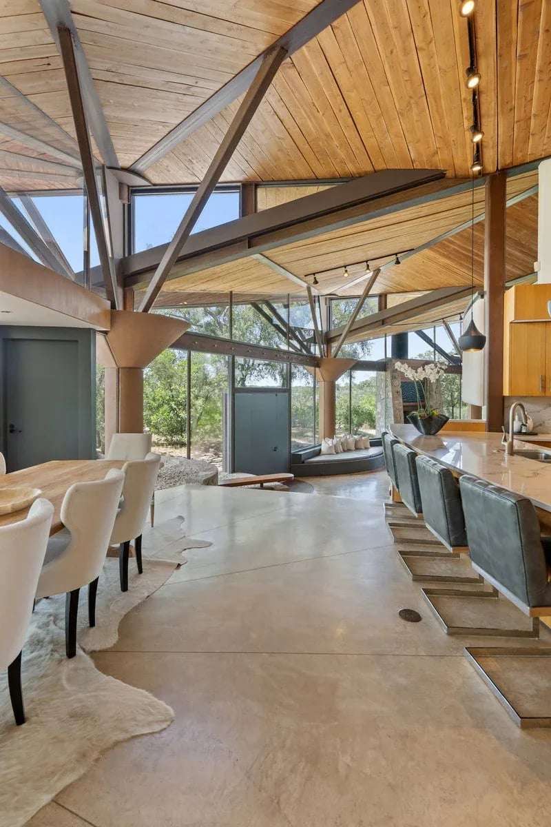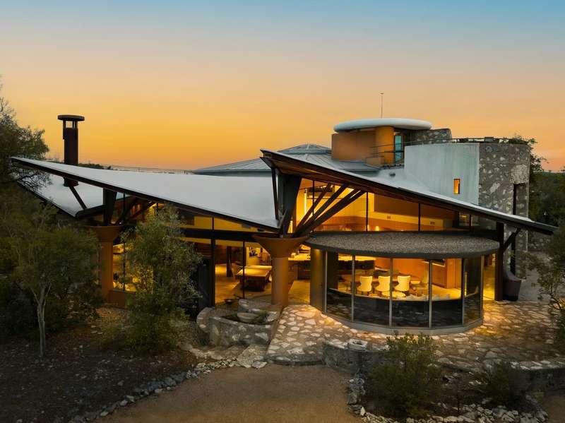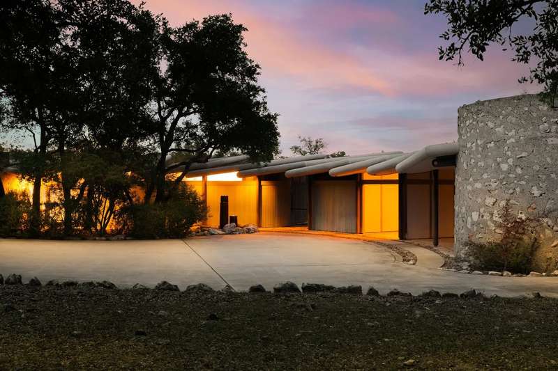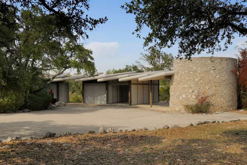 Once in a lifetime chance to own this culturally and architecturally significant home in the Hill Country, designed by John Covert Watson, an intern of Frank Lloyd Wright’s. Set on 30 stunning acres in Spicewood, The Retreat at Lick Creek Lodge is a one-of-a-kind compound offering the architecture lover the opportunity to be surrounded both by exquisite design and natural beauty. Defined by its hyperbolic parabola roof which resembles a splayed deck of cards, this home is striking inside and out. The roof creates a semi-circular motif that is repeated throughout the house, from the entry rotunda to the arching wall of glass that spans the living room and looks out to the tangle of nature enveloping the home.
