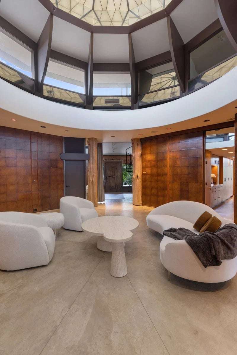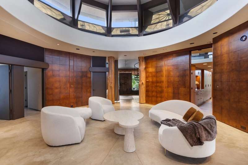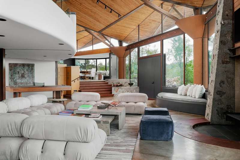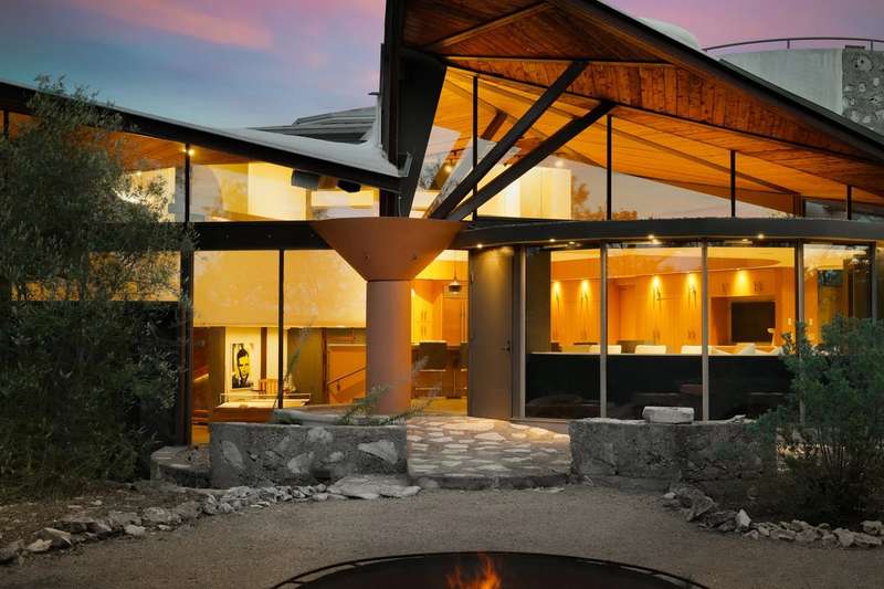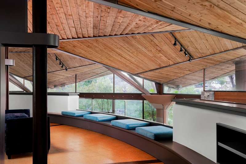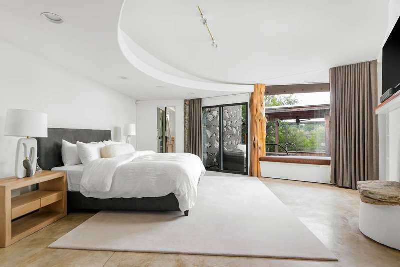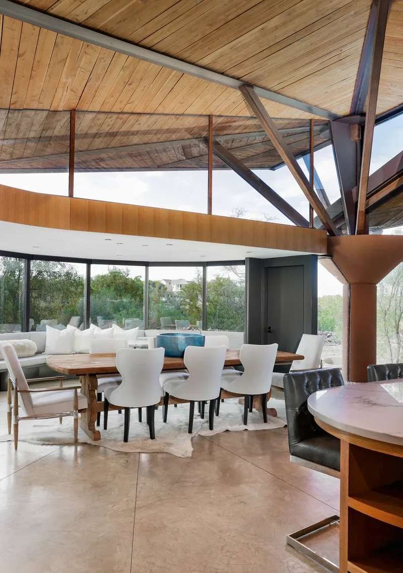 Once in a lifetime chance to own this culturally and architecturally significant home in the Hill Country, designed by John Covert Watson, an intern of Frank Lloyd Wright’s. Set on 30 stunning acres in Spicewood, The Retreat at Lick Creek Lodge is a one-of-a-kind compound offering the architecture lover the opportunity to be surrounded both by exquisite design and natural beauty. Defined by its hyperbolic parabola roof which resembles a splayed deck of cards, this home is striking inside and out. The roof creates a semi-circular motif that is repeated throughout the house, from the entry rotunda to the arching wall of glass that spans the living room and looks out to the tangle of nature enveloping the home.