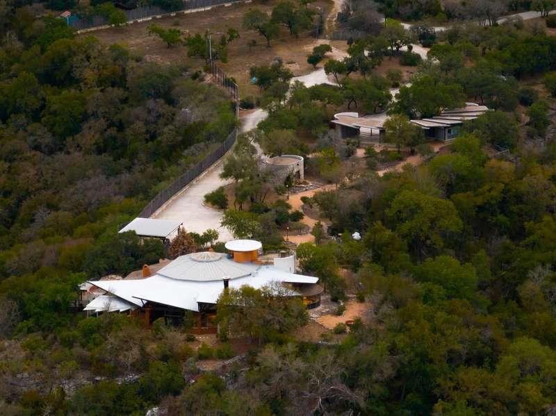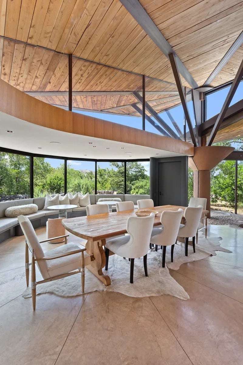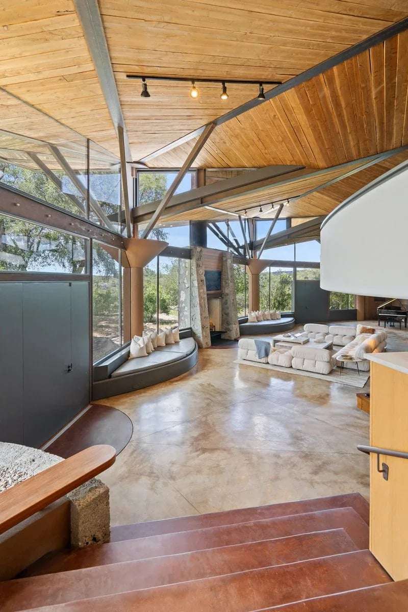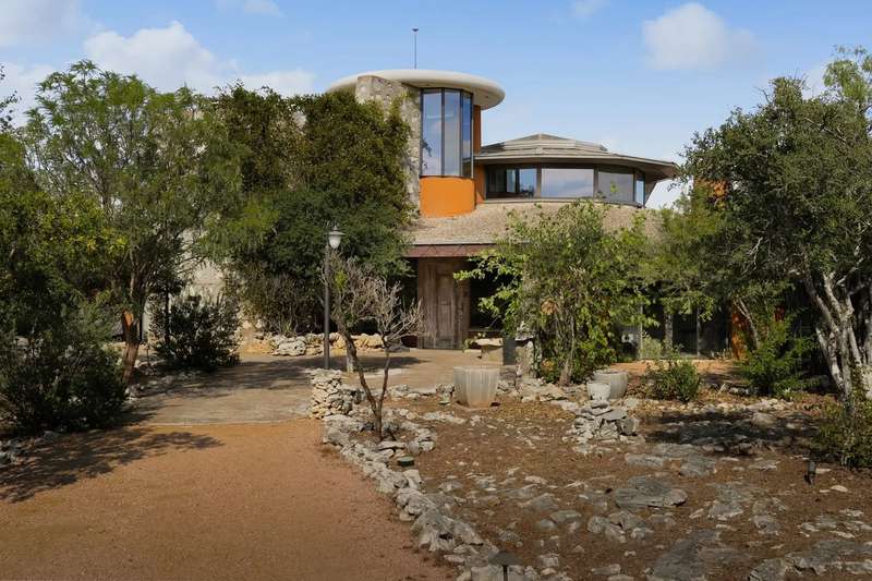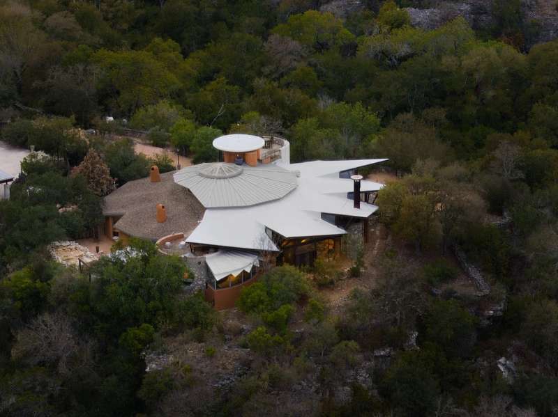 The interior is a celebration of the Texas Hill Country, making use of locally harvested cedar and nearby-quarried desert masonry contrasted with concrete, steel and glass. Cork floors plus rich oak and maple cabinetry add warmth and richness. An extraordinary entertaining space, the living room arches around a limestone fireplace and looks out over the rolling hills; it has hosted galas and concerts when not serving as a private retreat. The floorplan offers many unique hideaways, from a secret-door-accessed office to a serene meditation room.