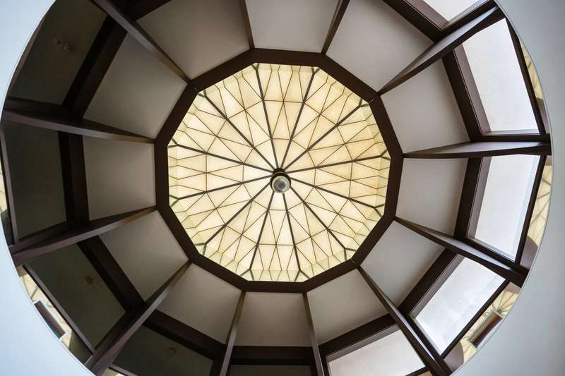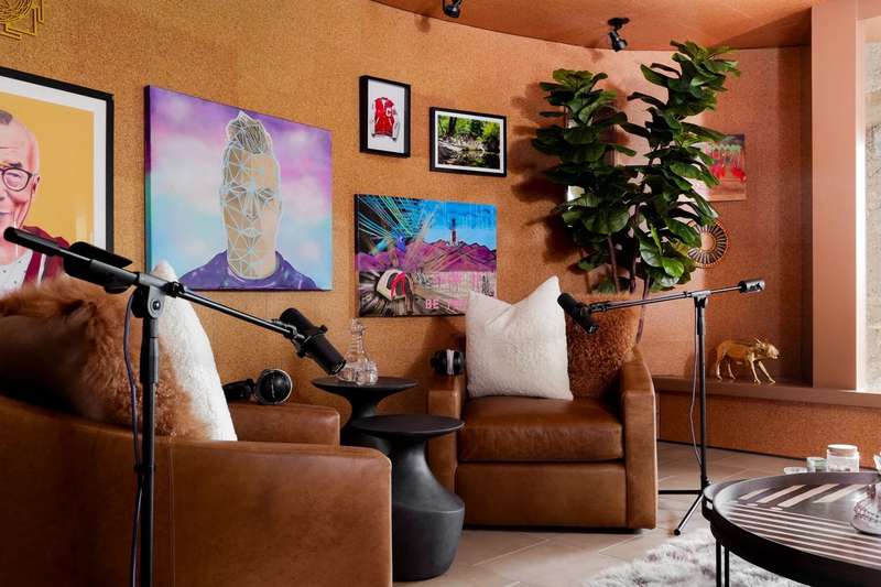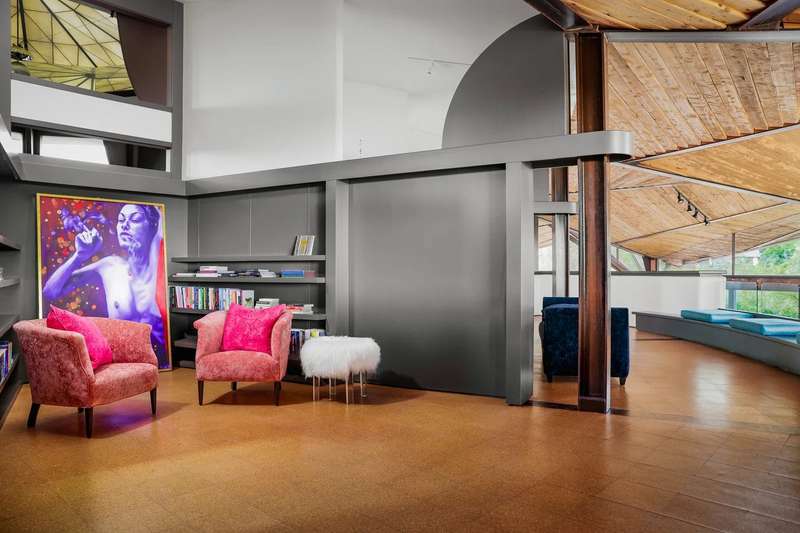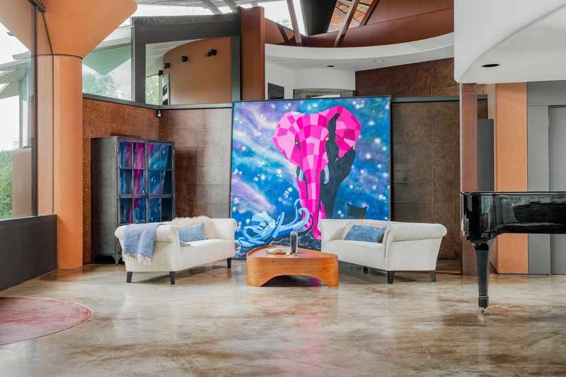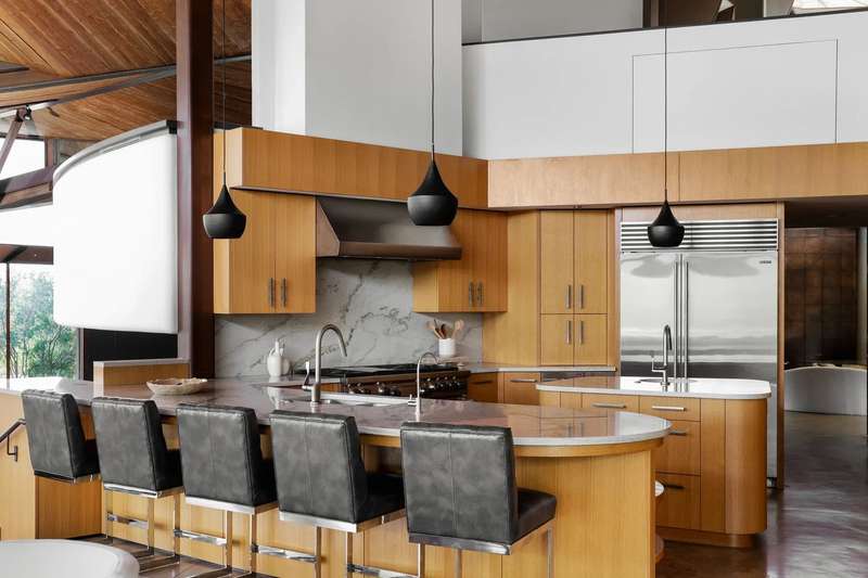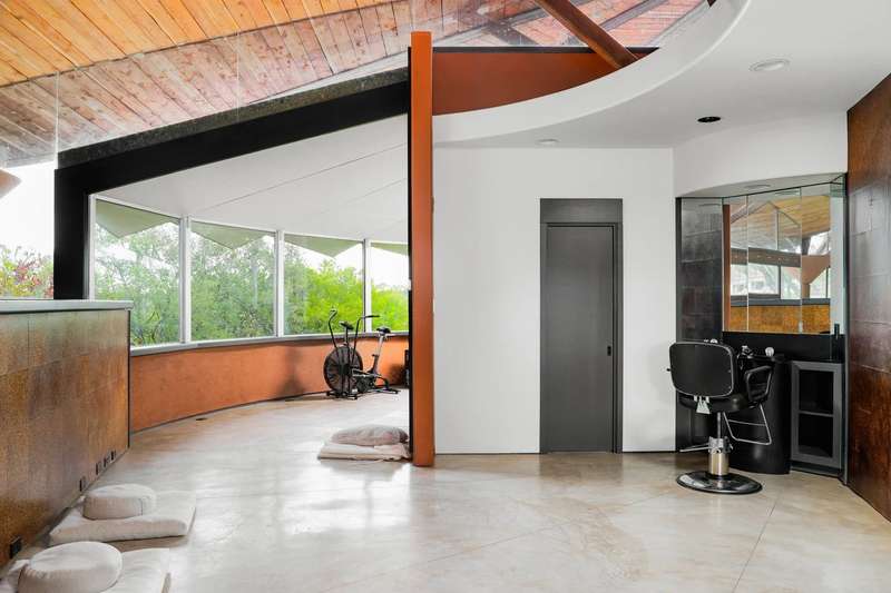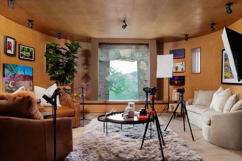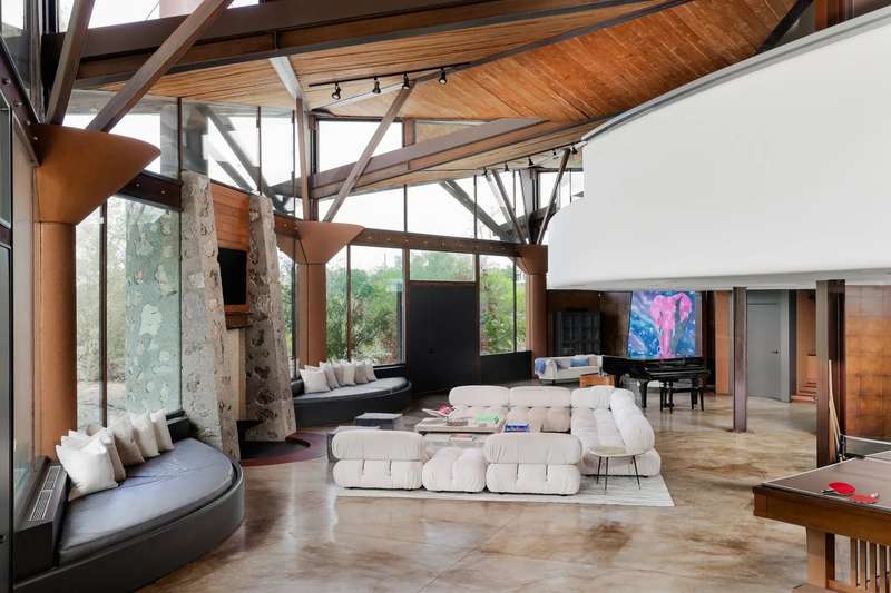 The interior is a celebration of the Texas Hill Country, making use of locally harvested cedar and nearby-quarried desert masonry contrasted with concrete, steel and glass. Cork floors plus rich oak and maple cabinetry add warmth and richness. An extraordinary entertaining space, the living room arches around a limestone fireplace and looks out over the rolling hills; it has hosted galas and concerts when not serving as a private retreat. The floorplan offers many unique hideaways, from a secret-door-accessed office to a serene meditation room.