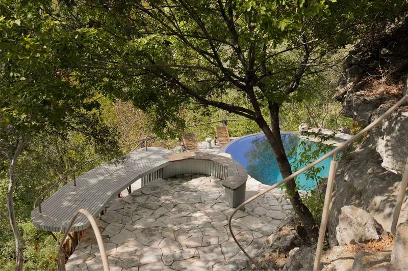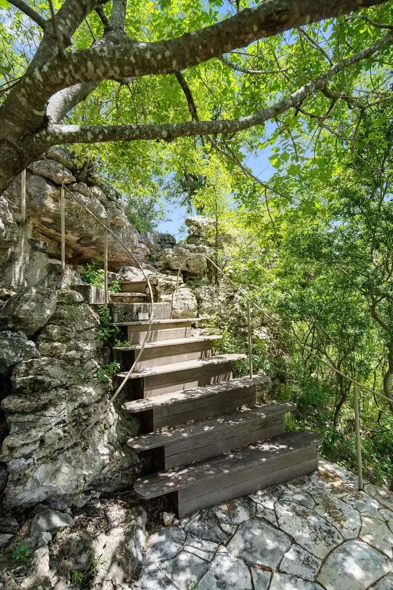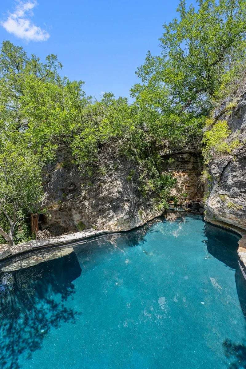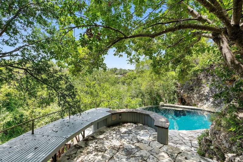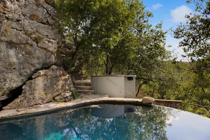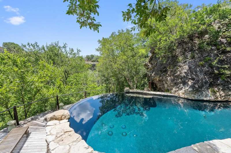 The 30-acre property is set on a cliff over the Pedernales river and overlooks steep ravines and miles of green hills. Step down the hillside to the grotto pool, half-hidden in a rocky crevasse, where you can swim as if you were on a desert island. The ultra-private compound includes a large guest house and office at the front of the property; you will wend your way along gravel paths and native landscaping to reach the main house.