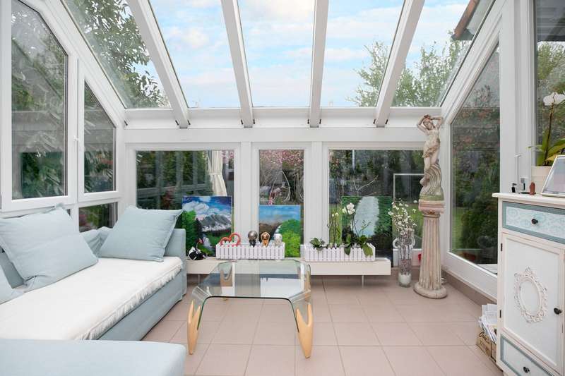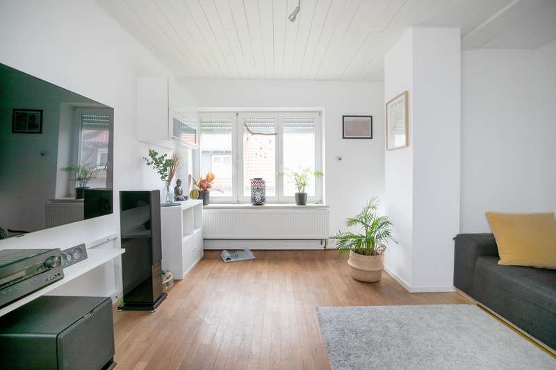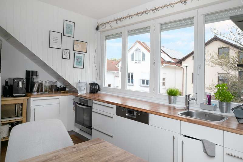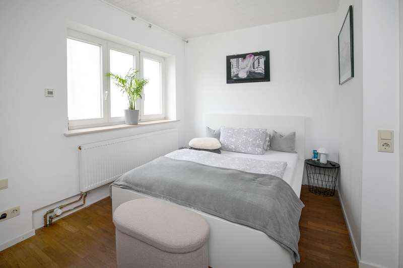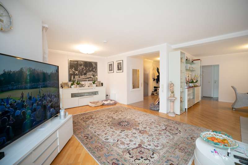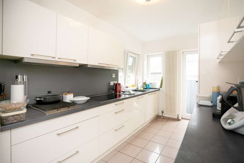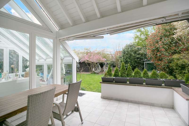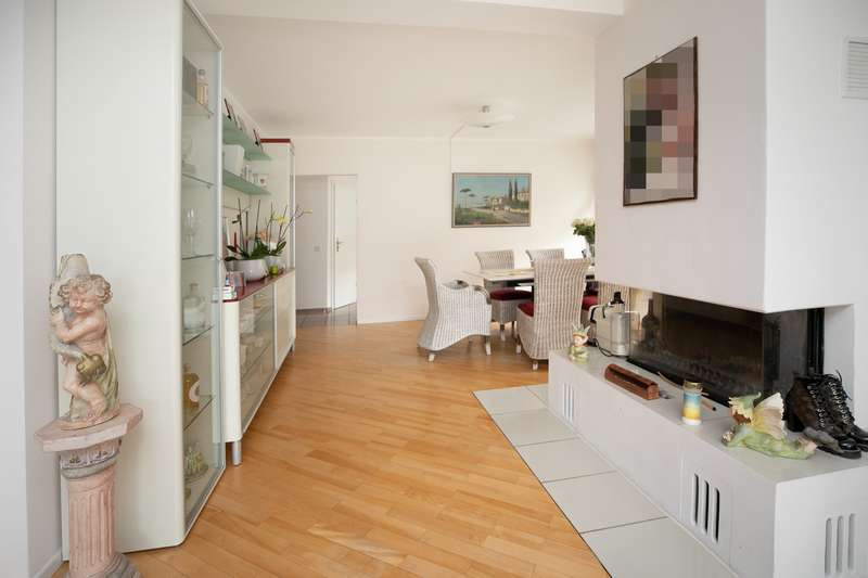 The well-maintained and ecologically planned property was built in a very quiet and family-friendly location. Many schools, kindergartens, the S-Bahn and a shopping center are within walking distance. There are also several doctors' surgeries, a pharmacy and a bakery within walking distance. The property is insulated on the outside and the basement has a "white tank". In addition, a solar and photovoltaic system was installed in 2012. The main energy source is district heating. All these energy-related advantages result in a classification in energy efficiency class "B" and thus also meet today's requirements for high-quality ecological construction. The house is currently used as a two-family home. The first floor is used for living and dining and the basement as a private living area with a large south-facing terrace. The first floor as a living/dining area has an entrance hall with guest WC and is equipped with a fitted kitchen and adjoining, very practical pantry. A fireplace between the living/dining area provides pleasant warmth in the colder months. The dining area leads to the heated conservatory and from the living area to the west-facing terrace and garden. There is also access to the terrace from the conservatory. Windows and casement windows can also be opened to ensure good ventilation. The basement is a private area with daylight windows, some floor-to-ceiling windows and three access points to its own south-facing terrace. There are 4 bedrooms and two bathrooms with bath and shower, one of which is en suite to one of the bedrooms. There is also separate access to the outside. This is ideal if you want to use the basement as a separate, self-contained unit, e.g. as an office or practice. Upstairs there is a maisonette comprising a kitchen, living room, two bedrooms, two bathrooms (one with a bath and one with a shower) and an attic studio with a large, loft-like room and a small storage room. From the living room and the larger "master"/bedroom you have access to the balcony. The extra-long garage right next to the house is divided into parking space and a separate room for a variety of uses. There are also three outdoor parking spaces. A garden shed with power supply provides ample storage space for garden maintenance. There is also a utility and storage room in the basement. We would be happy to provide you with more information about this well-kept and versatile property with a contemporary, energy-efficient standard: Living and renting, living and working or as a multi-generational home.