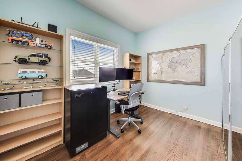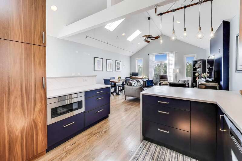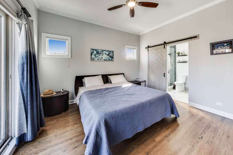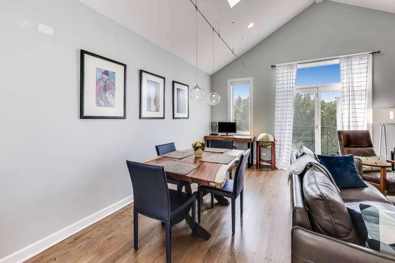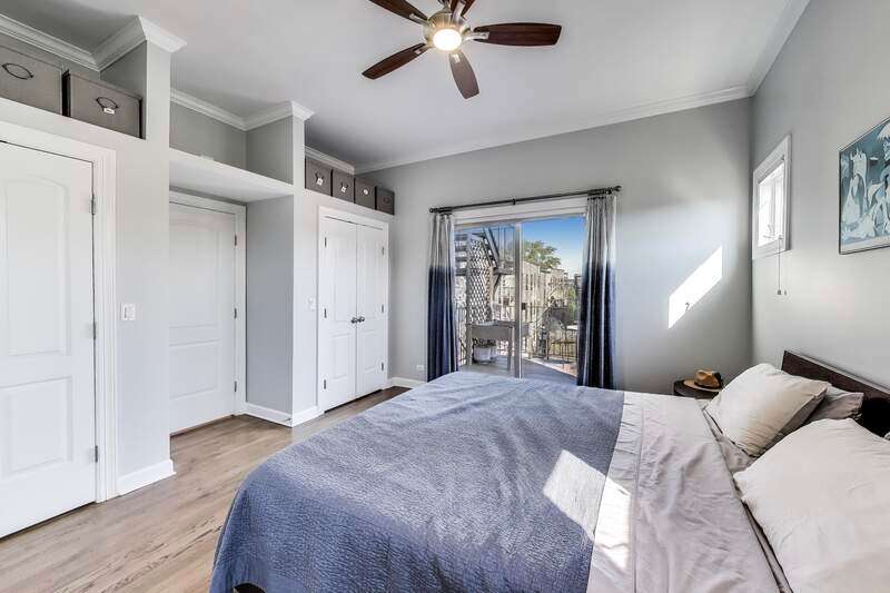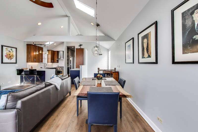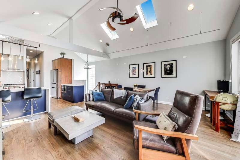 Stunning 2 bedroom, 2 bath Penthouse in brick 3 flat with private roof deck on beautiful tree-lined street in Wrigleyville/ Lakeview! This sun- drenced condo features soaring 14 foot vaulted ceilings with skylights in the living room, dining room and kitchen and 10 foot ceilings throughout the rest of the unit. Beautiful gut rehabbed kitchen with peninsula seating, quartz counters, custom cabinets and high end appliances. Stylish gut rehabbed hall and primary baths. Additional amenities include, juliette balcony, hardwood floors throughout, wood burning fireplace with gas starter (behind the tv), prof. organized closets, addl. storage, garage parking and large rear deck leading to awesome private rooftop deck with 360 degree unobstructed views of the City, Skyline and Wrigley Field. Fantastic location, walk to Wrigley Field, Southport Corridor restaurants, shops, entertainment and both Red and Brown line "L" stops.