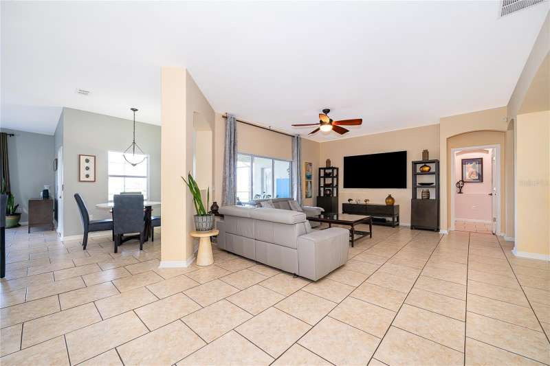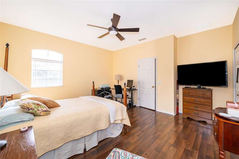 Are you looking for the perfect family home in a prime location? Look no further welcome home! This stunning 3,600-square-foot residence combines elegance and comfort with beautiful hardwood and tile floors throughout. The primary suite, located on the main floor, offers serene lake views and a luxurious ensuite with double vanities topped with marble, a soaking tub, and a separate shower. Also on the main floor, you'll find an additional bedroom with its own full bathroom perfect for guests or multigenerational living. Upstairs, there's plenty of space for everyone. A spacious loft with wood floors offers an additional living area. You'll also find four generously sized bedrooms, each with large closets, along with two well-appointed bathrooms to ensure comfort and privacy for both family and guests. The kitchen is a true showstopper with granite countertops, with brand-new appliances. Additional this home includes a newer roof, hot water heater, and AC system, as well as a three-car garage and an extended covered lanai perfect for entertaining where you can relax and enjoy breathtaking lake views and vibrant sunsets.