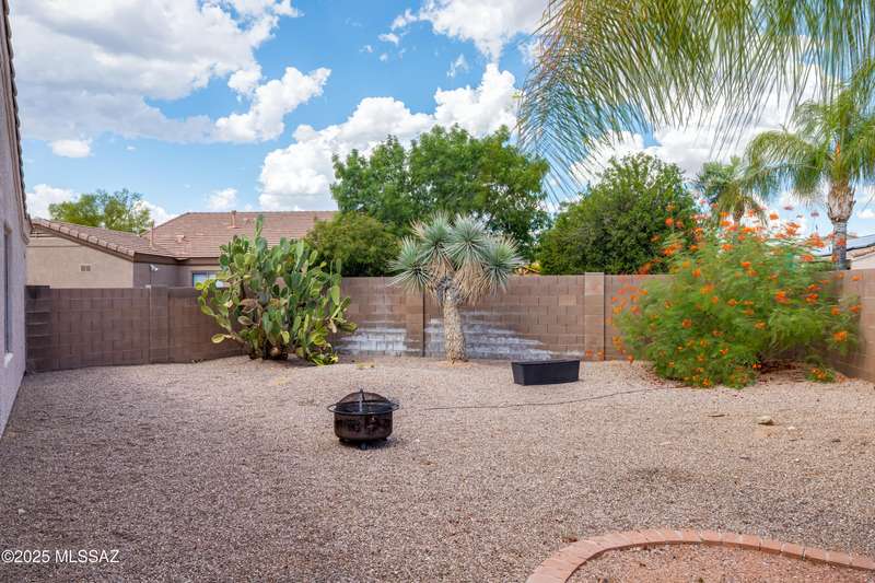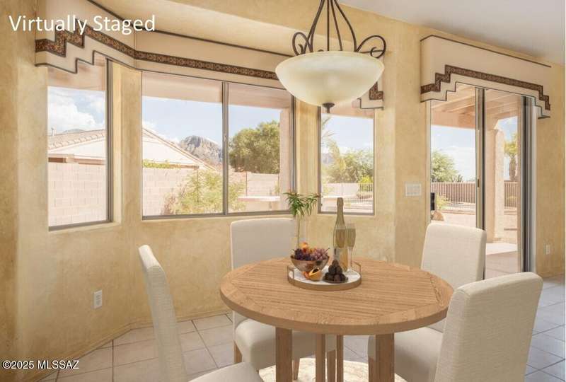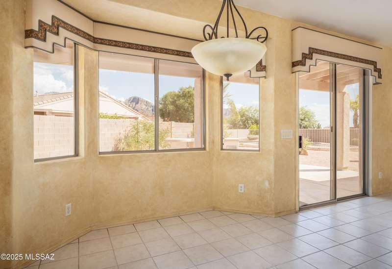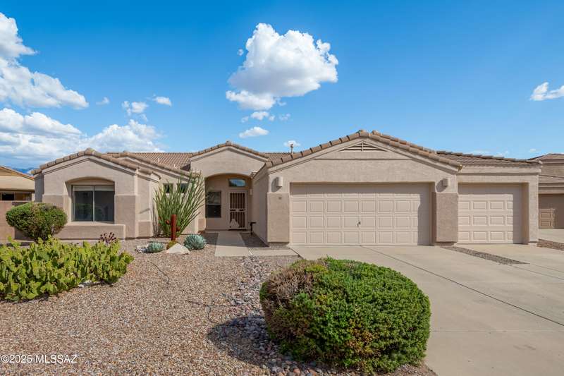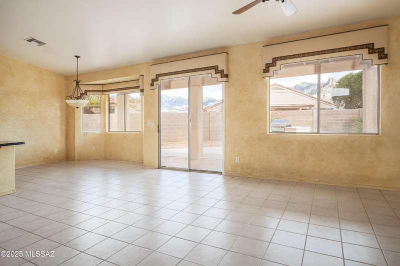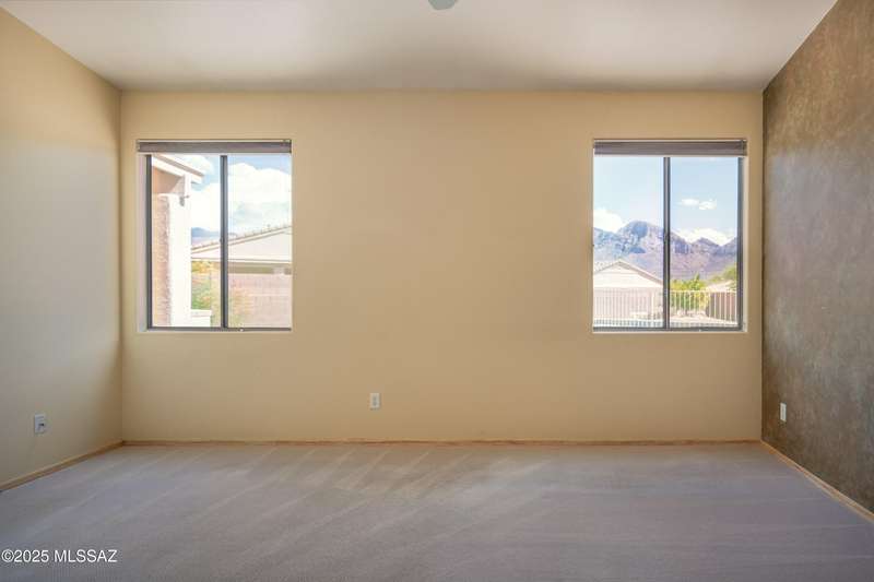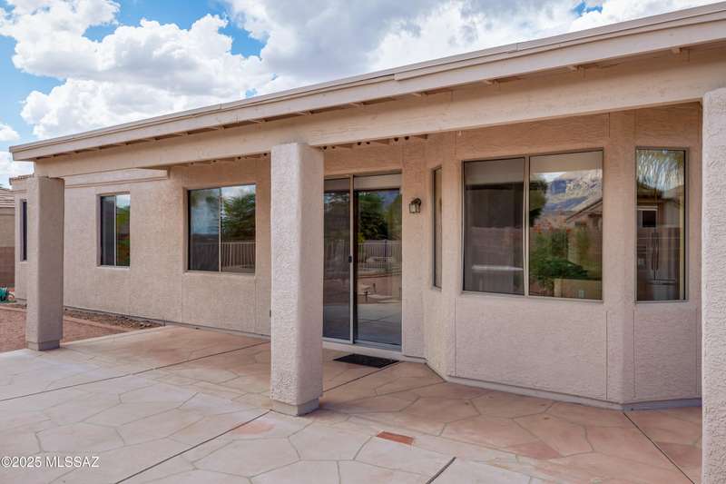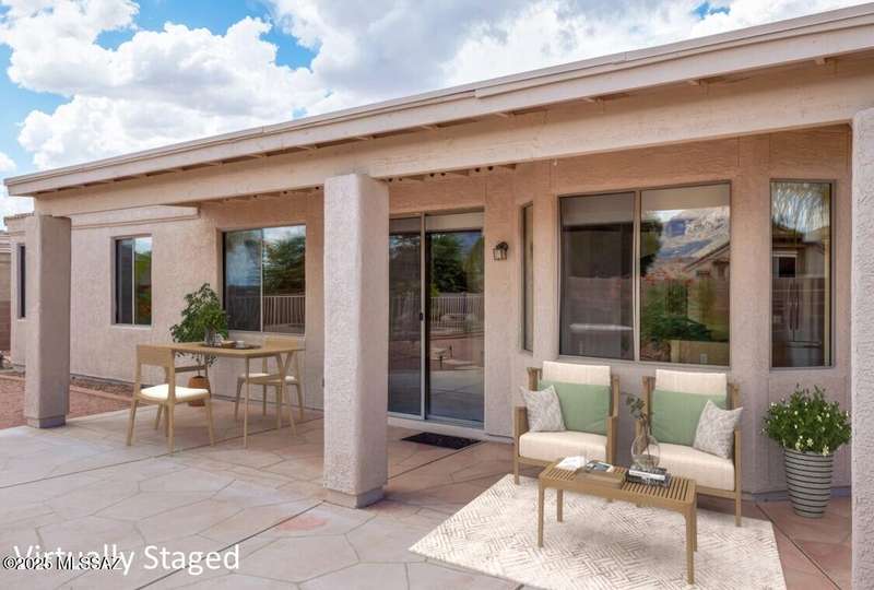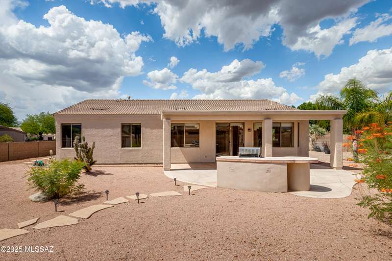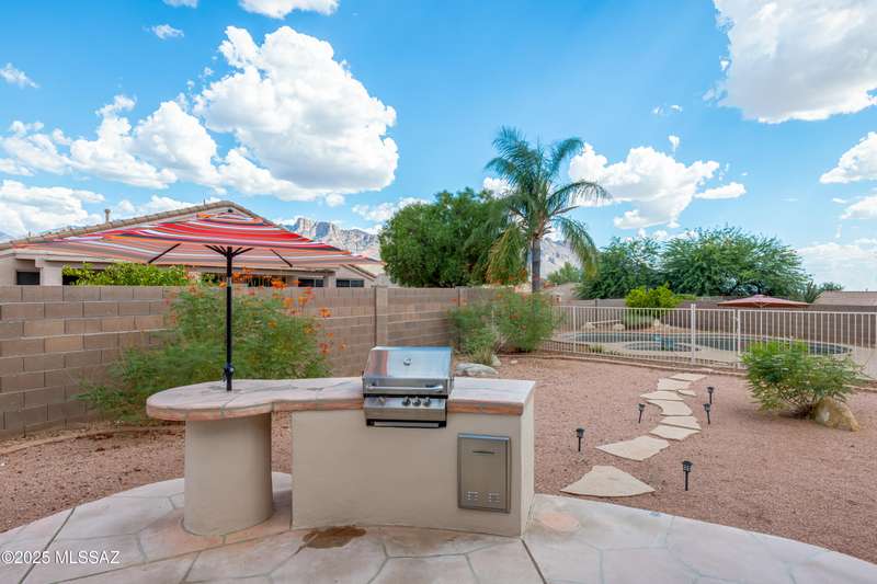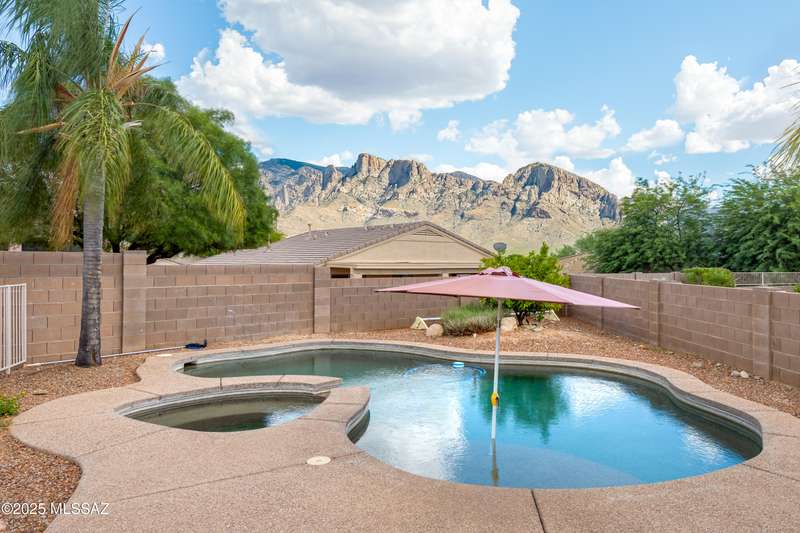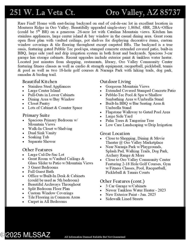 Rare Find! Home with east-facing backyard on end of cul-de-sac lot in excellent location in Monterra Ridge in Oro Valley. Beautifully upgraded single-story 1,868sf, 4BR, 2BA+Office (could be 5th BR) on a generous .26-acre lot with Catalina Mountain views. Kitchen has stainless appliances, large center island & bay window in the casual dining area. Great room open floor plan with vaulted ceilings, pot shelves for displaying decorative items, custom window coverings & tile flooring throughout except carpeted BRs. The backyard is a true oasis, featuring gated Pebble Tec pool/spa, stamped concrete extended covered patio, built-in BBQ, large side yard and drip irrigation system in both front and backyards. Spacious 3-car garage has storage cabinets.