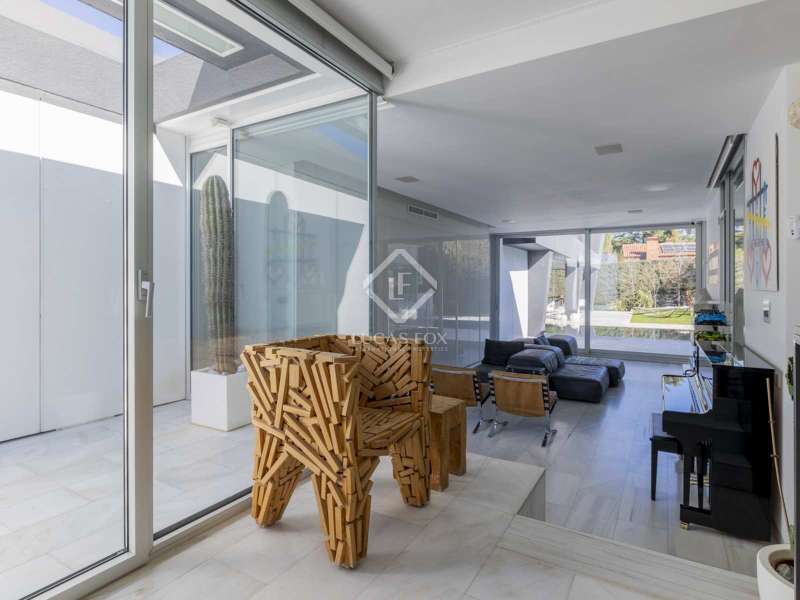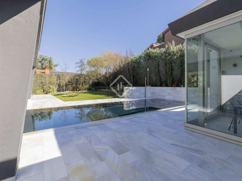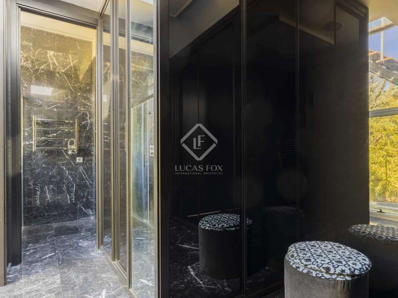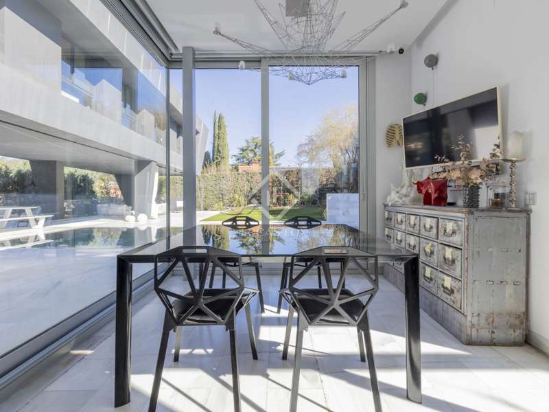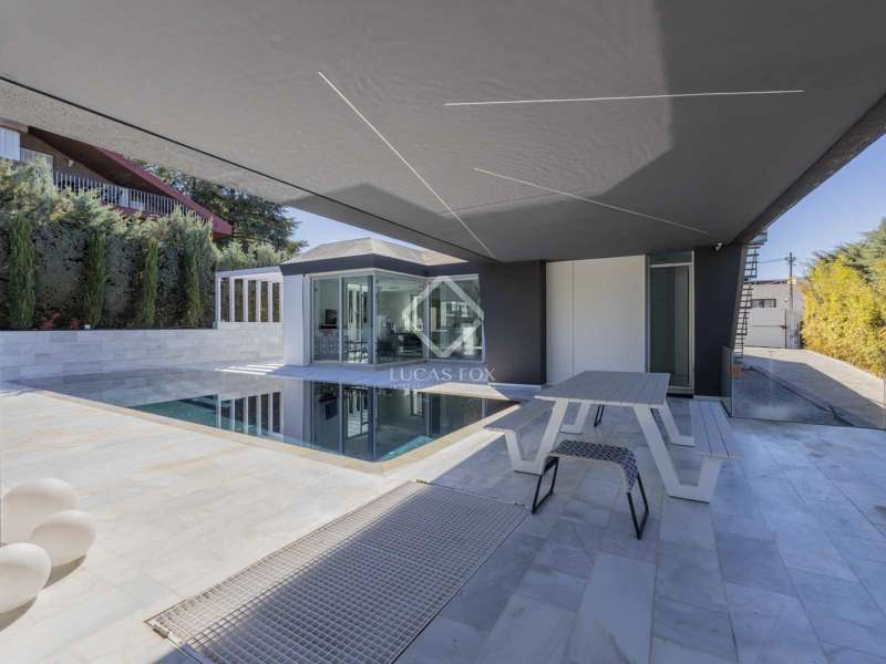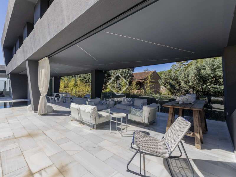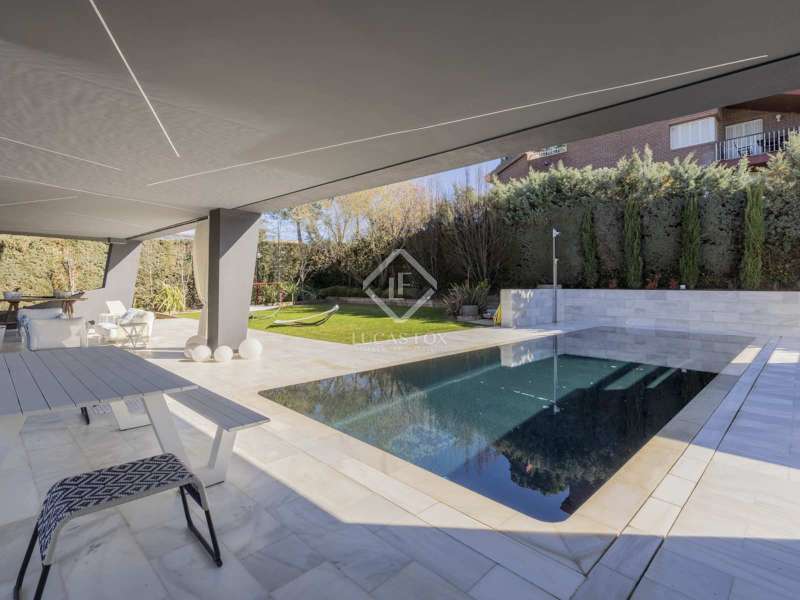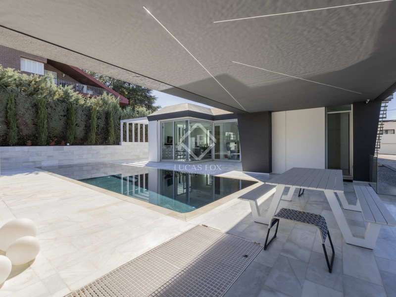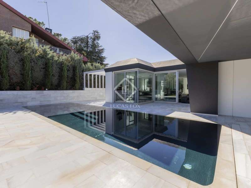 Lucas Fox is proud to present this incredibly designed house in the Parque Boadilla development . It has an area of 420 m² on a 1000 m² plot that stands out for its comfort, natural light and tranquility. The discreet-looking property goes almost unnoticed from the street, but upon entering the plot its uniqueness is perceived. The ground floor offers lots of light and the spacious living room has fantastic views of the main garden and pool. On this floor there is a toilet, a comfortable kitchen with a dining room , an study and the main bedroom, with a huge dressing room and a private bathroom. Both the dressing room and the bathroom are covered in elegant black marble and have access from different ends to guarantee privacy and rest. The ground floor stands out for its large maximum security windows, which allow in abundant natural light and offer beautiful views. In addition, we can access the exterior from practically any point: the kitchen, the living room or the bedroom. The upper floor is intended exclusively for rest. Here, there is a large secondary bedroom with its own bathroom . In addition, three other large and bright bedrooms are offered that share a bathroom. Both bathrooms enjoy the same finishes as the main bedroom. It is worth mentioning that this area also has an armored access door for greater security and tranquility. In front of the bedroom area, taking advantage of the ground floor deck, we will enjoy a roof terrace that offers us 360º views of the surroundings. Finally, under the main porch, guided by the access ramp from the entrance, we will reach the independent garage with capacity for four large cars. The staff bedroom is also located here, which has its own bathroom and the washing and ironing area. The exterior is truly exceptional and accessible from any point in the house. It offers a completely private garden protected by vegetation, both its own and the surrounding areas , and is divided into several areas. It is worth highlighting the porch, which offers a large surface that protects us from the elements and offers comfortable shade to enjoy the exterior at any time of the summer, with direct access to the pool, a grass area ideal for sunbathing, playing or simply rest. On the side, there is a paved area, also covered with marble; An ideal space for the exterior dining room or play area, among others. In the quality section, the property has marble floors, security windows, armored access doors, high-tech security system, home automation control system that includes lighting, air conditioning and even blinds. As for air conditioning, it has ducted ducted air conditioning, underfloor heating powered by mains gas and solar thermal panels for the production of domestic hot water. It has an exclusive design decoration and high quality materials and, above all, high durability. It is, in short, a house with an avant-garde design, where even the smallest detail is designed with the clear idea that the interior and exterior can be enjoyed equally at any time of the year. A home that combines convenience and comfort with a privileged location a few minutes walk from St. Michael's school, the Cortijo Sur shopping centre and the social club of the Parque Boadilla development . The property can be visited easily. Contact Lucas Fox today by phone or email to arrange a viewing. We work 7 days a week to be able to adapt to the needs of our clients. In addition, you can also visit us at our Lucas Fox lounge that we have just opened on Avenida de Europa, 38 in Pozuelo for a cup of coffee so that we can analyze your requirements in more detail and thus help you find your perfect home or investment.