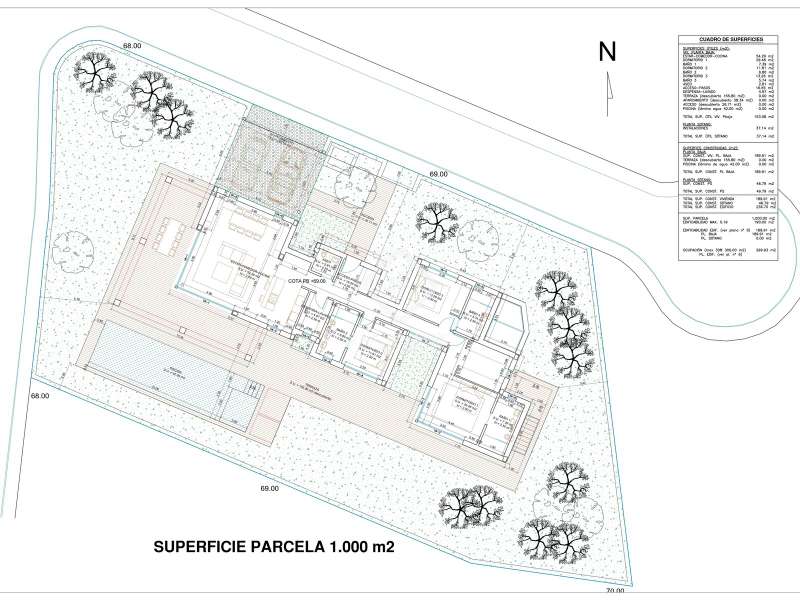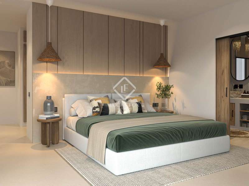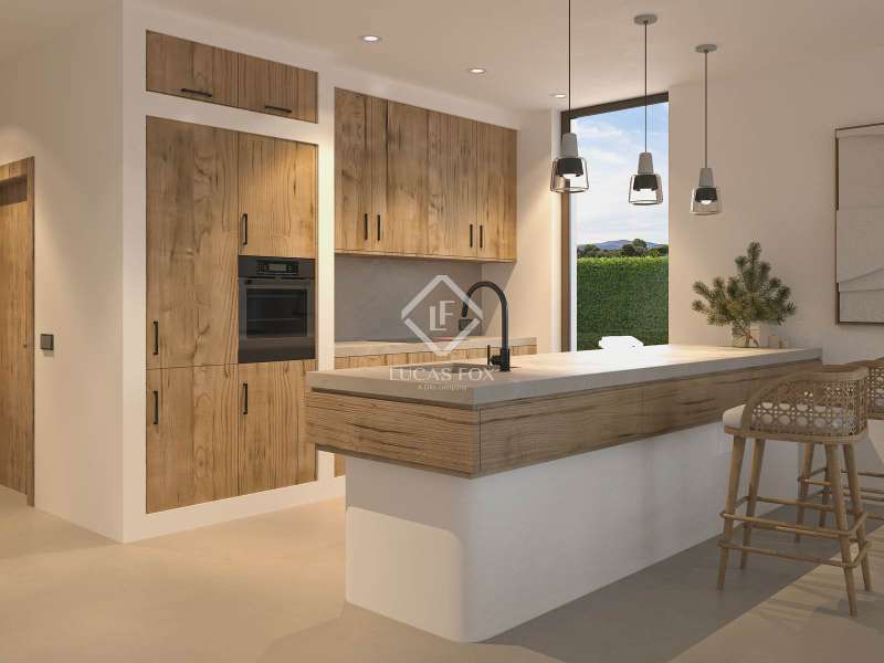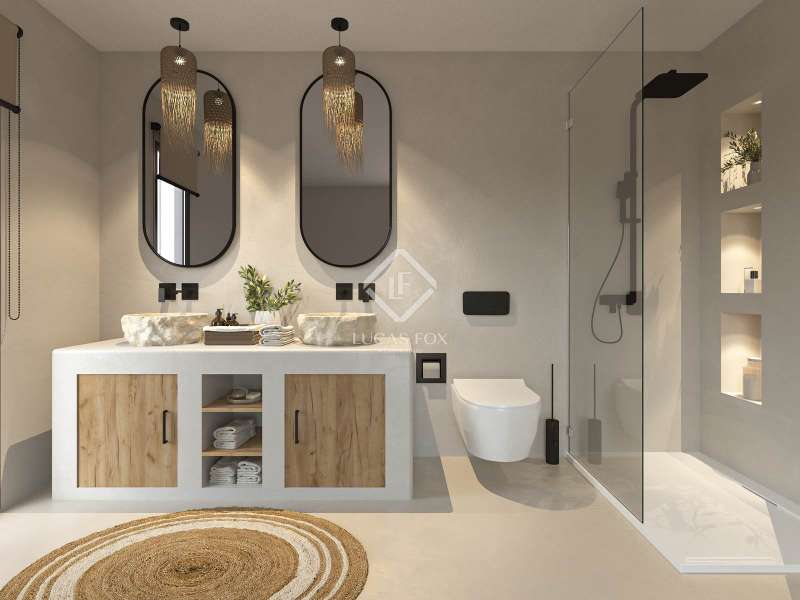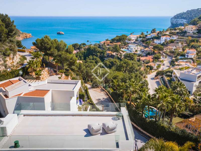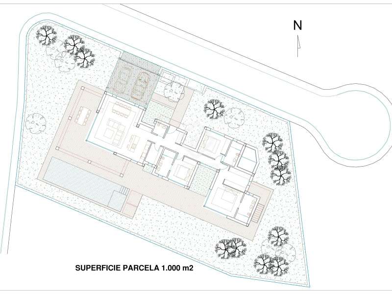 With a white facade and rounded corners, enhanced by the natural beauty of hand-cut Montgó stones with red reflections. Its Mediterranean design invites contemplation and enjoyment of each space, where micro-cement in the bathrooms and throughout the interior flooring, complemented by rust-coloured double-glazed aluminium windows, come together to create an atmosphere of luxury and comfort. The rooms feature exterior electric shutters and the bathrooms have black fittings, adding a modern and elegant touch. The villa features a large living-dining room open to a fully equipped kitchen, providing direct access to the outdoor pool and its sunny south-facing terraces. It also has an adjacent laundry room and a guest toilet. On the sleeping side, there are four double bedrooms, each with its own in-suite bathroom. The house will be equipped with underfloor heating and ducted air conditioning. It will have two parking spaces under a carport, as well as a 37 m2 storage space planned under the house. Outside, the 42 m2 pool, with a shallow area called beach, is ideal for relaxing and enjoying the sun. It is surrounded by 155 m2 of terrace, including a part covered under a beautiful pergola, perfect for your family dinners all year round and for enjoying the mild and sunny weather that Javea has to offer. The villa offers breath-taking views of the surrounding green mountains and of Montgó Mountain, a symbol of Javea.