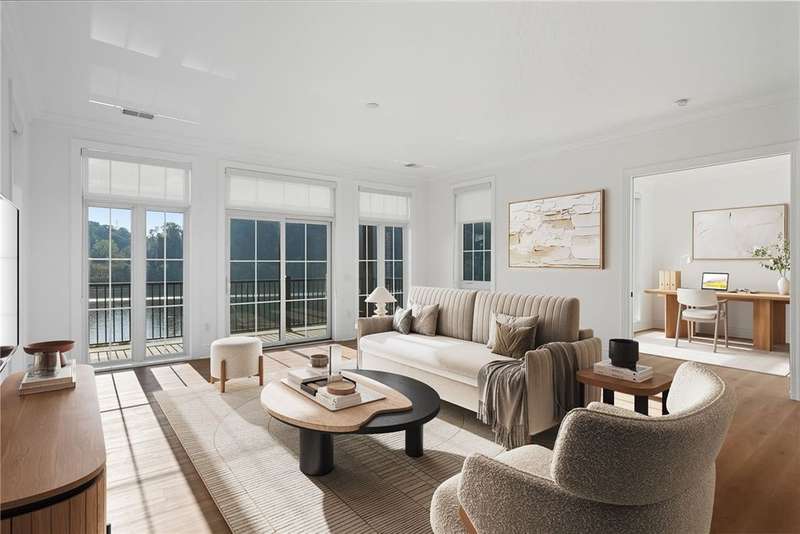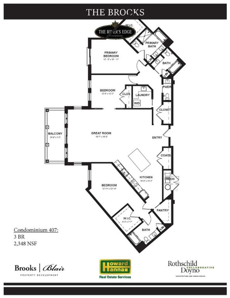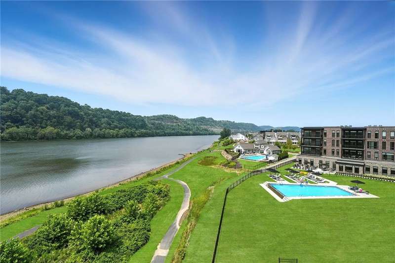 Discover The Brooks, a new resort-style condominium building along the Allegheny River within The River's Edge community. The Brooks promises an unmatched living experience with breathtaking views. This 4th floor unit, spanning 2,348 sq ft, is centrally located withing the building, offering convenient access to all amenities. Floor-to-ceiling windows flood the expansive living, dining, and kitchen areas with natural light in this expansive penthouse unit. 10-foot ceilings provide a luxurious, airy atmosphere. Step out onto the covered balcony to enjoy peaceful waterfront mornings or vibrant sunsets. Ideal for entertaining and everyday living, the open kitchen features a large island, stainless appliances and pantry. In addition to 3 bedrooms, this floorplan features a dedicated laundry room, a powder room and large hall closets. Amenities include the stylish lobby w fireplace, fitness center, infinity pool, & event rooms. One indoor garage space and a private garage included.