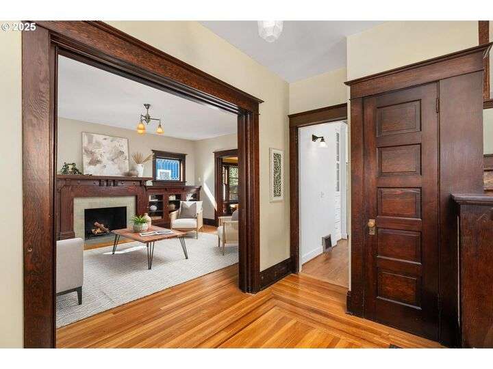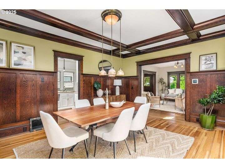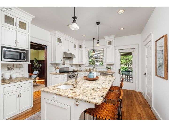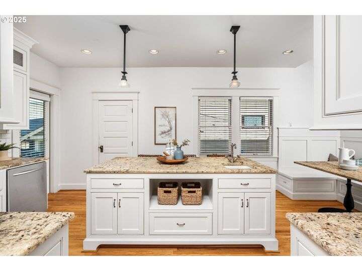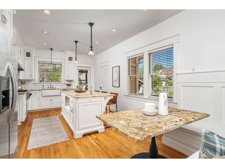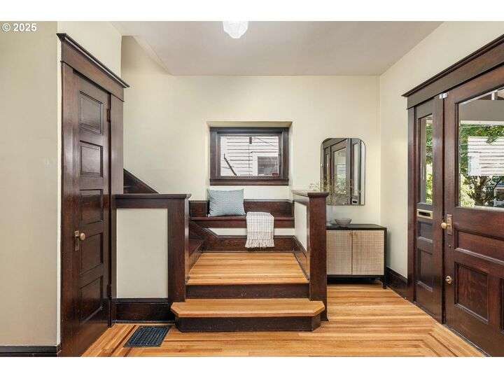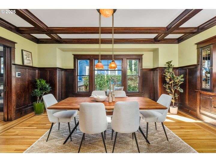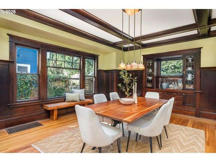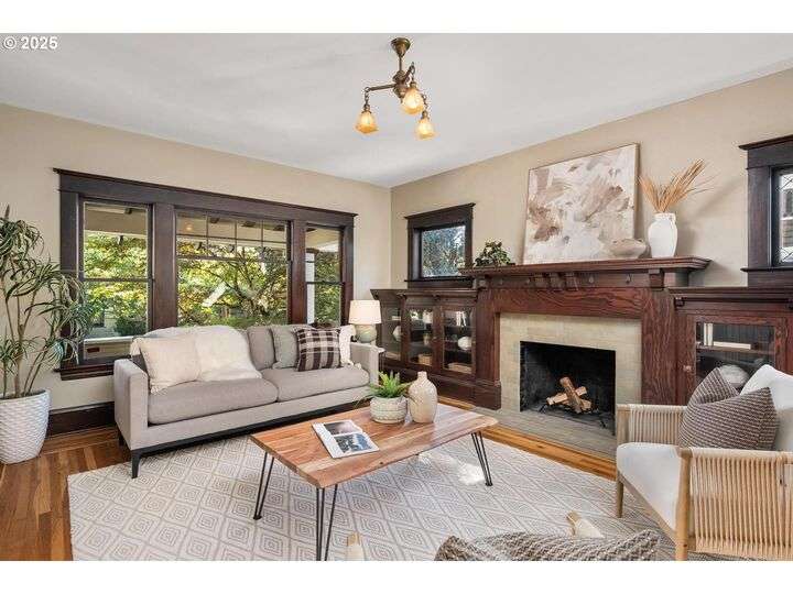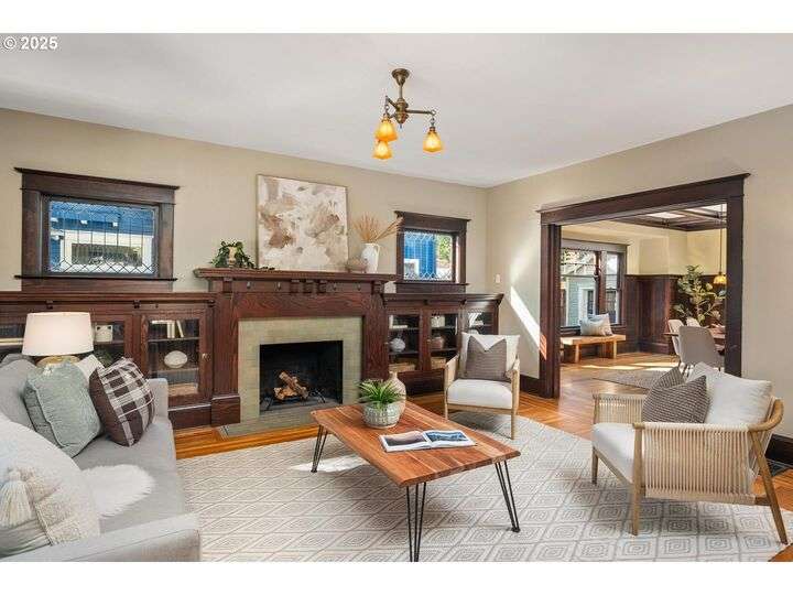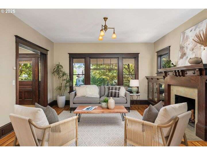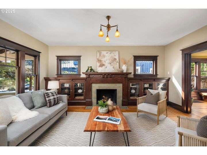 1911 Irvington Grande Dame! Don't miss this soaring four story craftsman on one of Irvington's most cherished streets. Incredible architecture blends seamlessly with tasteful updates across 3600 square feet. The main floor features stunning millwork and casework coupled with oak hardwoods, designer colors and an amazing gourmet kitchen. Custom inset cabinetry, an expansive island, an eat-in nook with built-in bench seating, Rejuvenation lighting and a gorgeous appliance package highlight the kitchen which offers the perfect flow patterns to the backyard, main floor powder room, dining room, basement and foyer. The second floor is home to the highly sought after 3 bedroom and 2 bathroom layout. A primary suite with walk-in closet anchors the east wing, while two bedrooms and a Jack and Jill bathroom balance out the west end. Refinished fir floors, new Benjamin Moore paint and an upstairs washer/dryer closet also highlight this level. A magical third floor with stunning vaulted ceilings, an expansive bonus room and bedroom tops off the above grade spaces which make up over 2500 square feet. Moving back downstairs you will find a gorgeous, finished basement with open family room, gym/bonus area and additional office or flex space. A third full bathroom, second refrigerator, second fireplace and storage closet round out the almost 1000 square foot lower floor. Gorgeous grounds, a detached garage with updated storage and an address located with the Grant High School catchment area and just blocks to Lower Fremont Shops, Whole Foods and Irving Park make this a noteworthy property in one of Portland's most historic communities.