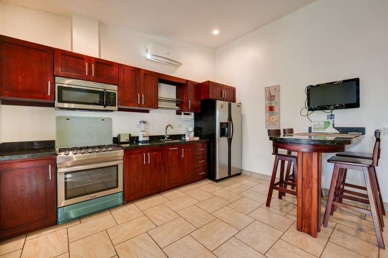 There are two units with two bedrooms and one bathroom each and one unit with one bedroom and one bathroom. All apartments include private covered verandas overlooking a lush tropical garden and pool.