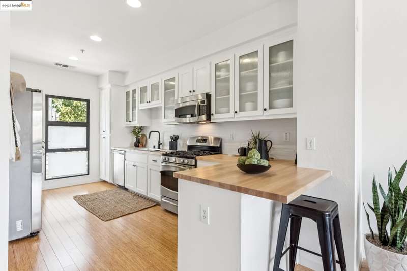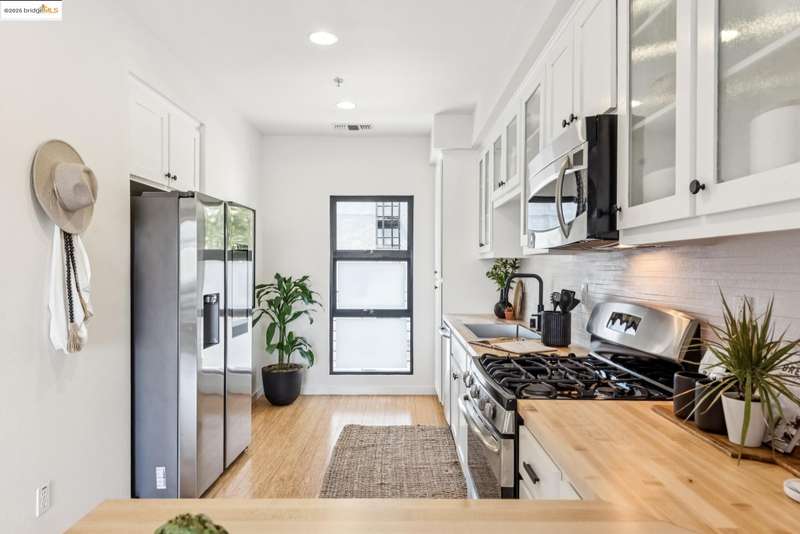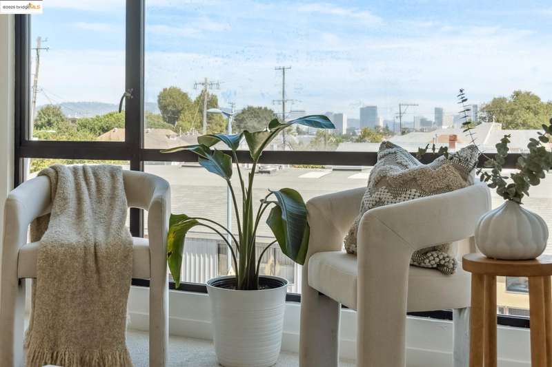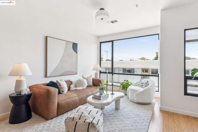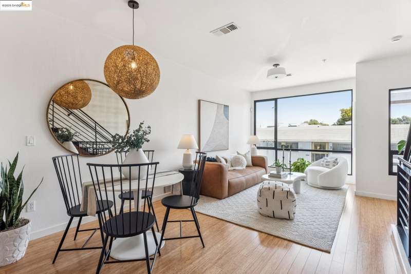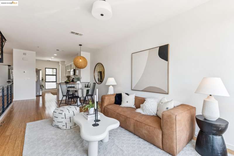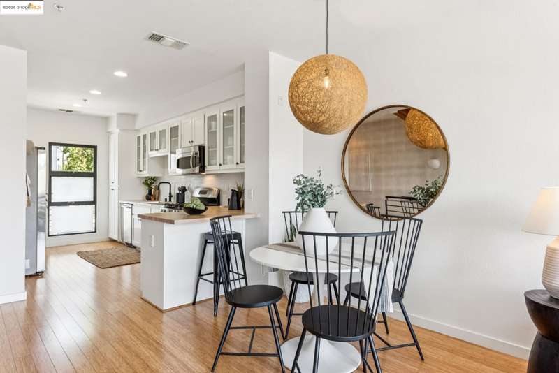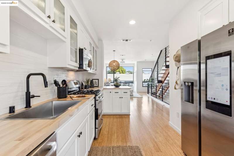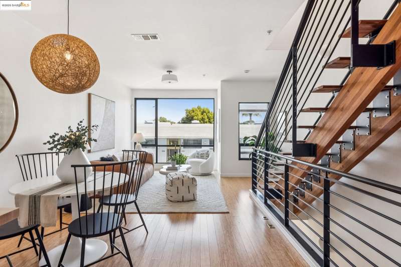 Stylish W Oakland townhome style condo residing in the Zephyr Gate community of Oakland’s Prescott neighborhood blends smart design with modern comfort. Step up to the welcoming open concept 2nd floor, where high ceilings, crisp white finishes & warm bamboo flooring elevate the bright interconnected living & dining areas. Whether you're hosting a celebration or unwinding in seclusion, you'll enjoy the practical yet refined kitchen space complete with butcher block countertops, glass-inlaid cabinets, sophisticated backsplash & a suite of stainless-steel appliances. Retreat to the top floor, where two private en suite bedrooms provide privacy & the spacious primary suite offers captivating cityscape views. Attached 2-car tandem garage has interior access for added convenience while seamlessly merging with the clean, contemporary feel of the complex. Just blocks from Raimondi Park, where you can catch the Oakland Ballers. Enjoy the Prescott Night Market with food vendors & live entertainment, West Oakland Farmers' Market, Live Music Fridays, trivia night, movement/mobility classes & more. Close to W Oakland BART with easy access to I-880, I-80, I-580 & CA 24 to explore Alameda’s coastline, downtown Oakland scene, or the vibrant diversions of SF. Start your next chapter right here!
