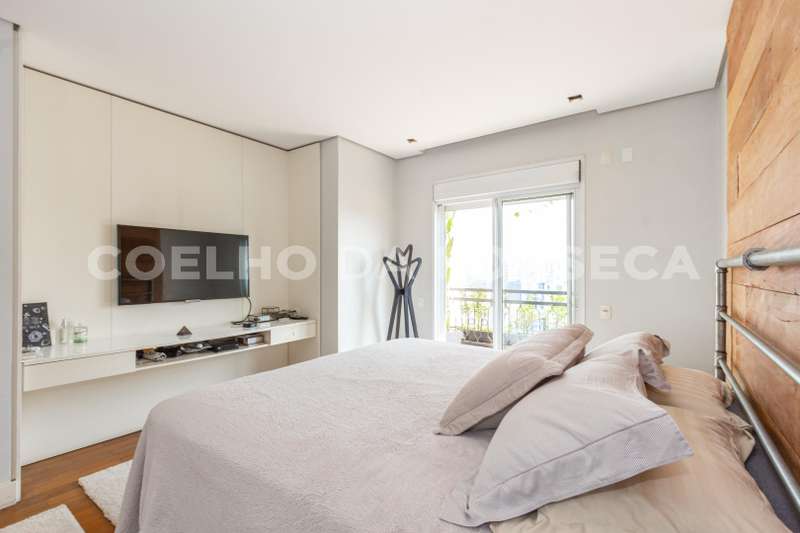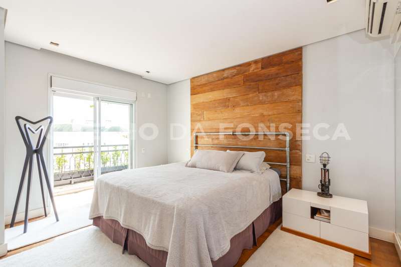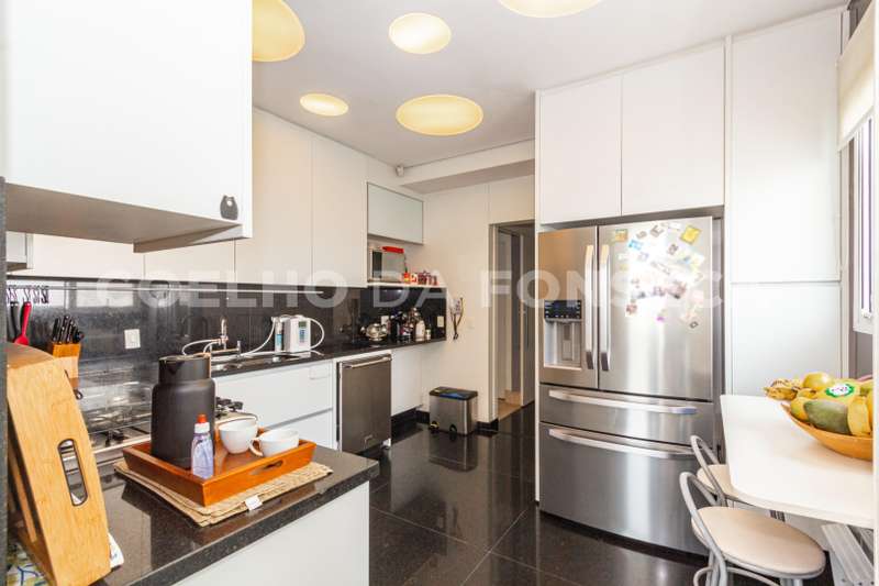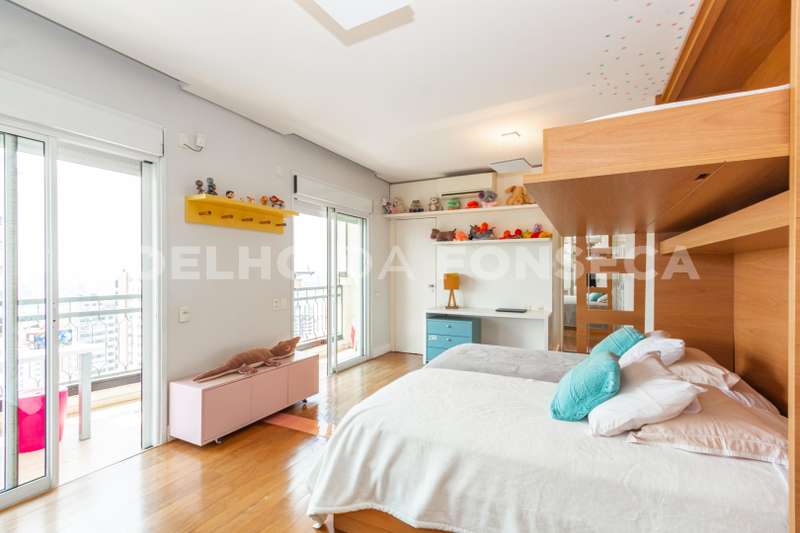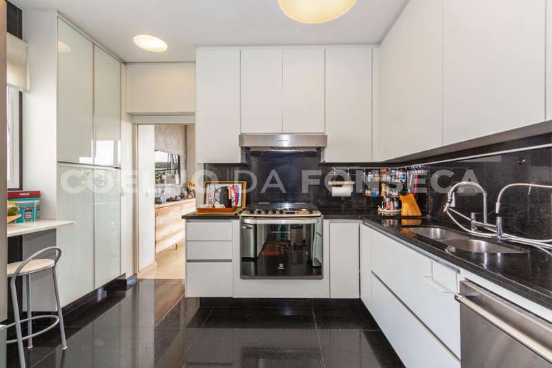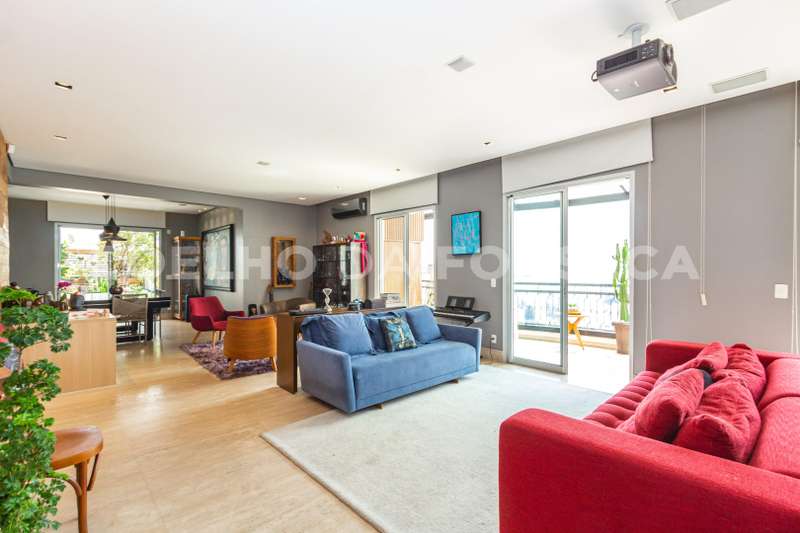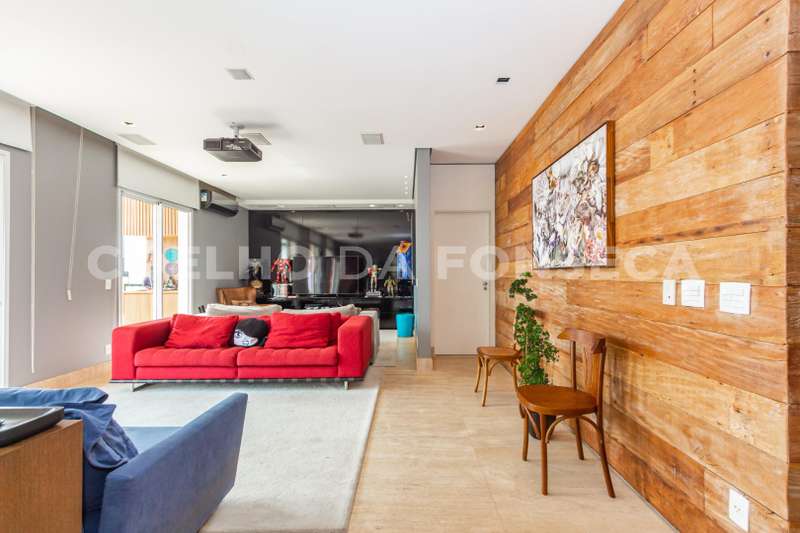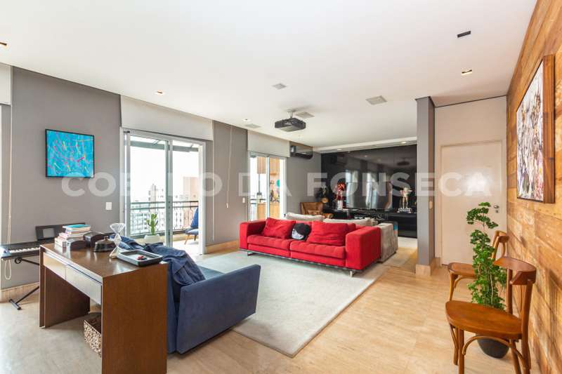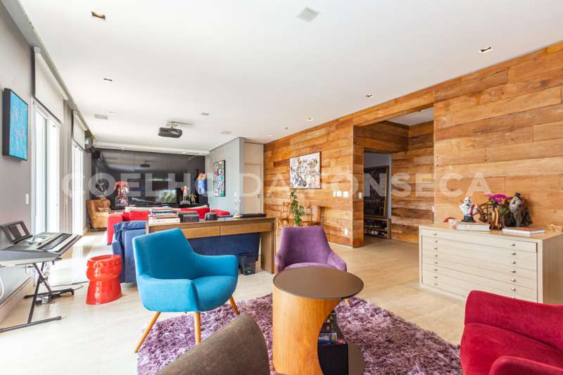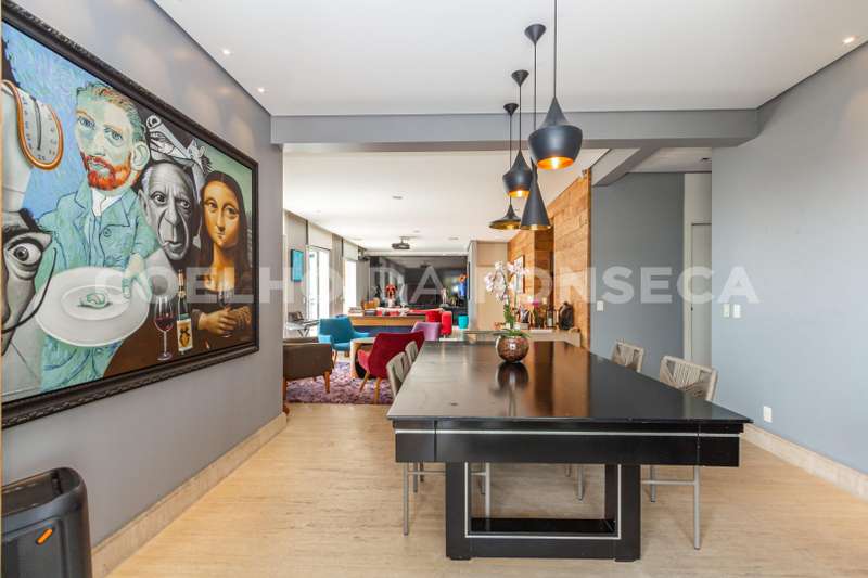 Cobertura com 476 m2 de área útil, 3 suites, 8 vagas, varanda, área gourmet no térreo com churrasqueira e piscina, ar condicionado em todos os ambientes, suites master com closet e banheiros Sr e Sra. Originalmente são 4 suites com fácil reversão.