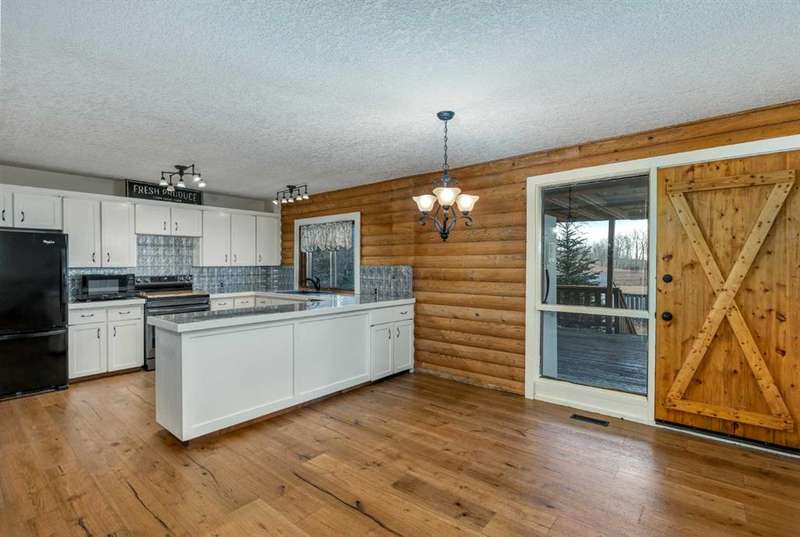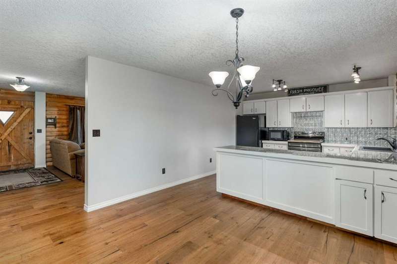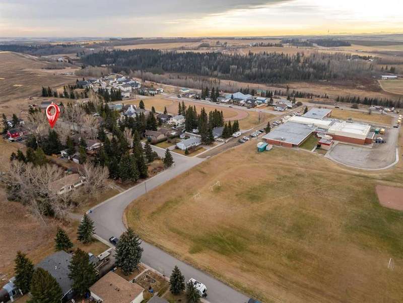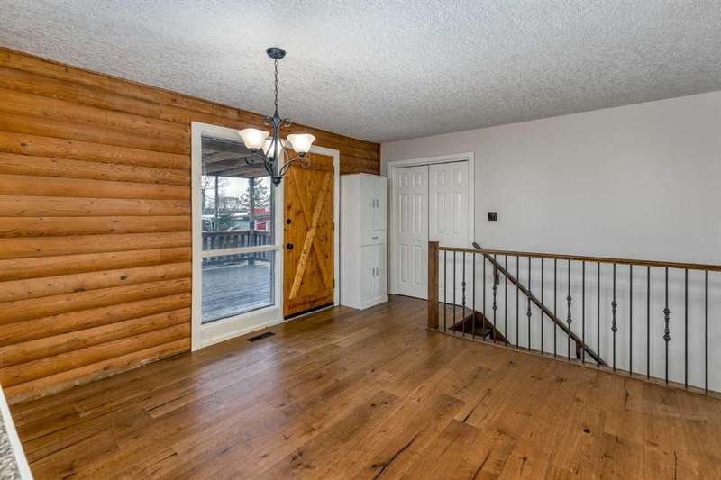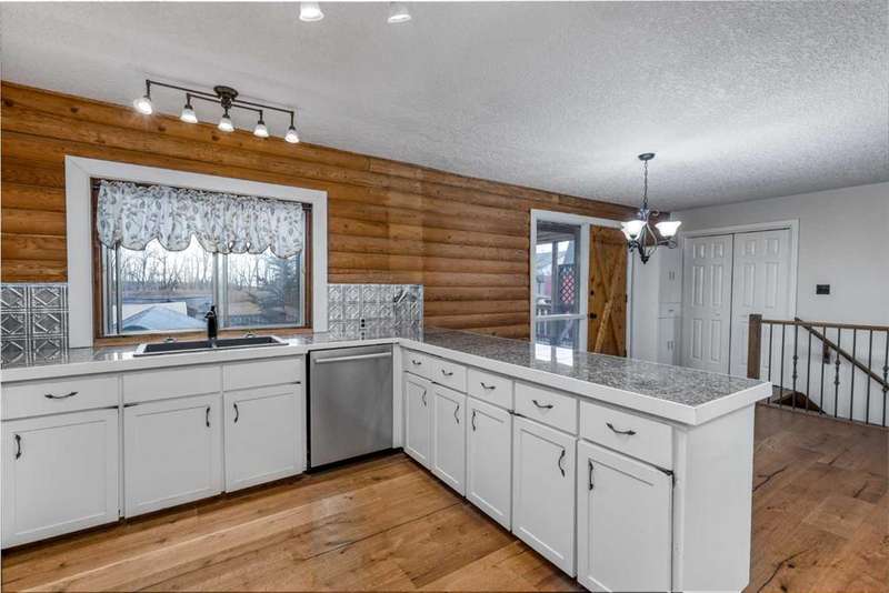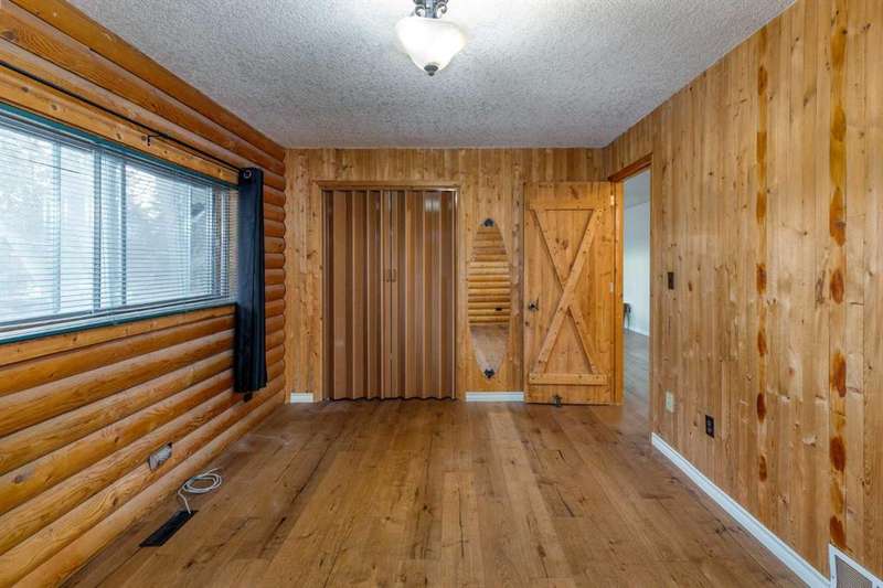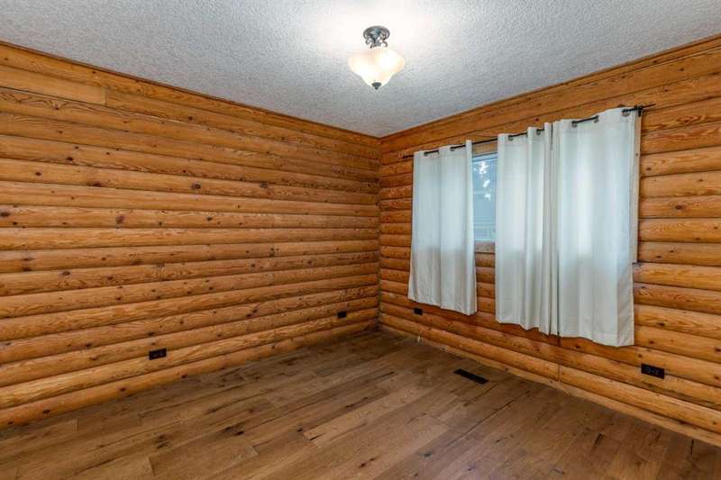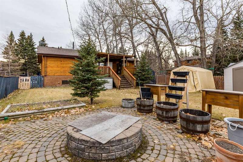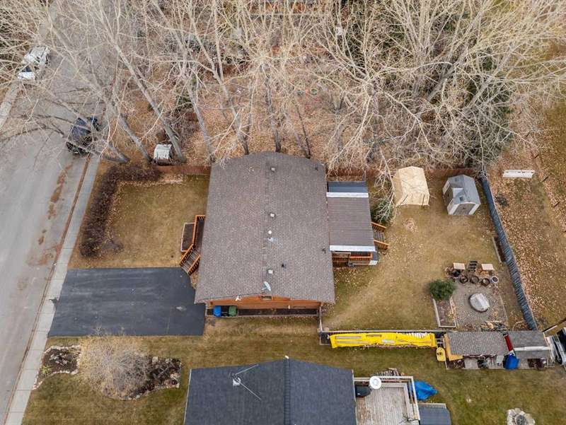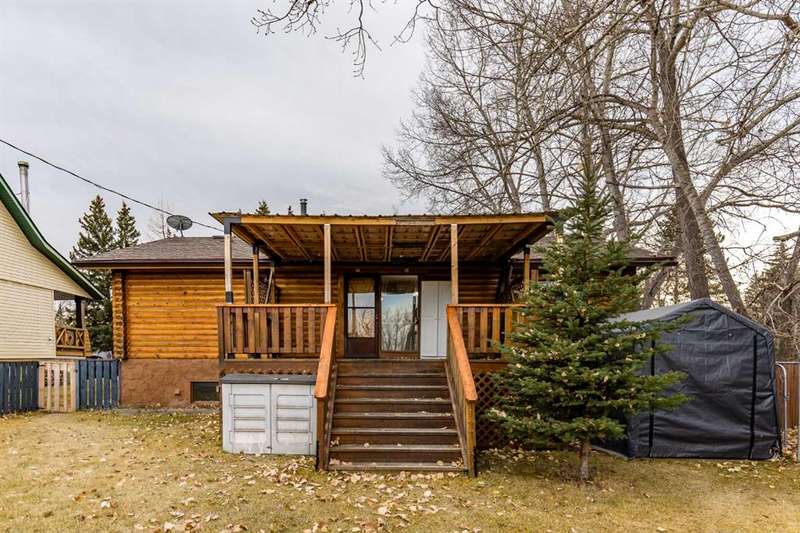 Once you view this charming log home you will fall in love. Situated on a beautifully treed mature street only one block from the School. This awesome raised bungalow offers over 1882 sq ft of developed living space across 2 levels perfectly blending comfort and functionality. The main floor layout includes a generous living room with cozy gas stove. A well appointed kitchen with ample cabinetry, granite tiled counter tops, and 4 appliances. Big dining area ideal for your family meals. You'll find 2 bedrooms on the main level with a recently renovated 4 pce bathroom offering a fresh modern feel. The developed lower level adds even more versatility with 2 additional bedrooms and a recently renovated 3 pce bathroom along with a large family room that has an electric fireplace perfect for movie nights. Laundry room is down and there is any area to set up a work bench for your tools to tinker around in. New furnace and hot water tank that are only 2 years old. The large landscaped lot has a few trees, shrubs, apple tree and firepit along with 3 sheds. Backyard is fenced and also has a dog run fenced in and fire pit. You will feel like you are backing onto green space as the lot overlooks large back yards of neighbouring properties. There is room to build a garage with access from the grassed back alley that is presently not being used. Don't miss out on this fantastic opportunity. Book your showing today