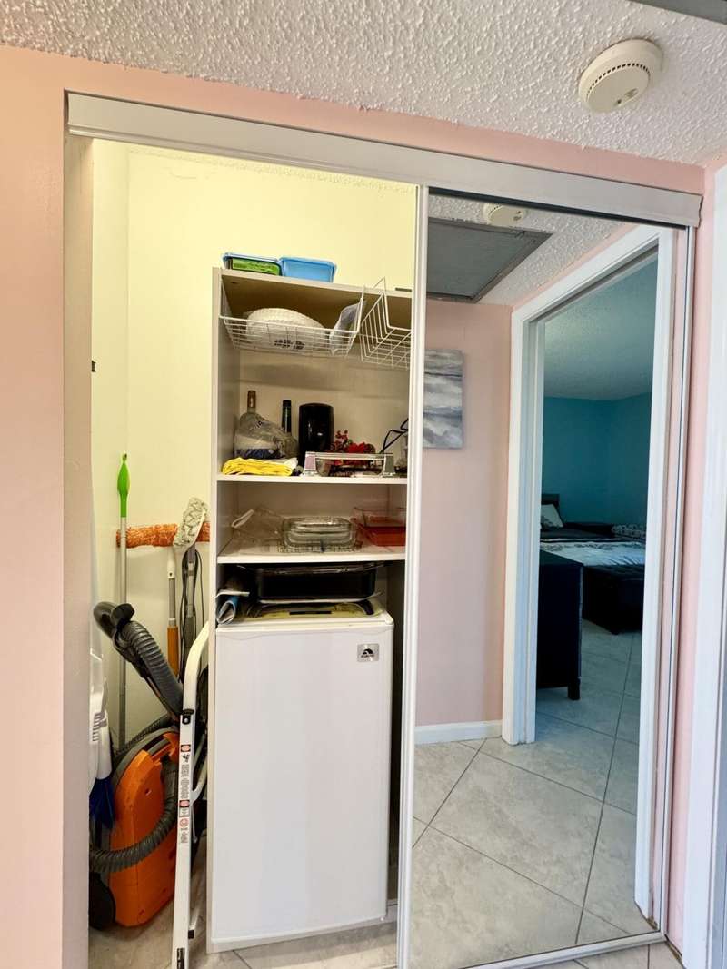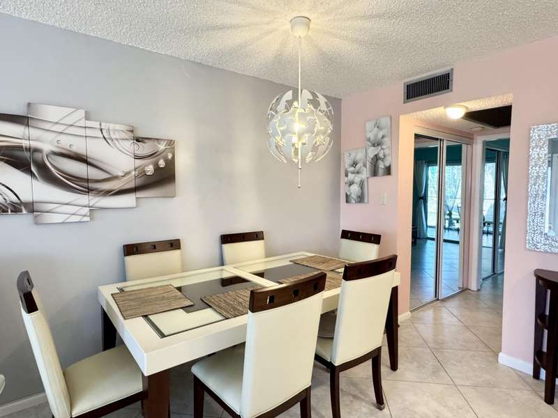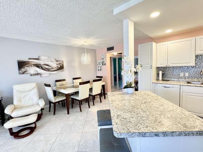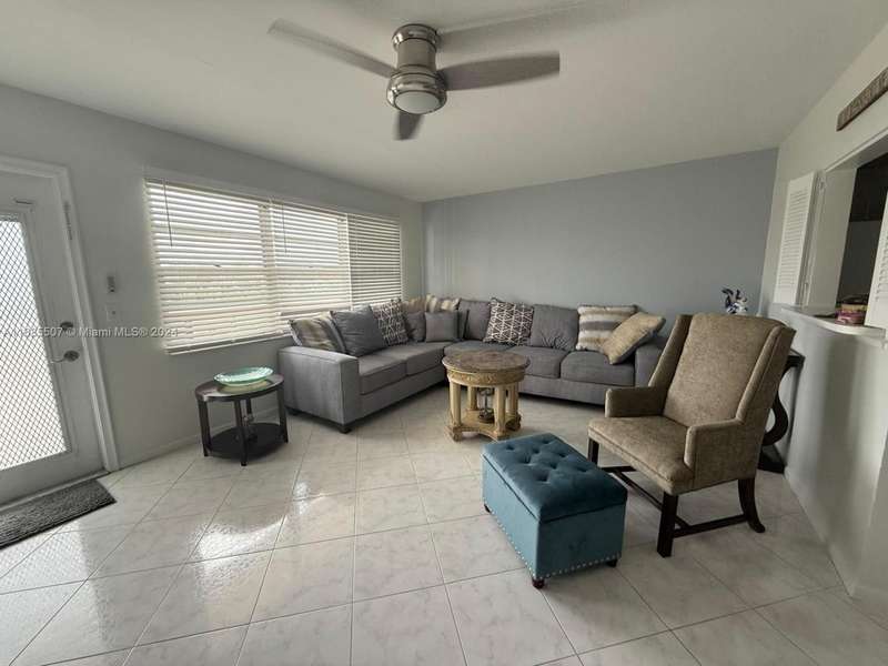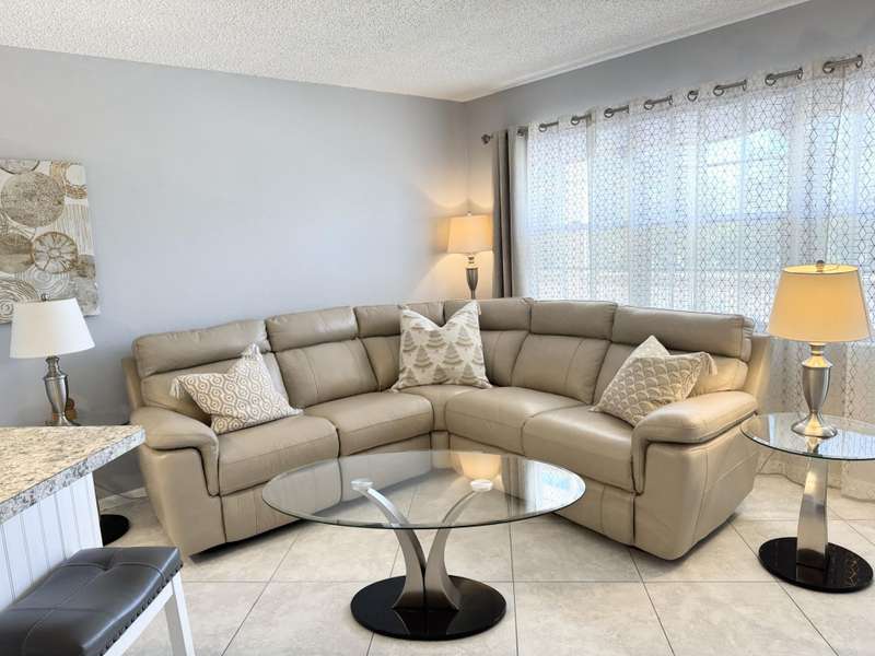 Fully furnished condo, move in ready! This beautifully updated turnkey 1-bedroom, 1.5-bath condo is located in the vibrant 55+ resort-style gated community of Century Village, offering 24/7 security. Relax in the spacious Florida room with private garden views. The home features a newer central A/C with Alexa thermostat and is conveniently located near both stairs and an elevator. Inside, enjoy an inviting open kitchen with a stylish backsplash, custom lighting, glass-top range, built-in closets for ample storage, and an extra small refrigerator. The building also offers additional storage in the laundry room. The condo is tastefully furnished with quality furniture and features tile flooring throughout for easy maintenance. Accordion shutters provide extra security and peace of mind.