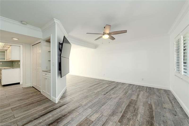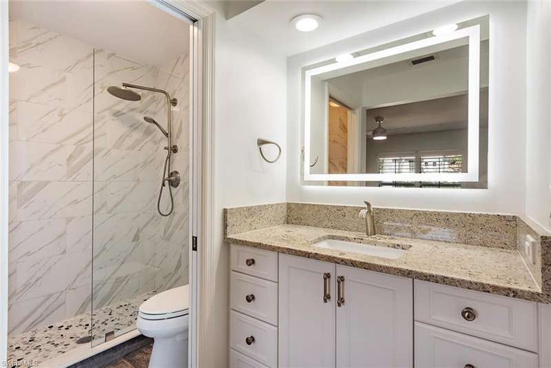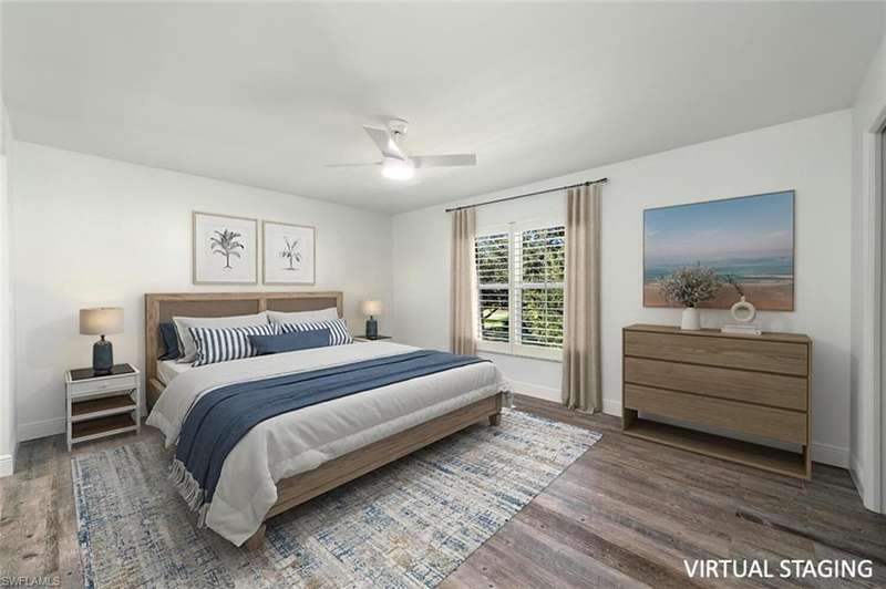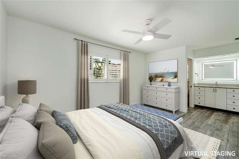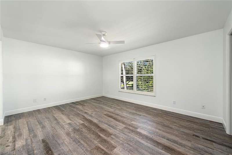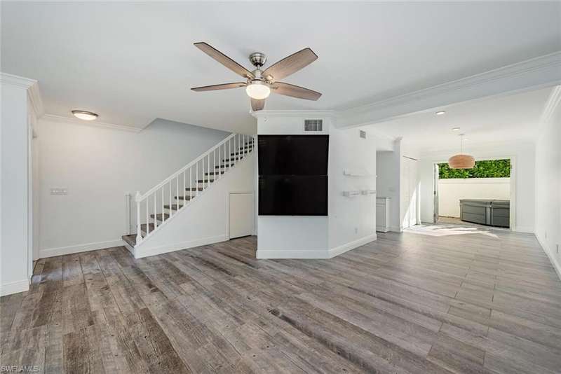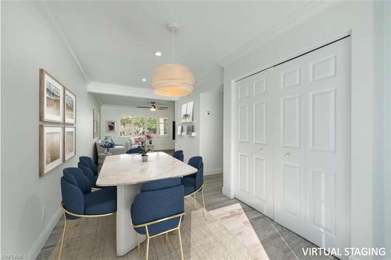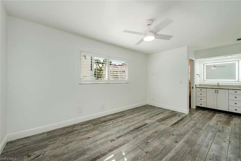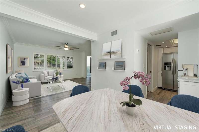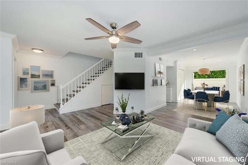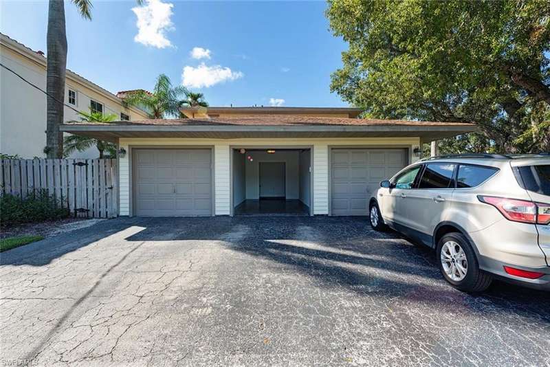 Discover this charming single-family attached villa in Old Naples, complete with a private one-car garage. Nestled in a serene, tree-lined neighborhood, it's just 3.5 blocks from the area's iconic white-sand beaches and 3 blocks from the vibrant shopping and dining on 5th Avenue South. Spanning 1,302 square feet across two levels, this light-filled home includes 2 bedrooms, 2.5 bathrooms, a 220-square-foot private backyard patio, and a 195-square-foot private garage. Inside, you'll find brand new wide plank white oak luxury vinyl floors throughout, elegant crown molding, and a crisp white kitchen featuring a farmhouse sink, marble countertops, a glass tile backsplash, and stainless-steel appliances. Recent updates enhance its appeal: a new HVAC system, fresh patio pavers, epoxy flooring in the garage, illuminated bathroom mirrors, a new skylight, updated disposal, new washer/dryer, new ceiling fans, interior and garage painted recently, new light fixtures with click mood lighting