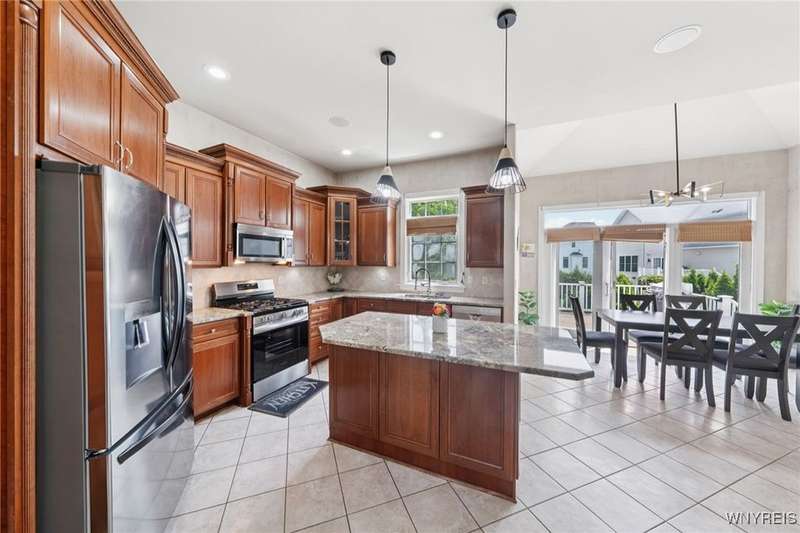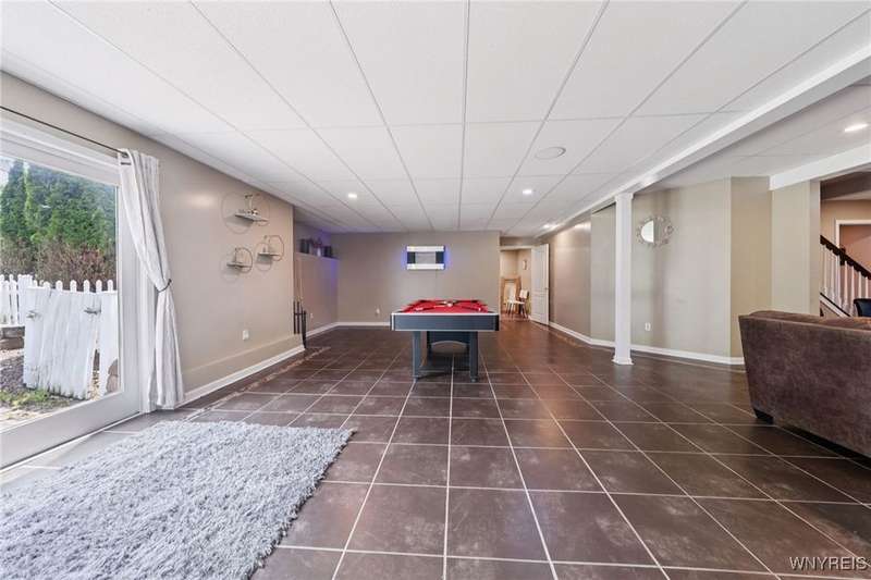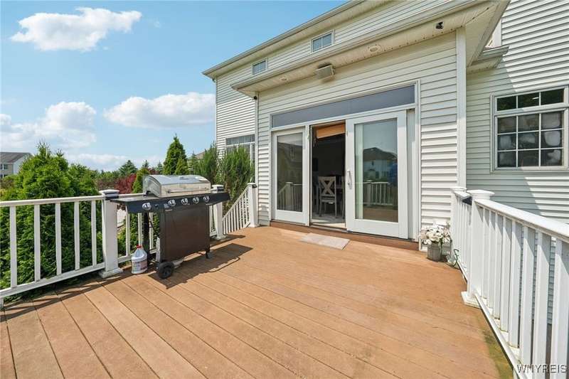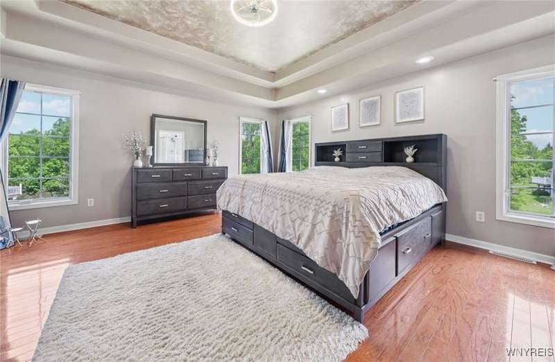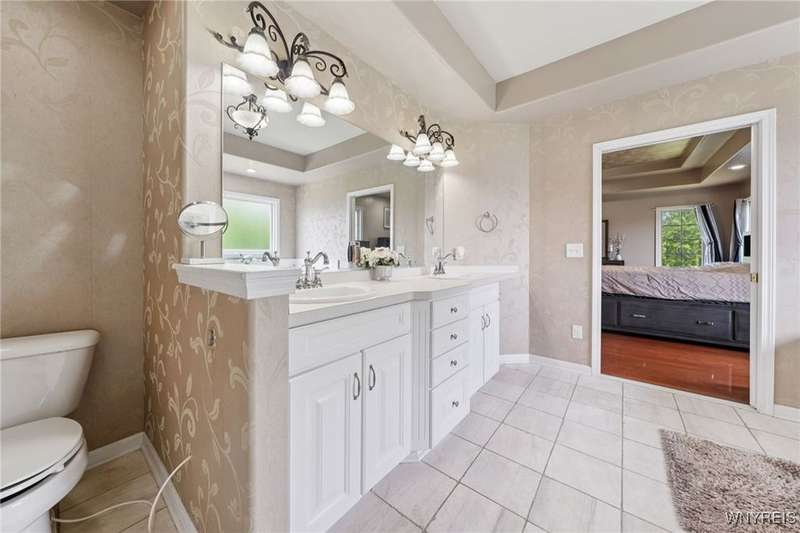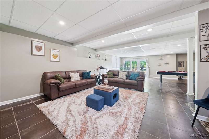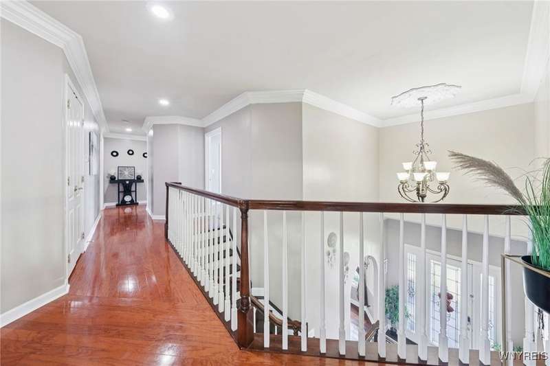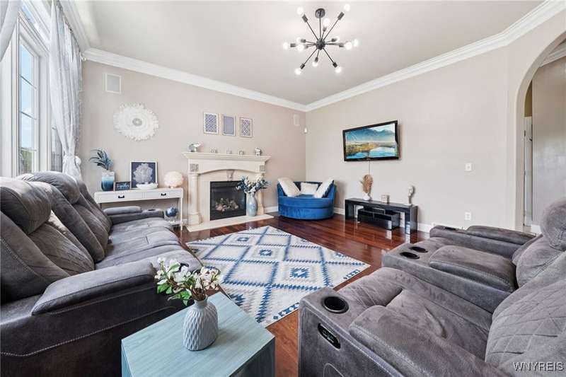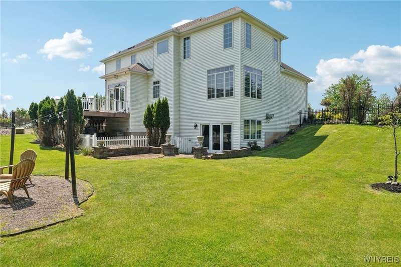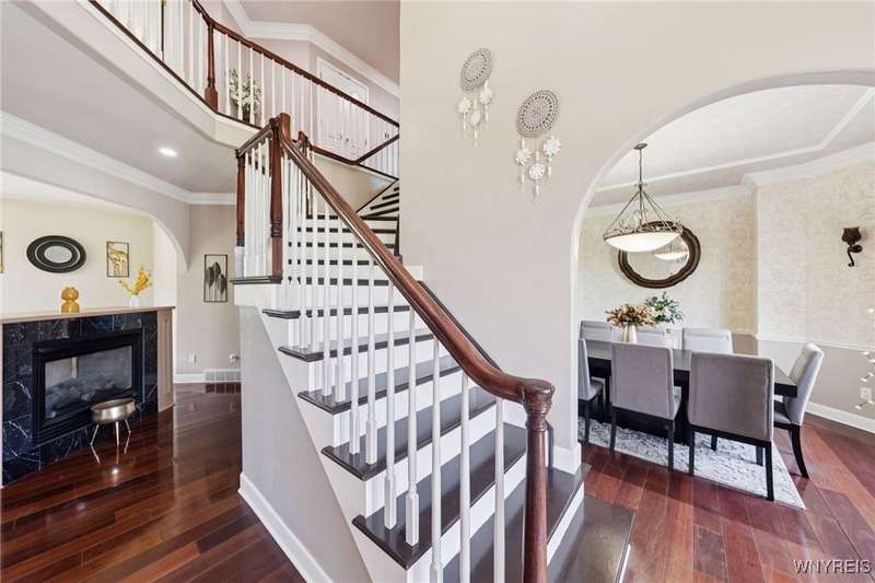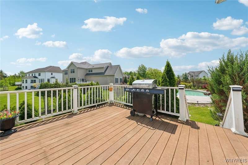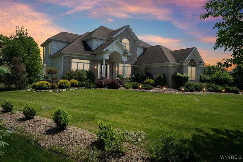 Welcome to 5703 Fairmeadow Court, a stunning 4-bedroom, 3.5-bathroom residence nestled on a Cul-de-sac in Clarence Center, NY. This meticulously designed home boasts over 4,100 square feet of luxurious living space, showcasing exquisite craftsmanship and attention to detail. The grand two-story entrance sets the tone for the home's elegance, featuring rich walnut hardwood floors and rounded archways throughout the first floor. The spacious living room is enhanced by a double-sided fireplace creating a warm and inviting atmosphere. The chef's kitchen is a culinary dream, equipped with stainless-steel appliances, granite countertops, a butler's pantry and a convenient first-floor laundry room. The den/study is adorned with 10-foot coffered ceilings. Upstairs, you will find 4 bedrooms and 3 full baths. The master suite offers a serene retreat with a glamour bath and separate shower. The second bedroom enjoys the privacy of its own en-suite bath. The third & fourth bedrooms share a Jack & Jill bathroom. The lower level offers a large finished great room perfect for entertaining or family gathering. Step out the French doors to your private oasis, complete with a custom saltwater pool, a fire pit area and ample green space. The lower level also includes a second private office, a bar room and plenty of storage space. Additional highlights include a three-car attached garage, Pella windows, Zoned heating and cooling with two heating and A/C units, all within the highly rated Clarence School System. This exceptional home offers a wonderful blend of luxury, comfort, and functionality, making it the perfect place to call home.