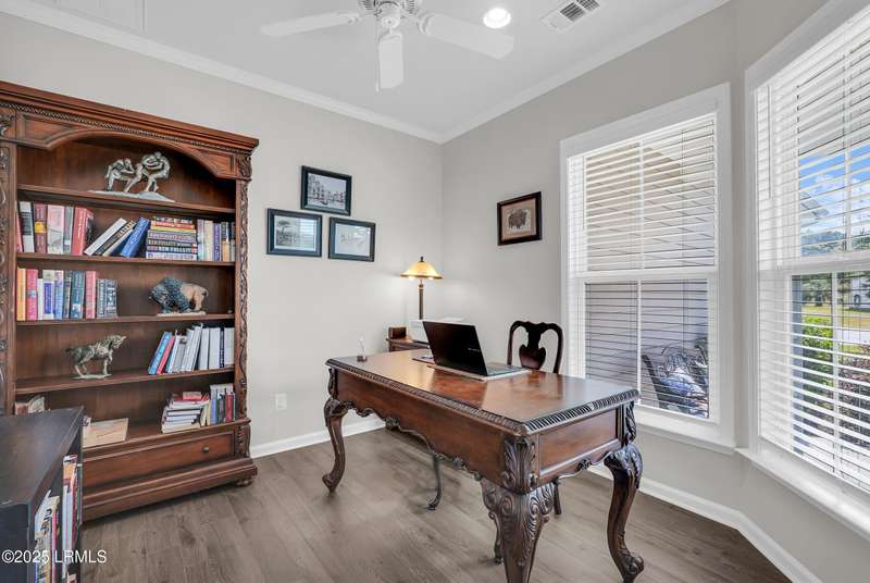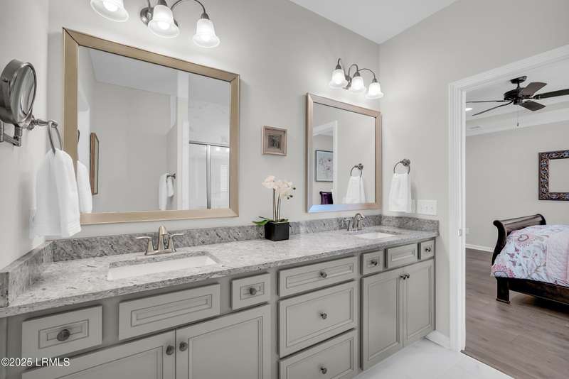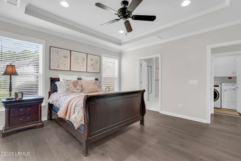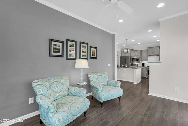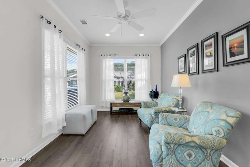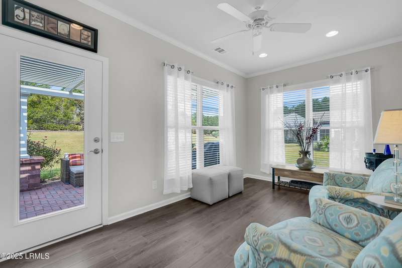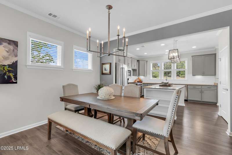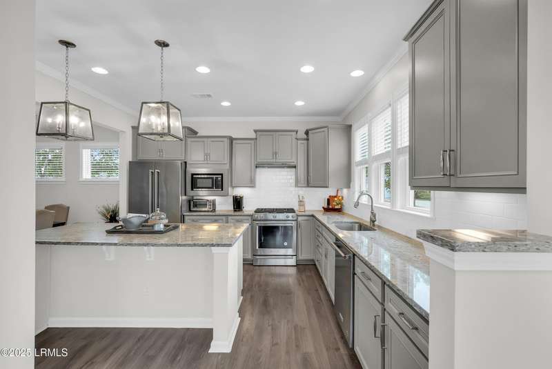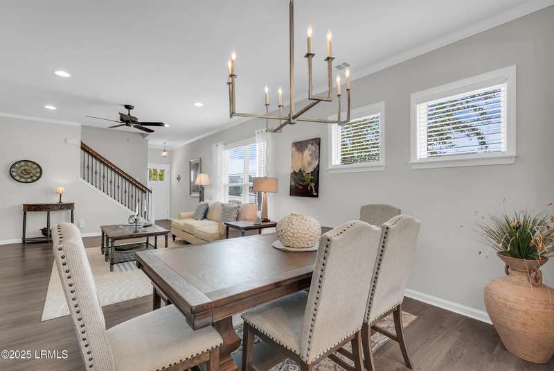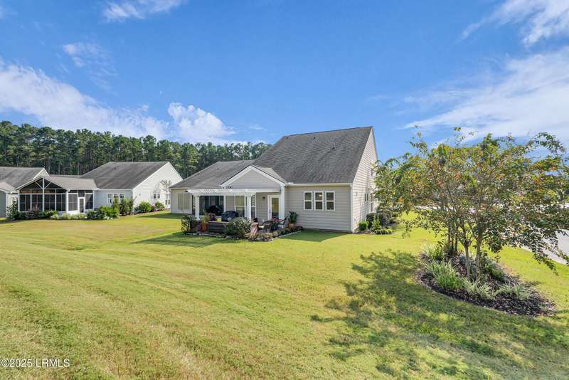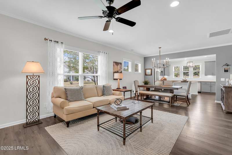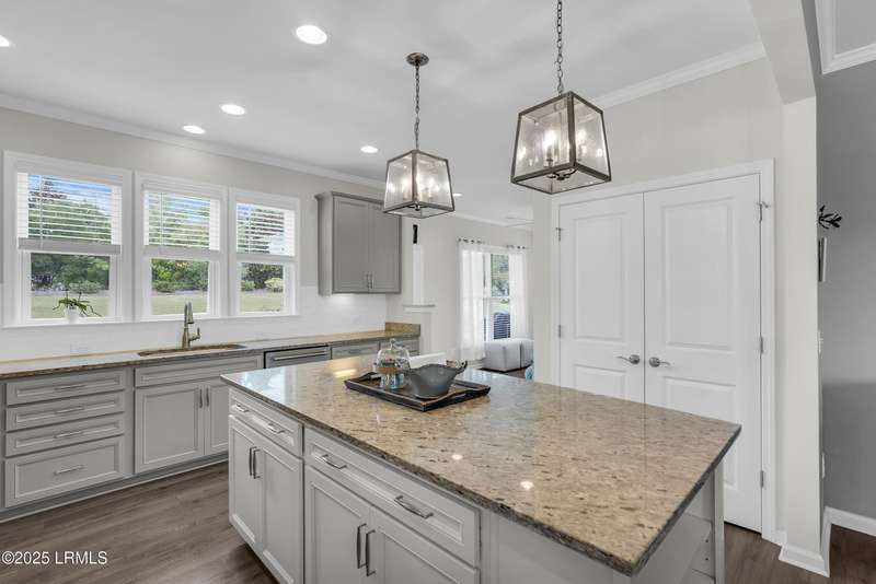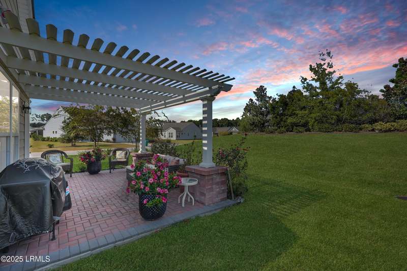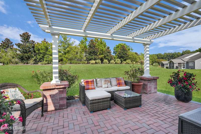 Welcome to this light and bright 3-bedroom, 3-bathroom Taft Street with loft, centrally located in the North Campus of Sun City Hilton Head. The gourmet kitchen shines with a gas range, upgraded stainless steel appliances, soft-close doors & drawers, roll-out shelving, a huge island, subway tile backsplash, granite countertops, under-cabinet lighting, and designer pendant lights. Additional amenities include an extended garage with walk-up attic storage, a Carolina room, and a second floor with an ensuite guest bedroom, loft, and storage closet. The primary suite features new LVP floors, a tiled shower surround with bench seating and a spacious walk-in closet. Outdoors, enjoy a custom pavered back patio with pergola, perfect for entertaining or relaxing. Easy access to the new Argent West