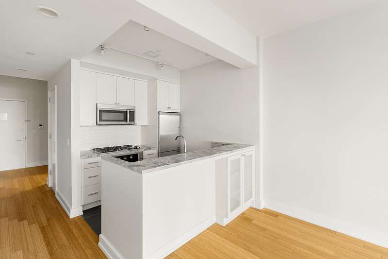 Entering this apartment into the foyer, you will find a fully updated kitchen complete with white cabinetry, stone countertops, and stainless steel appliances including a dishwasher and microwave.