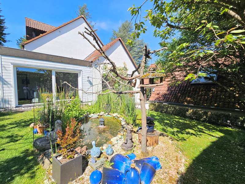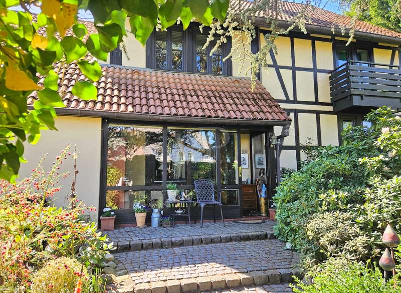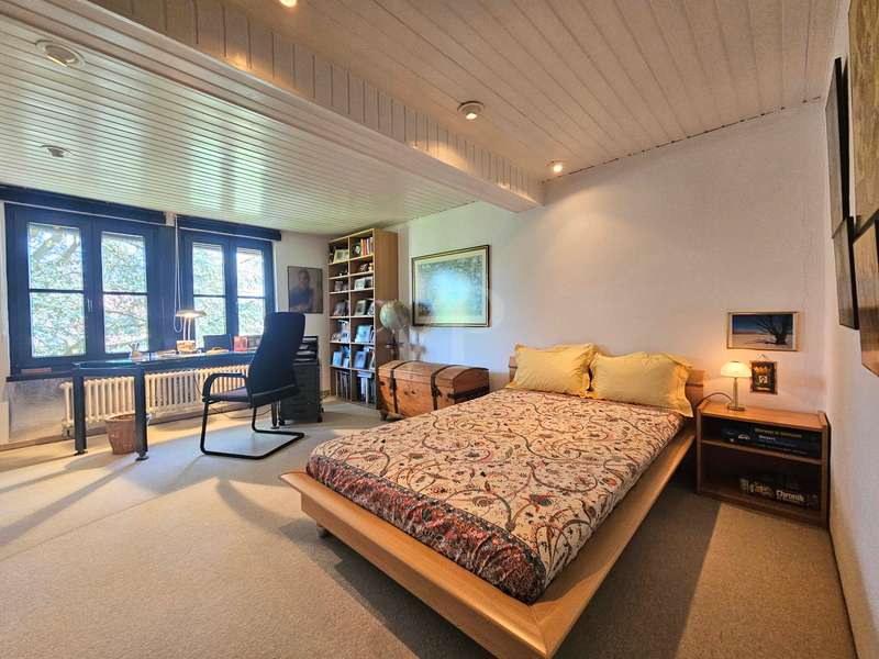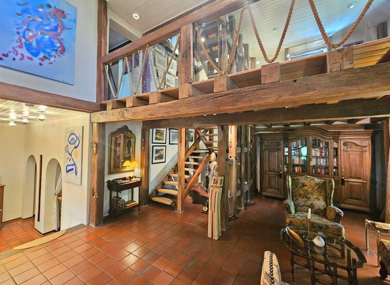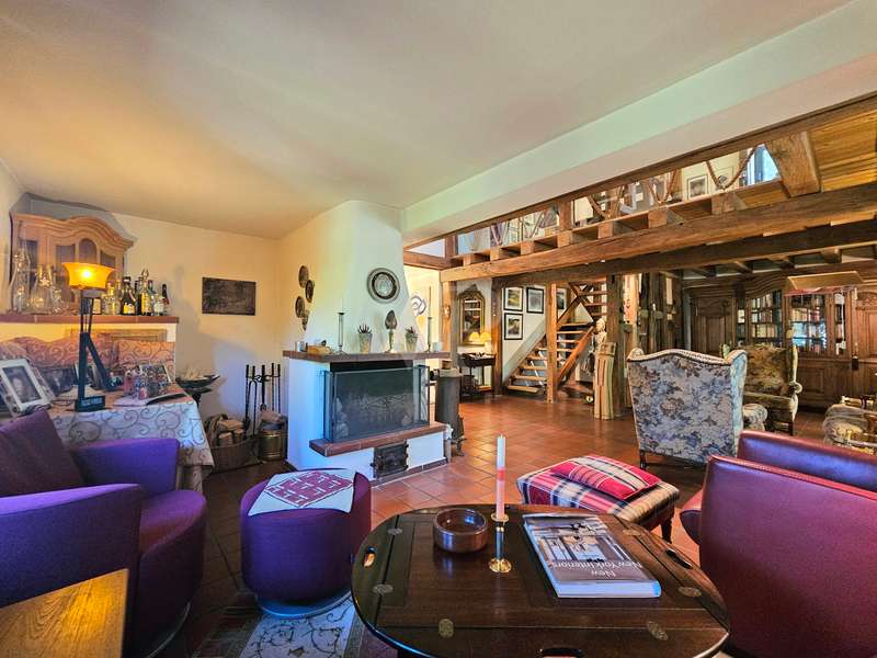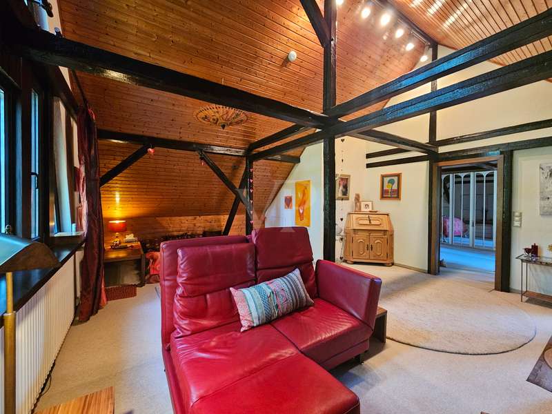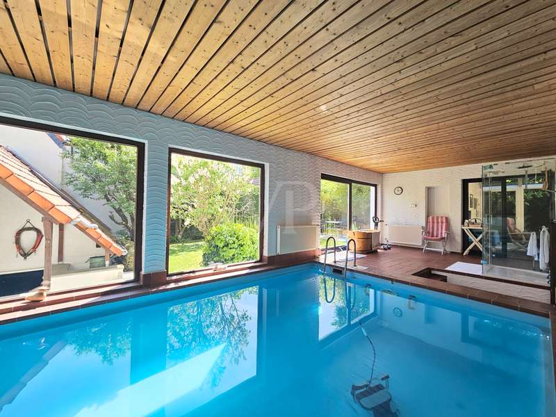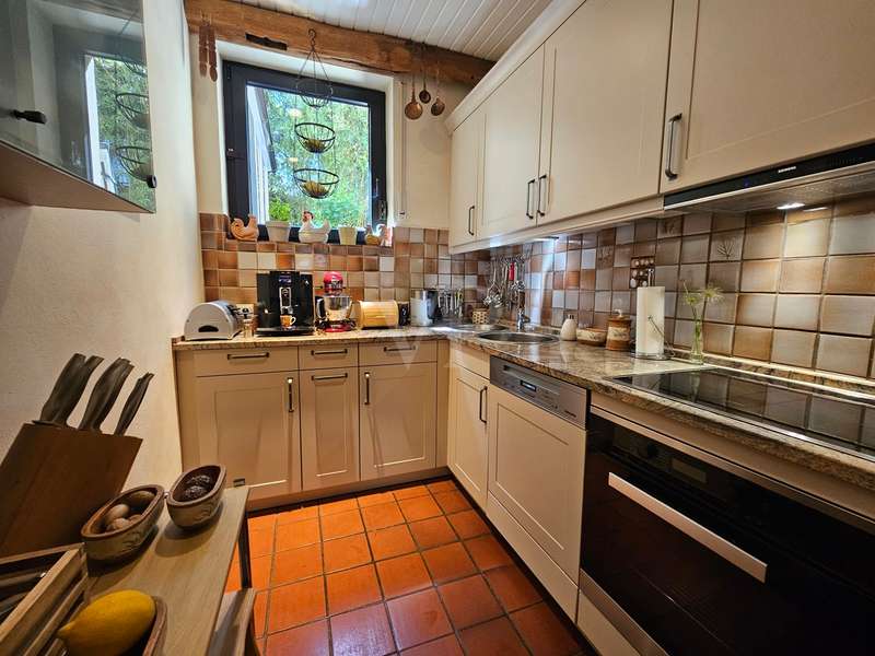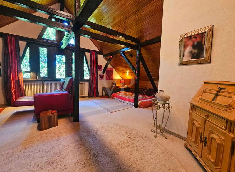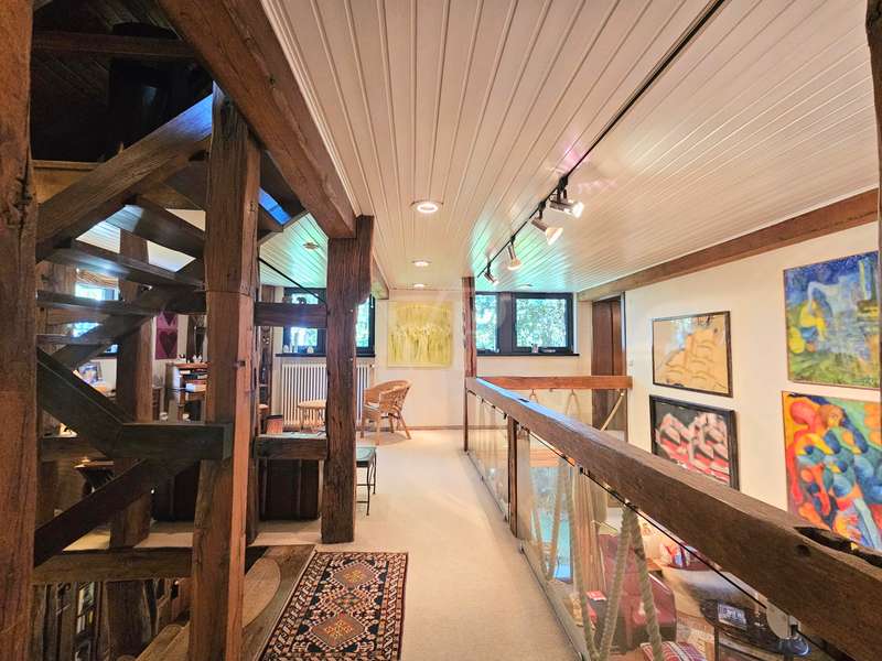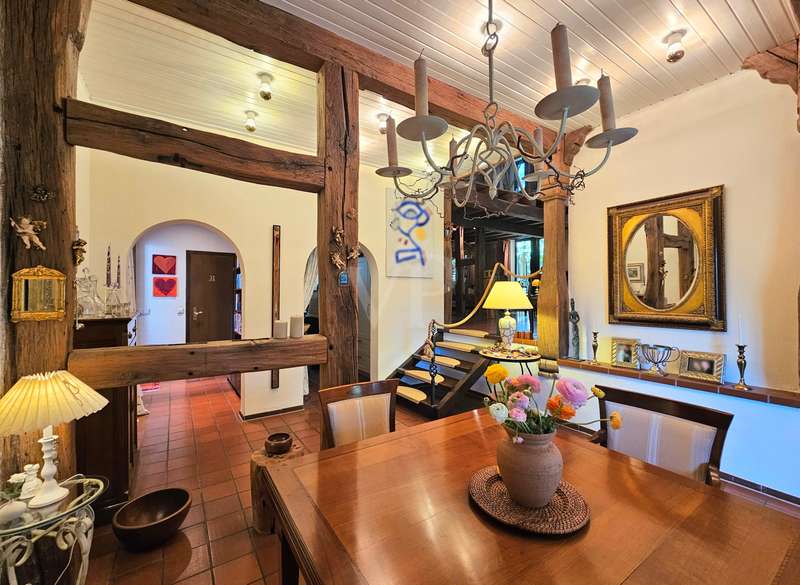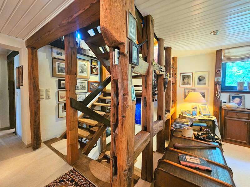 In a popular location in Usingen-Eschbach, a real collector's item awaits you. Not only the nearby Eschbach cliffs, but also the surrounding idyllic Taunus landscape invite you to enjoy leisure activities and relax in nature. The main shopping facilities, kindergarten and elementary school are within walking distance. Originally built as a barn in 1938, this property was converted into a residential house in 1978 with great sensitivity for the original building fabric - today it presents itself as an enchanting gem that will delight individualists, couples and small families alike. In 1995, the garage and conservatory were added, which was replaced with plastic in 2010. In addition, the heating, windows and most recently the kitchen have been renewed since 2000 and the north side of the house has been completely clad in natural slate. As soon as you enter the property, which is protected by a dense hedge, a world of its own opens up, sheltered from prying eyes - a place of peace, retreat and inspiration. This house is a symbiosis of history and style. The special architectural feature of this house lies in its mixture of stone walls up to 60 cm thick and the half-timbered construction typical of the region. Particularly impressive are the church beams, some of which are over 200 years old, which lend the open-plan living area a unique atmosphere and combine the charm of times gone by with modern living comfort. Here you can spend moments of coziness and relaxation in front of the fireplace. There are 6 rooms with 3 bedrooms, 3 bathrooms, a guest WC, a gallery and the very private wellness area with pool and steam sauna as well as a conservatory on a total of 3 living levels with a living area of approx. 210m². The spacious living area opens up to the dining hall - the communicative meeting point for family and friends - as well as to the two upper floors, which are connected by an open concept. The open gallery creates an airy feeling of space and also offers room for art, books or personal treasures. The bedroom under the roof has a separate WC and a loggia - ideal for that first coffee in the morning with a view of the greenery. Another highlight is the stylish indoor pool area with its own shower and steam sauna. Floor-to-ceiling windows and a sliding door open up the view into the well-tended garden - for the feeling of swimming in the middle of nature. Experience relaxation and wellness in your own private sanctuary. Right next door, the conservatory (added in 2010) offers a retreat with plenty of light and atmosphere as well as access to the garden at any time of year. The garden is a green paradise with several seating areas, a romantic pond and lovingly placed details - all embedded in complete privacy - a garden idyll with absolute privacy. Enjoy your private time-out from everyday life here, be it for reading, gardening or celebrating with friends. The large garage offers space for two vehicles and additional storage space in the roof This house is not an off-the-peg property - it is a home for people with a desire for something special. A place to feel at home, which celebrates individuality and offers the highest quality of living. The entire house is characterized by loving details. A truly unique property in a popular residential area. Experience this extraordinary home for yourself - we look forward to hearing from you!