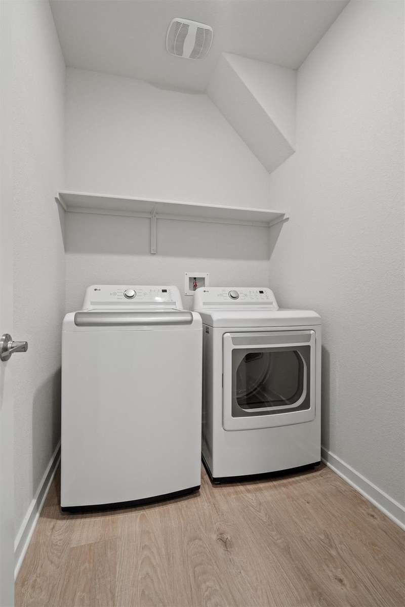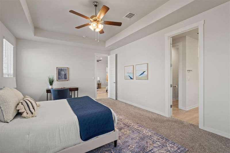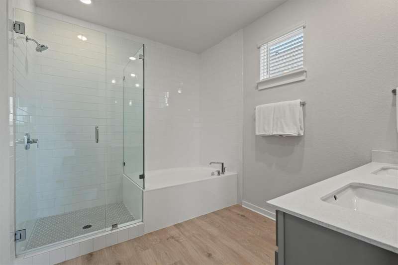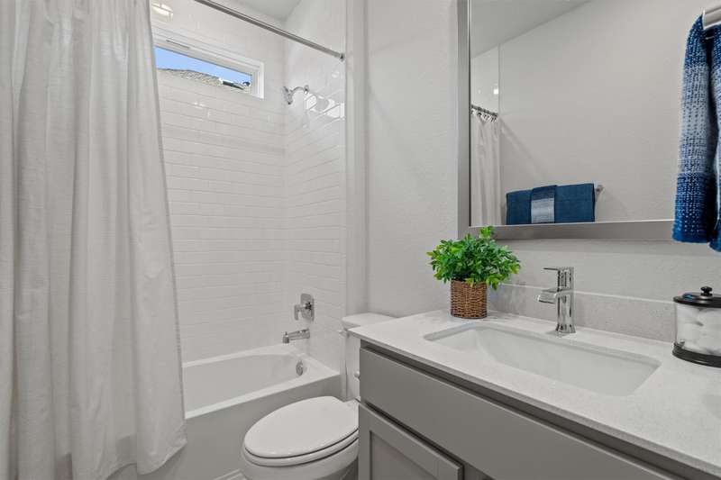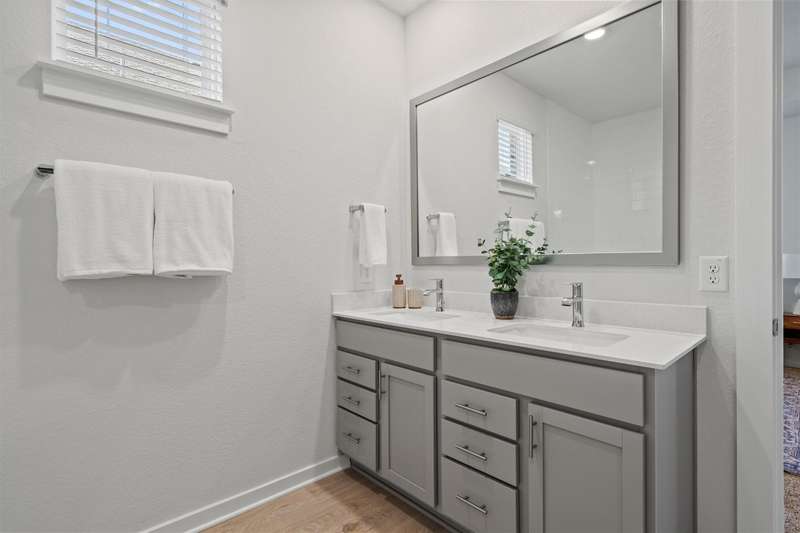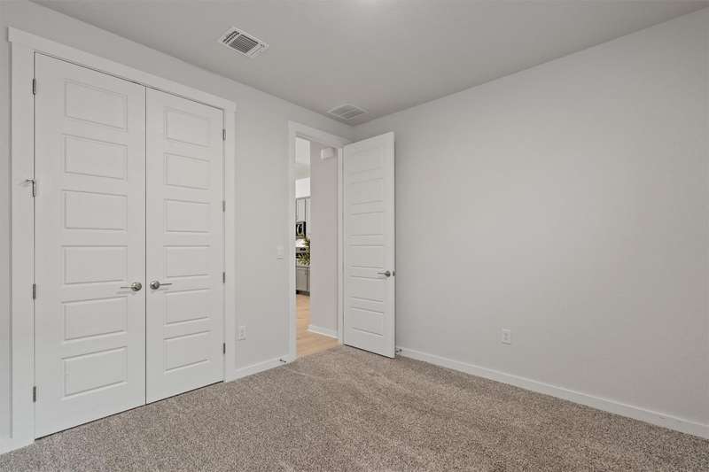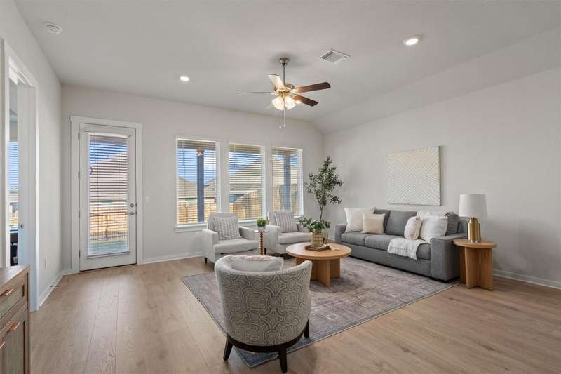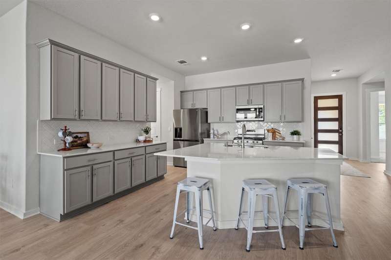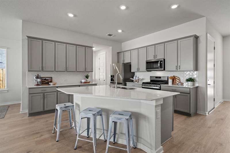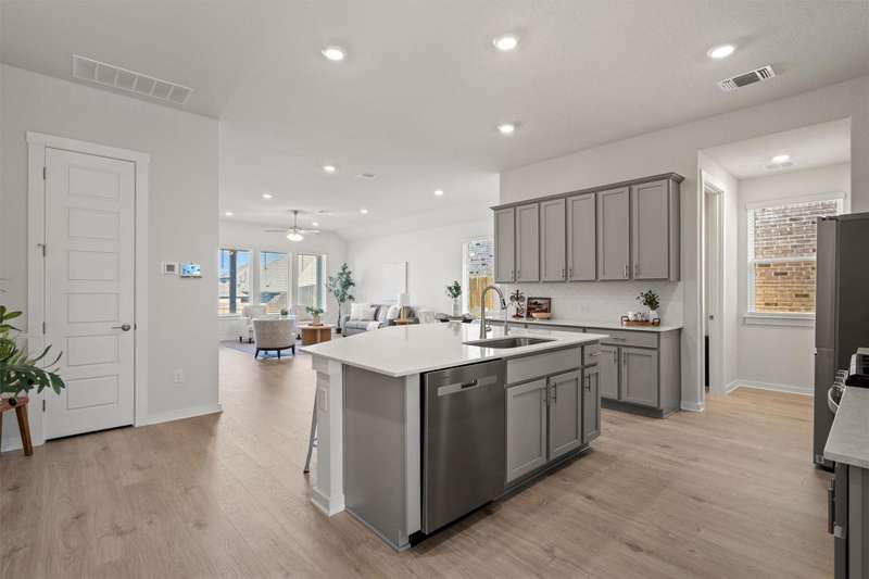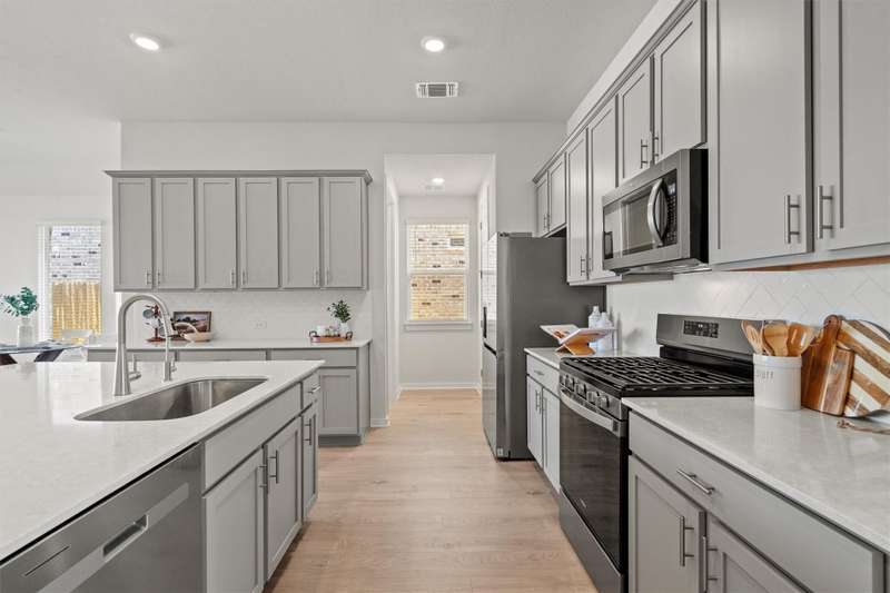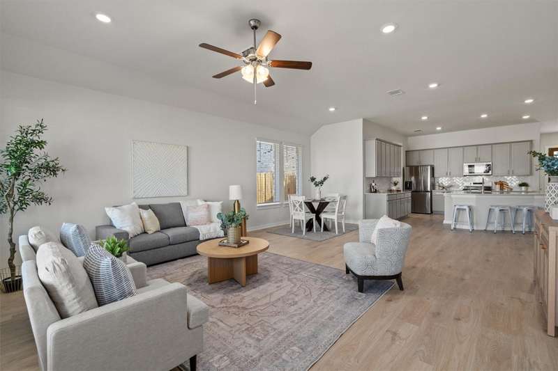 Welcome to 416 Deerpath St in Leander! This Kingston II floor plan in Rosenbusch Ranch has been very lightly lived in. It offers 2,105 sq ft, with 4 bedrooms, 2 bathrooms, a 2-car garage and all sides brick. The 8-foot glass and wood entry door and long foyer makes a warm first impression and leads you into the heart of the home. A spacious open-concept kitchen, dining, and family room that’s perfect for everyday living or entertaining guests. The gorgeous wood plank flooring add a nice touch. The kitchen is a true showstopper, boasting quartz countertops, a unique diamond-shaped island, and stainless-steel appliances (gas stove). Large windows flood the family room with natural light, creating a seamless connection to the covered patio and backyard. Tucked away for privacy, the primary suite is generously sized and offers a tranquil retreat with a large walk-in shower, separate tub and an expansive walk-in closet. The smart home features include smart light switches, a Honeywell thermostat and video doorbell. Upgrades you’ll love: this home comes with a whole-home water softener and reverse osmosis system (a $7,000 value), and a almost brand-new refrigerator, washer, and dryer—all included. Move-in ready and designed for today’s lifestyle, this home has everything you need from day one. The builder has two series in this community, the Legacy Series and a more affordable series of homes. This home is the Legacy Series (higher priced series). Located near Hero Way and Lakeline, you are close to dining and about 3 miles to HEB Plus and the Leander Metro train station. Amenities include a pool and playground. Low tax rate of 2.0225. *1% interest rate reduction for the first year with our preferred lender*