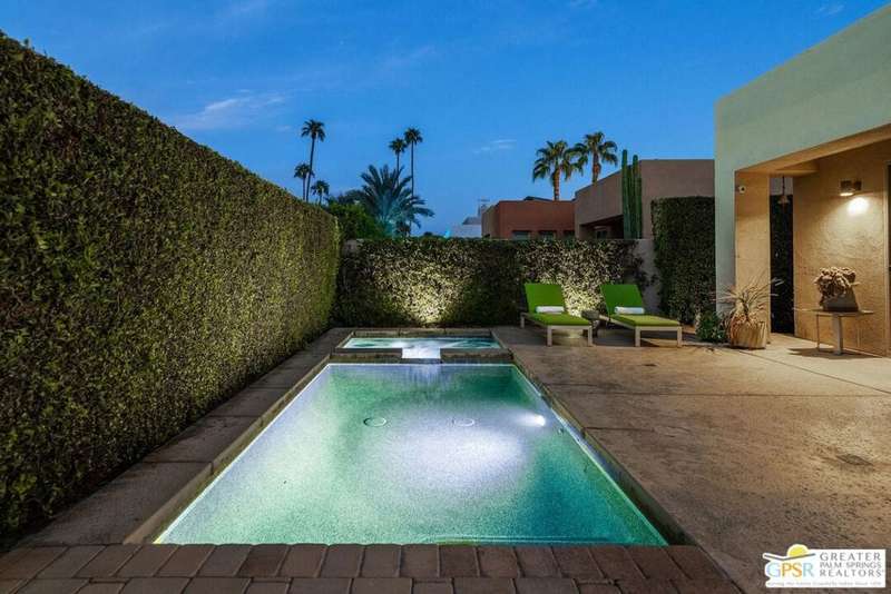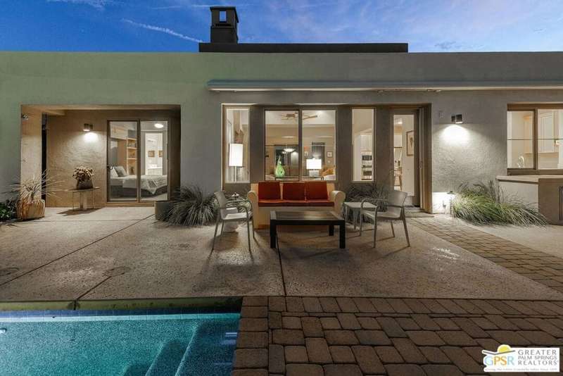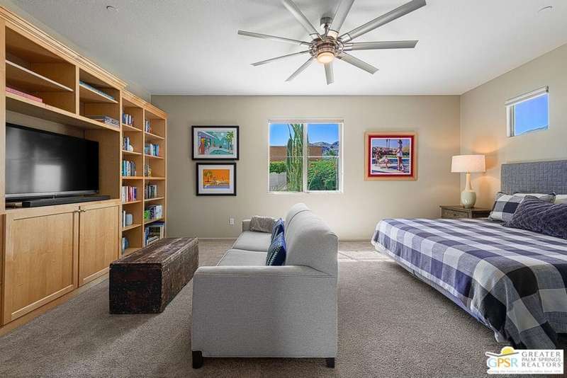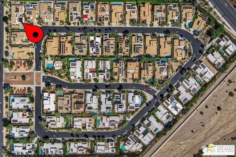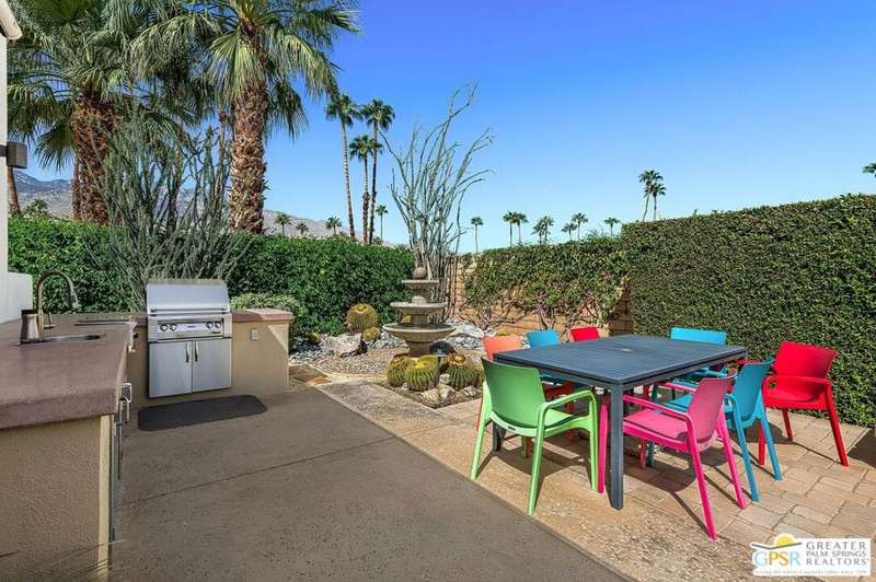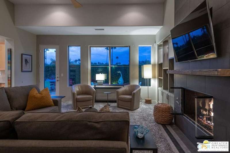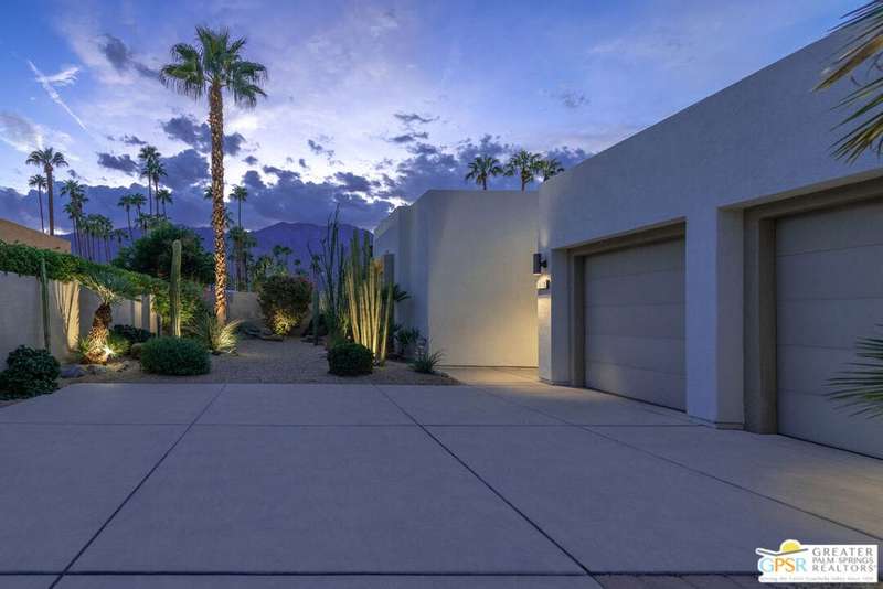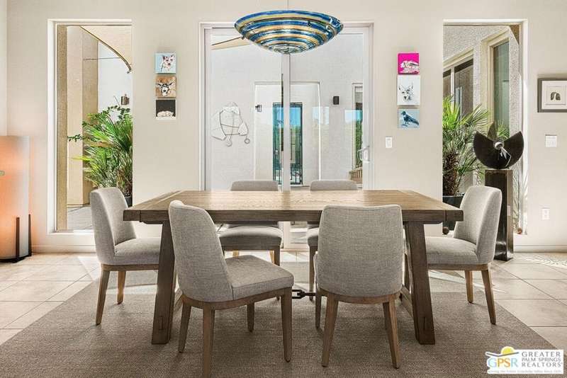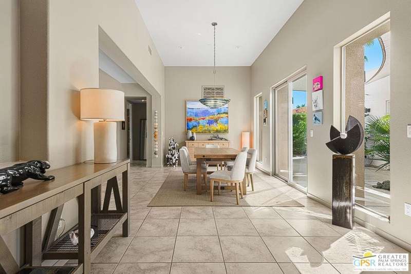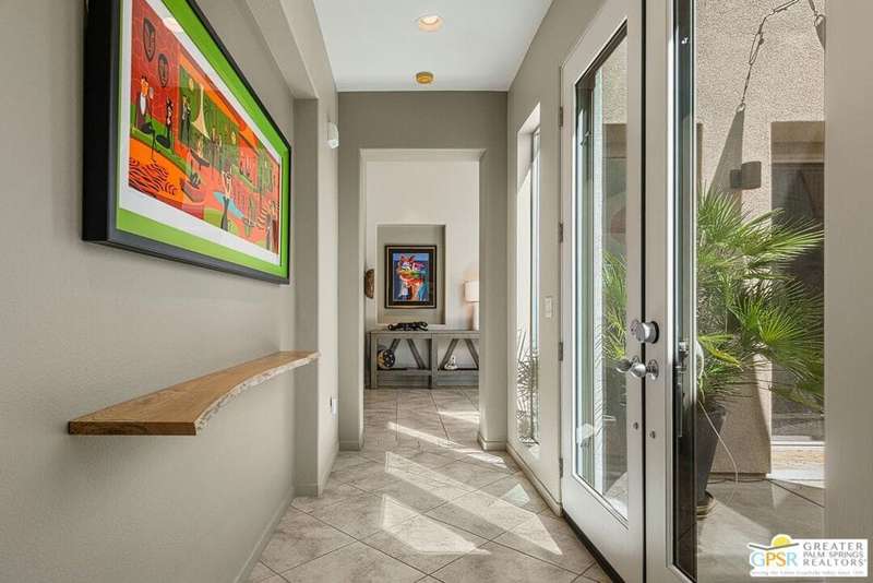 Set on one of the largest lots in South Palm Springs' Luminaire, this contemporary home is positioned at the end of a long, private drive. Architectural desert landscaping and mountain views underscore a sense of retreat, while the approach opens to a gated courtyard with fireplace and seating area. Through double doors, the foyer introduces nearly twelve-foot ceilings and expansive walls of glass that bathe the home in natural light, highlighting custom millwork and upgraded tile. A spacious dining room overlooking the courtyard creates a dramatic setting for entertaining and connects seamlessly to the family room with its gas fireplace. The adjoining kitchen blends form and function with a generous island, gas cooktop, wall oven, and extensive cabinetry, designed to support both everyday living and gatherings with ease. The private primary wing offers a den or home office, expansive walk-in closet, and a bath with soaking tub, dual vanities, and separate shower. A guest suite with pool access and en suite bath enhances comfort for visitors. Outdoors, the backyard takes on the character of a private resort with a pool, spa, built-in kitchen, motorized shade awning, fire feature, and a butterfly-friendly fountain that brings life to the landscape. Thoughtful upgrades including an owned 37 panel, 8kWh solar system water filtration, a two-car garage complete a home designed for both elegance and ease.