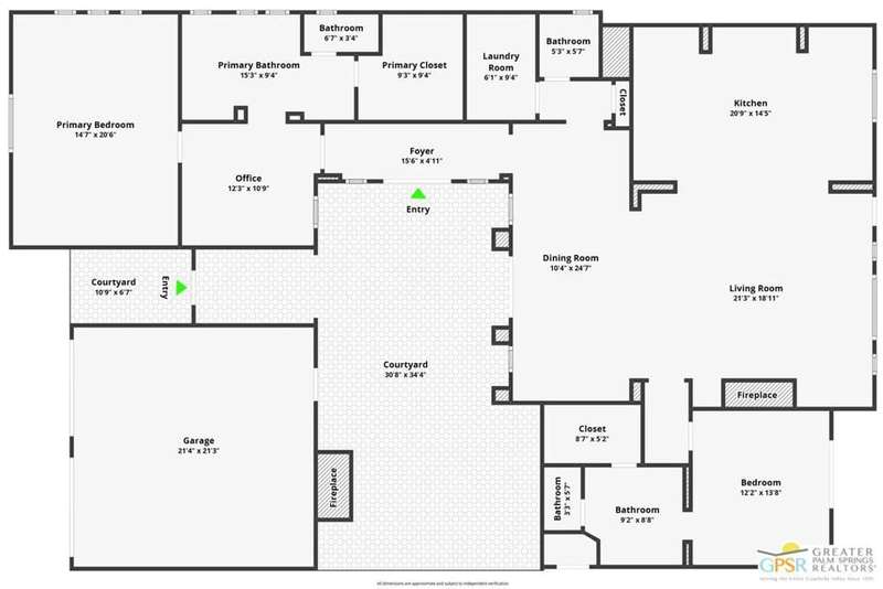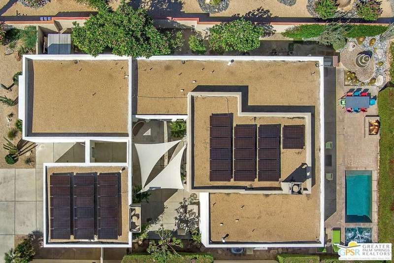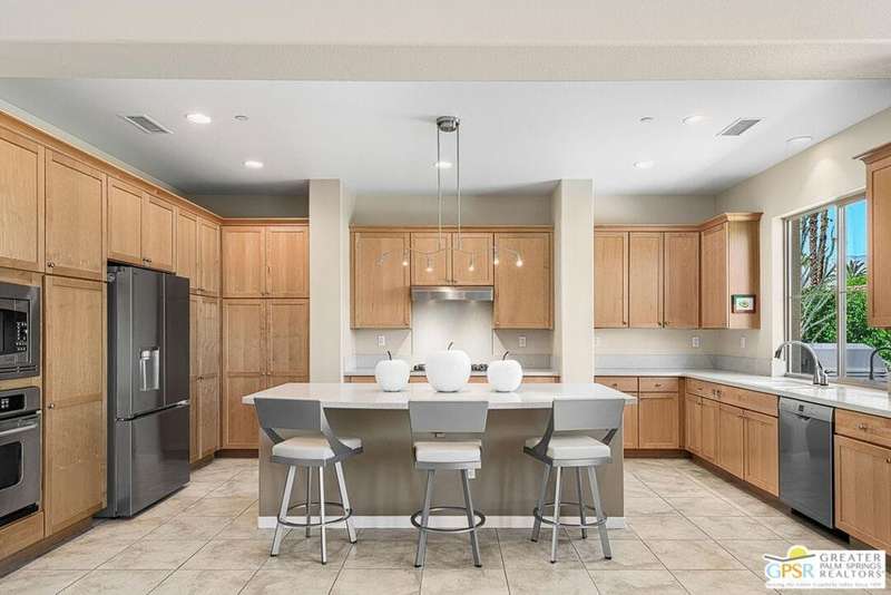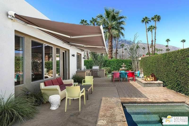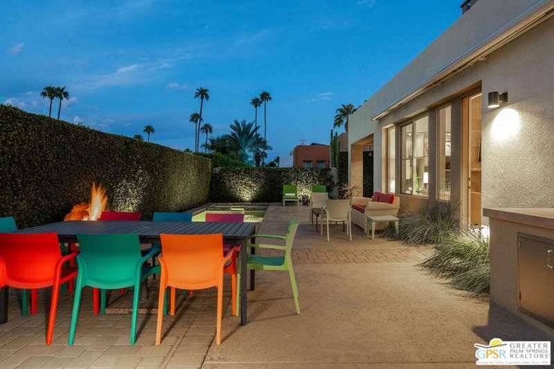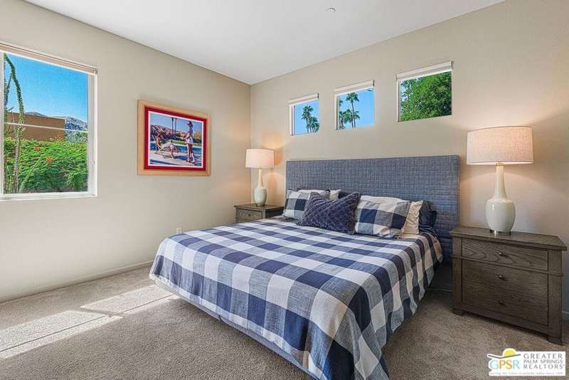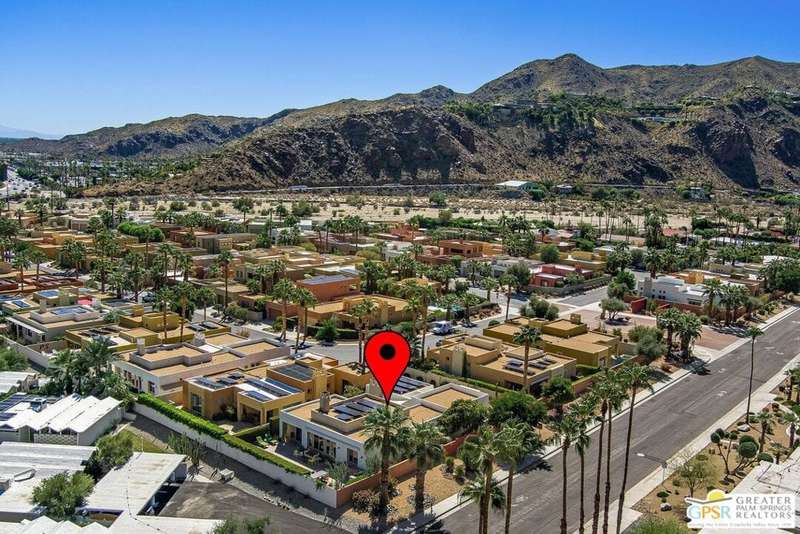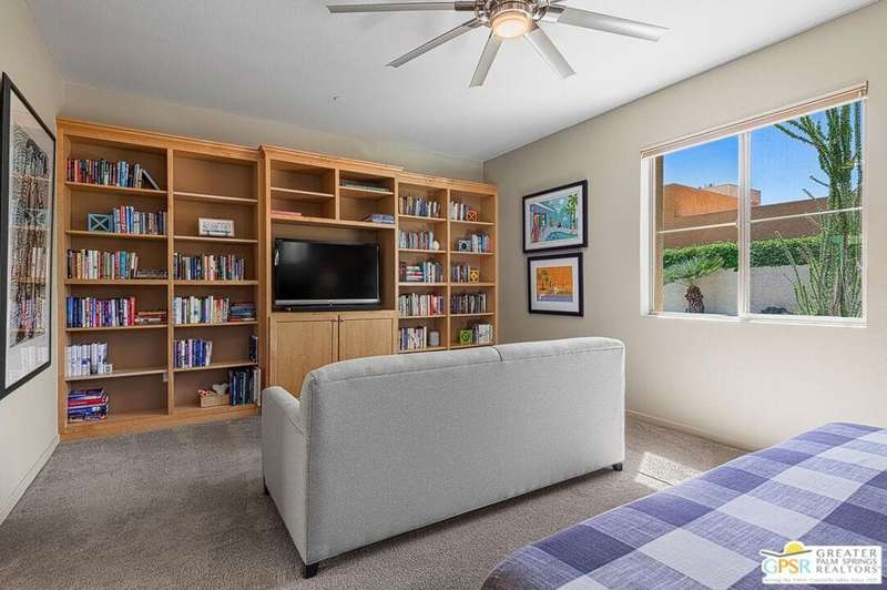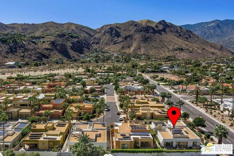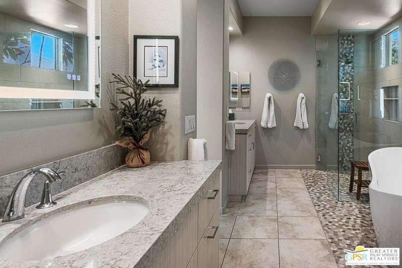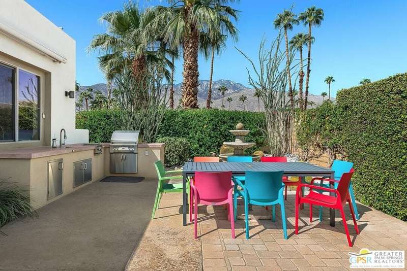 Set on one of the largest lots in South Palm Springs' Luminaire, this contemporary home is positioned at the end of a long, private drive. Architectural desert landscaping and mountain views underscore a sense of retreat, while the approach opens to a gated courtyard with fireplace and seating area. Through double doors, the foyer introduces nearly twelve-foot ceilings and expansive walls of glass that bathe the home in natural light, highlighting custom millwork and upgraded tile. A spacious dining room overlooking the courtyard creates a dramatic setting for entertaining and connects seamlessly to the family room with its gas fireplace. The adjoining kitchen blends form and function with a generous island, gas cooktop, wall oven, and extensive cabinetry, designed to support both everyday living and gatherings with ease. The private primary wing offers a den or home office, expansive walk-in closet, and a bath with soaking tub, dual vanities, and separate shower. A guest suite with pool access and en suite bath enhances comfort for visitors. Outdoors, the backyard takes on the character of a private resort with a pool, spa, built-in kitchen, motorized shade awning, fire feature, and a butterfly-friendly fountain that brings life to the landscape. Thoughtful upgrades including an owned 37 panel, 8kWh solar system water filtration, a two-car garage complete a home designed for both elegance and ease.