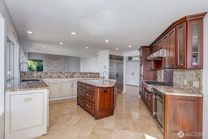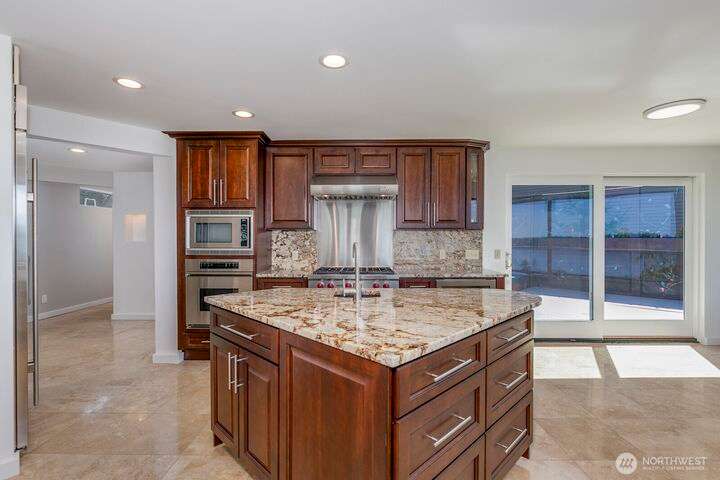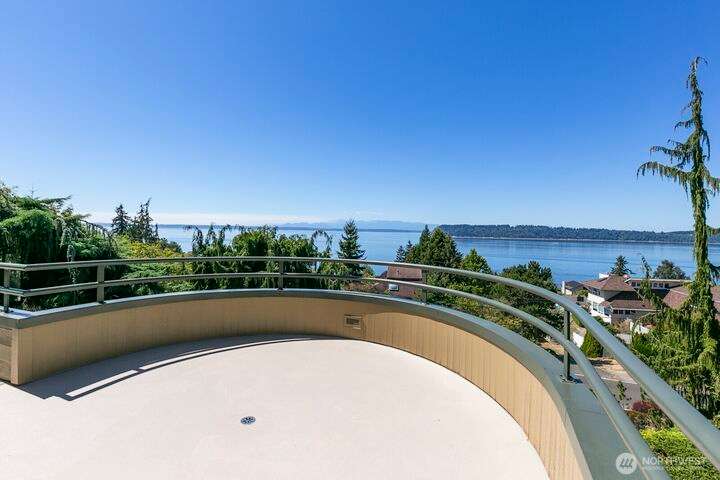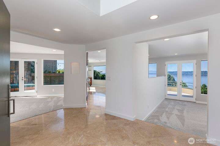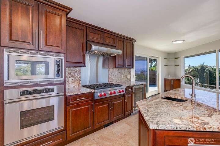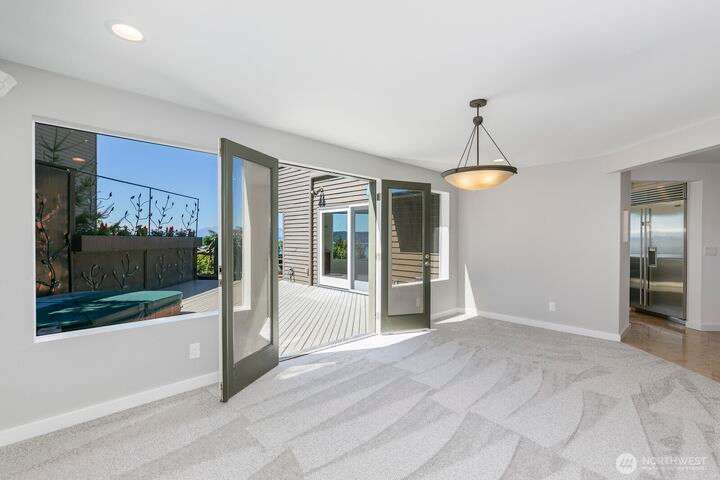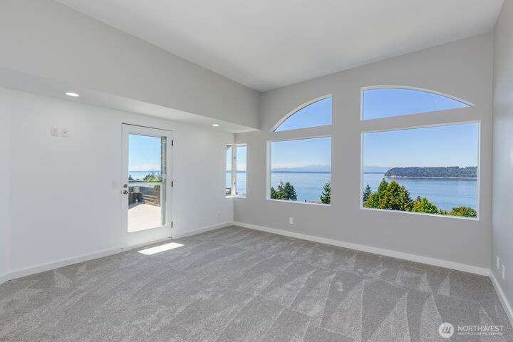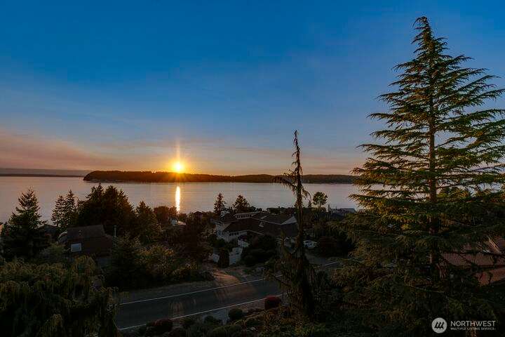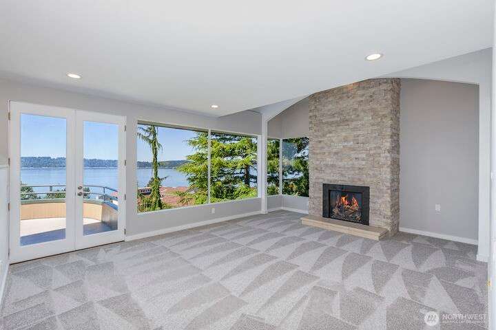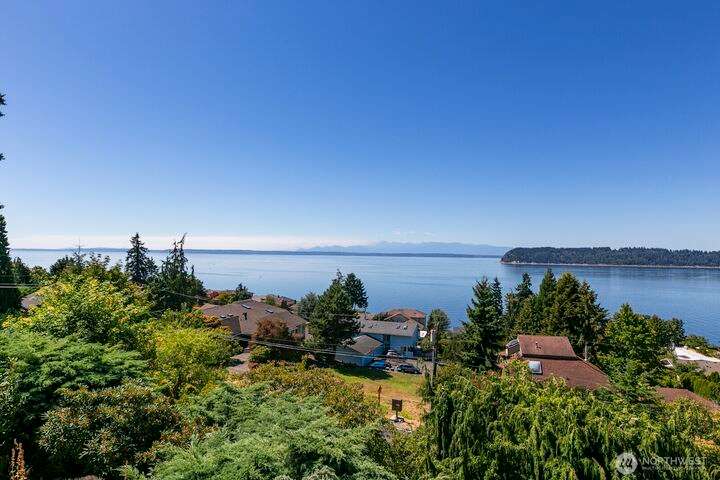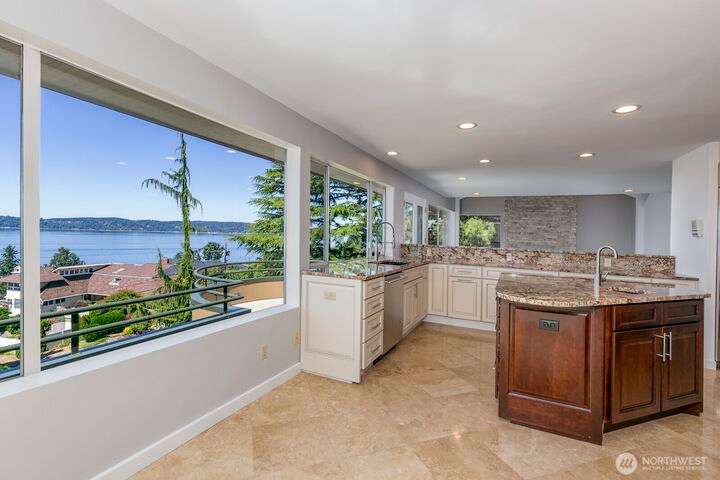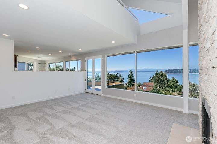 Quintessential NW Contemporary with a truly fabulous view to the west - the Olympics, Admiralty Inlet, shipping lanes + gorgeous sunsets. Tall ceilings, open spaces, not a cookie cutter home. 2nd floor primary w/private deck + office, full totally remodeled bath w/ porcelain tile & walk in closet. Main level family room or dining room, you choose, eating space in the island kitchen. The island kitchen has SS appliances, wine refer, Wolf, Dacor, Sub Zero, GE Profile, stone counters, new cabinets, travertine tile on the main, marble tile on lower, home just painted inside-out, new carpet, each level has in floor hot water heat which is super comfy, 2 mini-splits upstairs, close to shopping and Kamiak HS! Floor to ceiling stone gas fireplace.