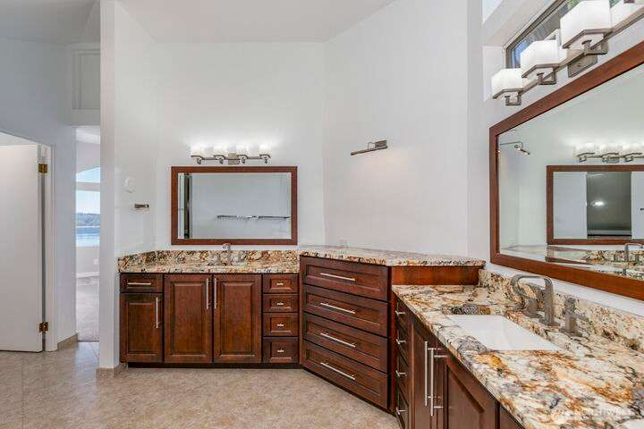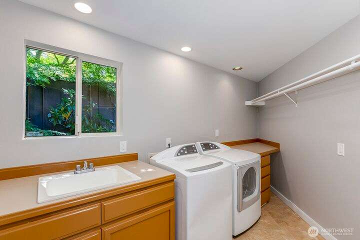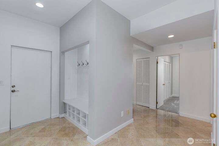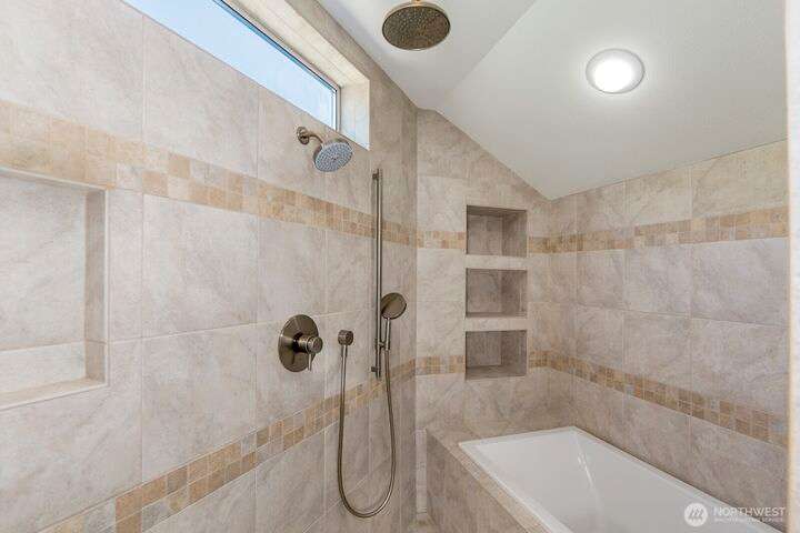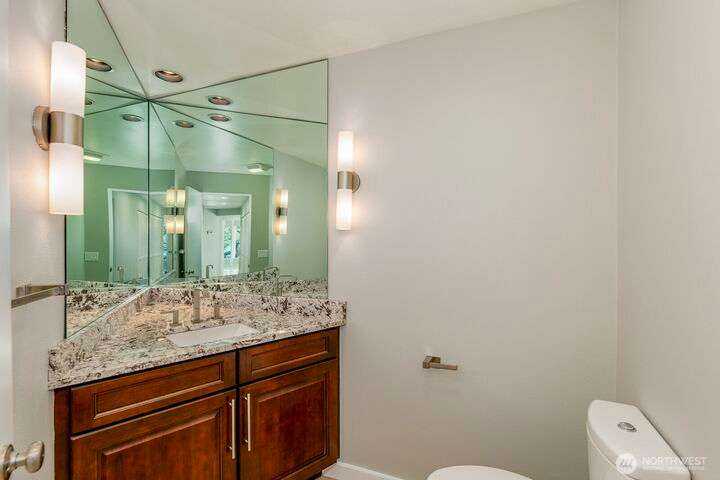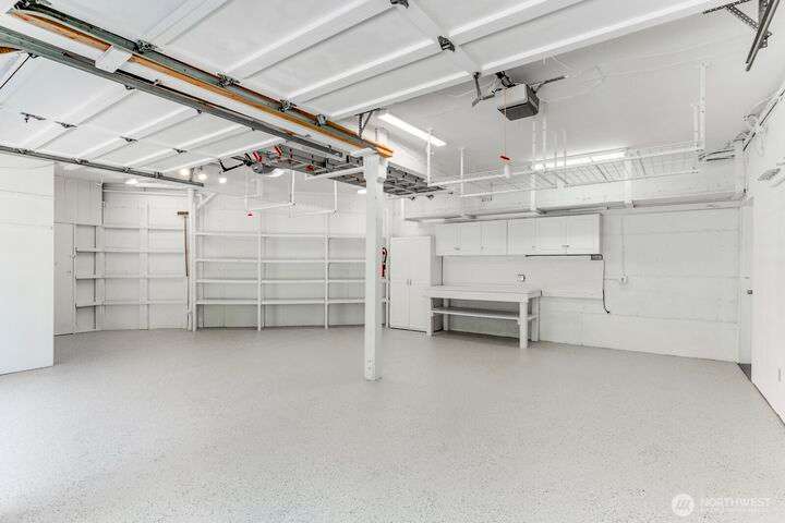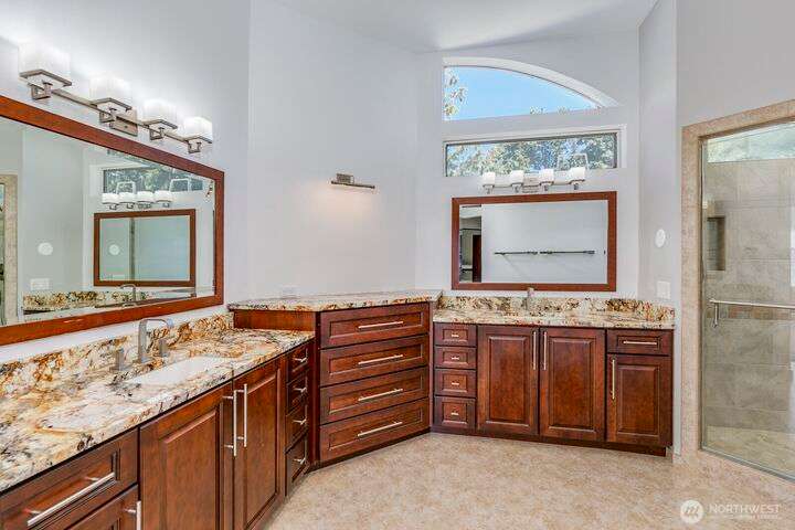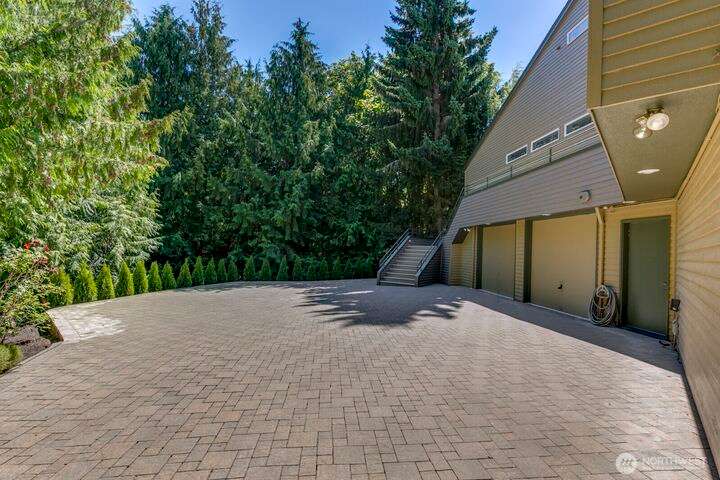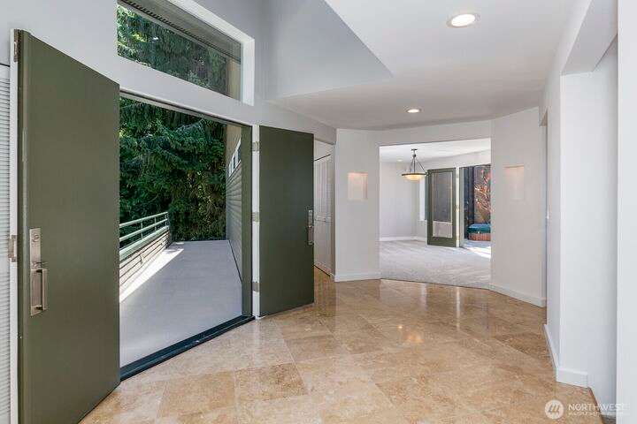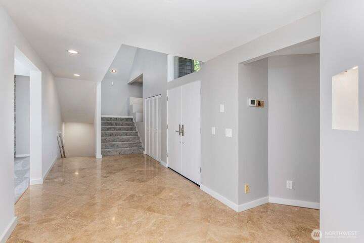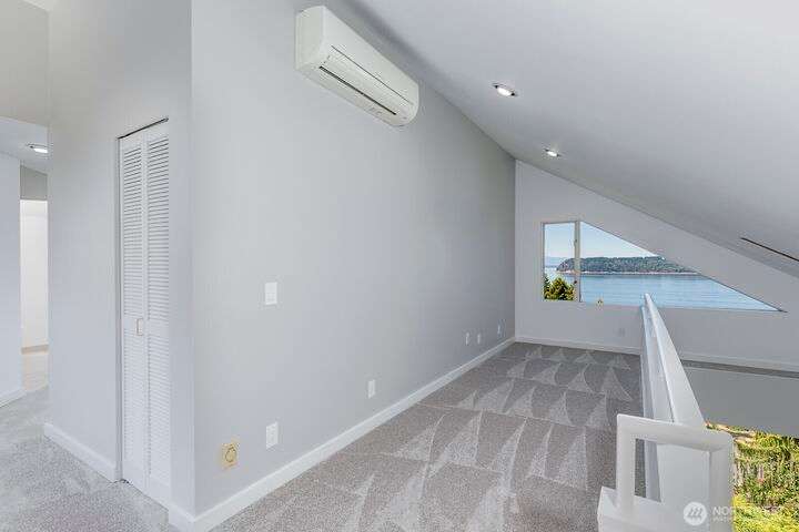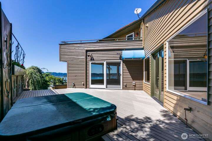 Quintessential NW Contemporary with a truly fabulous view to the west - the Olympics, Admiralty Inlet, shipping lanes + gorgeous sunsets. Tall ceilings, open spaces, not a cookie cutter home. 2nd floor primary w/private deck + office, full totally remodeled bath w/ porcelain tile & walk in closet. Main level family room or dining room, you choose, eating space in the island kitchen. The island kitchen has SS appliances, wine refer, Wolf, Dacor, Sub Zero, GE Profile, stone counters, new cabinets, travertine tile on the main, marble tile on lower, home just painted inside-out, new carpet, each level has in floor hot water heat which is super comfy, 2 mini-splits upstairs, close to shopping and Kamiak HS! Floor to ceiling stone gas fireplace.