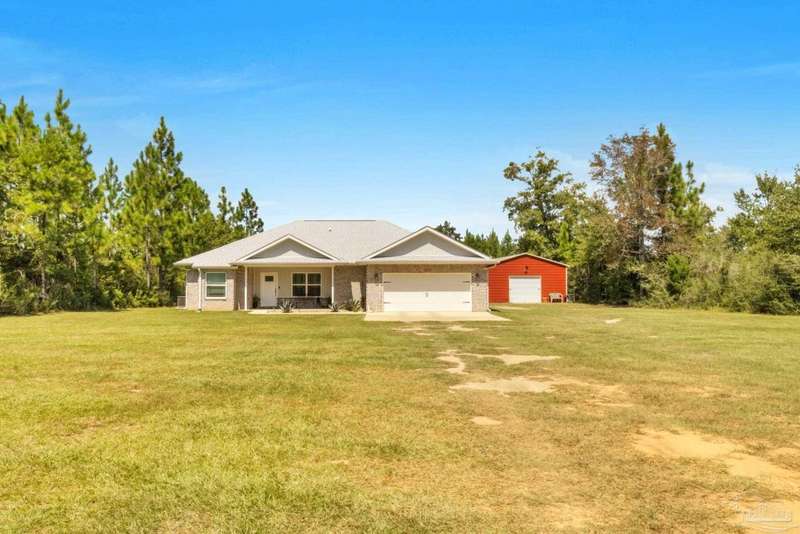 Welcome to this breathtaking brownstone brick custom-built home, completed in November 2024, located on a sprawling 2.66-acre lot in the highly sought-after Pace, Florida. With impeccable attention to detail, this home blends modern luxury with practicality, offering the perfect retreat for both relaxation and entertainment. The home comes equipped with a smart doggy door, ensuring convenience for your furry family members, while the entire home is designed with modern, easy-to-use technology that enhances daily living. The chef's kitchen features sleek granite countertops, perfect for meal prep, with ample storage and a layout that flows seamlessly into the rest of the home. The spacious master suite offers a private sanctuary, complete with oversized his and her walk-in closets. A spa-like master bath provides the ultimate place to unwind after a long day. The property includes a 24x36 metal building with electric, providing ample space for a workshop, storage, or additional vehicles. The possibilities are endless! Also included with this home is a 30 AMP Hookup as well as sewage for an RV! Situated just a short drive from Pensacola Beach, you'll have quick access to white sandy shores and the Gulf Coast's stunning waters. Plus, the natural beauty of Blackwater River is right at your doorstep, offering endless opportunities for outdoor recreation, from kayaking to hiking. Whether you're looking for a peaceful retreat or a place that's close to everything, this home provides the best of both worlds. Schedule your tour today and see for yourself why this is the ideal place to call home! Seller will provide a 1 year Home Warranty and will contribute to closing costs. Ask an agent for details.
