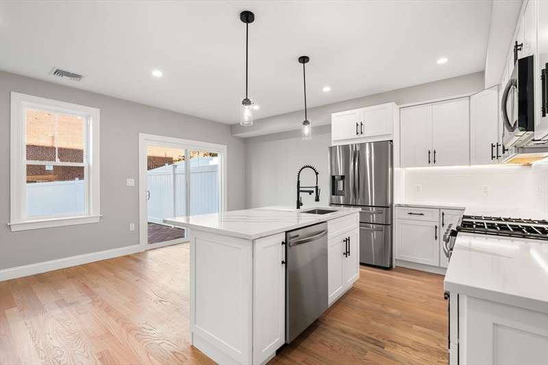 Located in the heart of Weymouth Landing s exciting redevelopment, 9 Vine Street presents a rare opportunity to own one of four brand-new townhomes designed for modern living. Each unit spans three thoughtfully planned levels and includes a private one-car garage and rear patio perfect for relaxing or entertaining outdoors. The main level boasts an open-concept layout anchored by a stylish kitchen with white cabinetry, gray-veined quartz countertops, and a center island ideal for gatherings. Upstairs, the spacious primary suite features a tiled en suite bath and generous closet space, complemented by two additional bedrooms, a full guest bath, and a dedicated laundry room. The top floor offers a large, flexible bonus room with wall-to-wall carpeting ideal as a family room, playroom, or home theater. Experience comfort, style, and convenience in one of Weymouth s most vibrant and evolving neighborhoods.