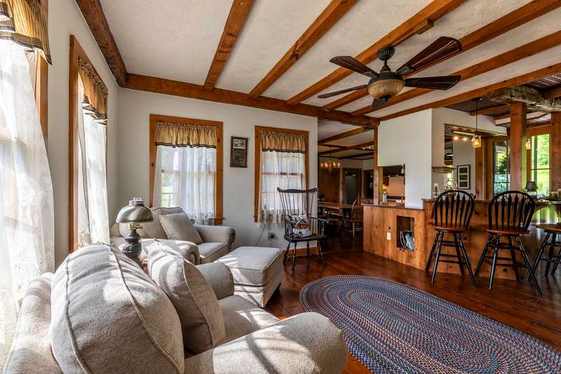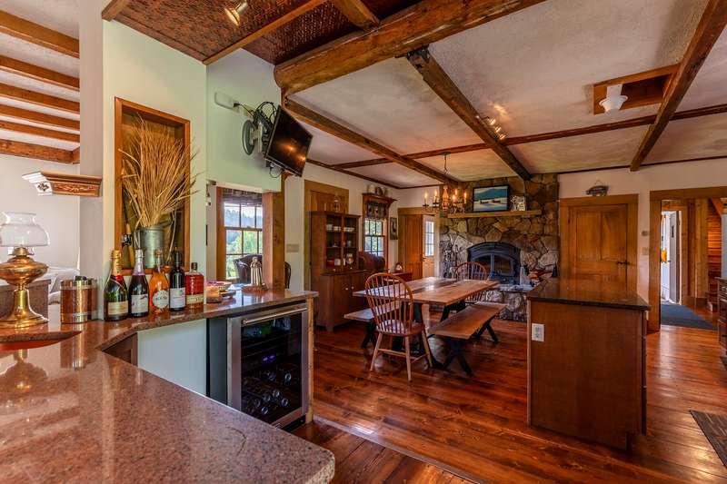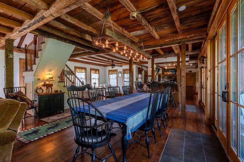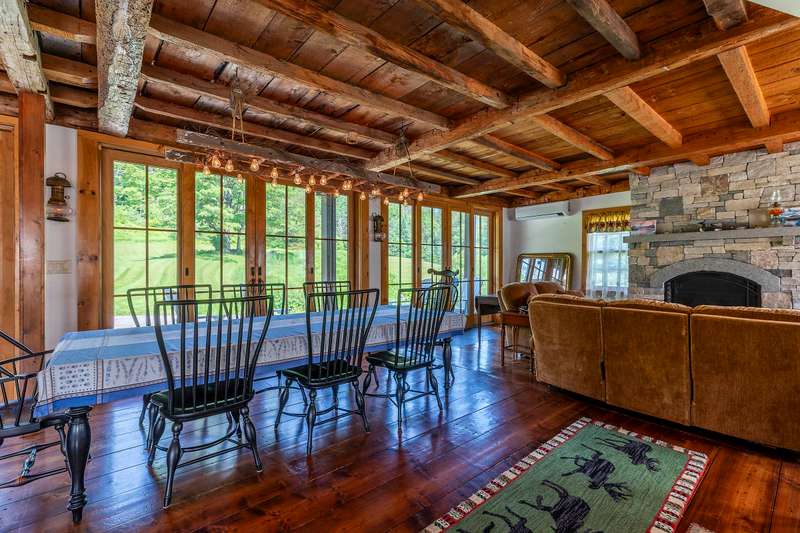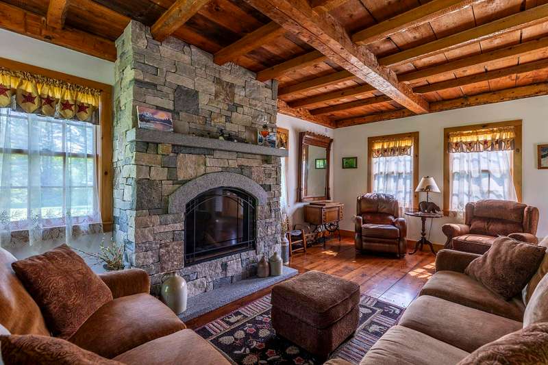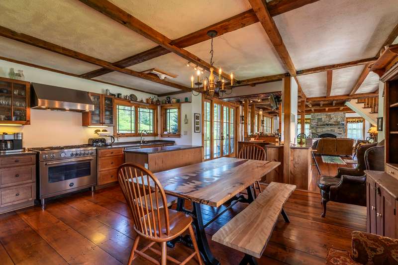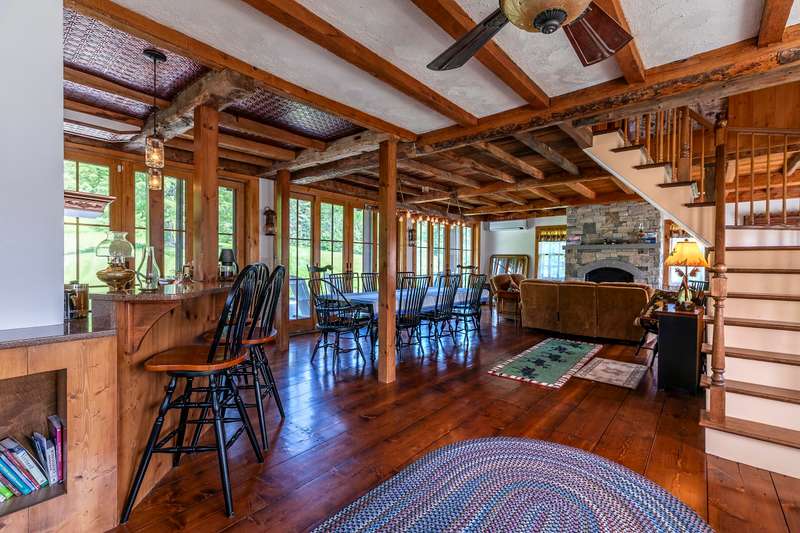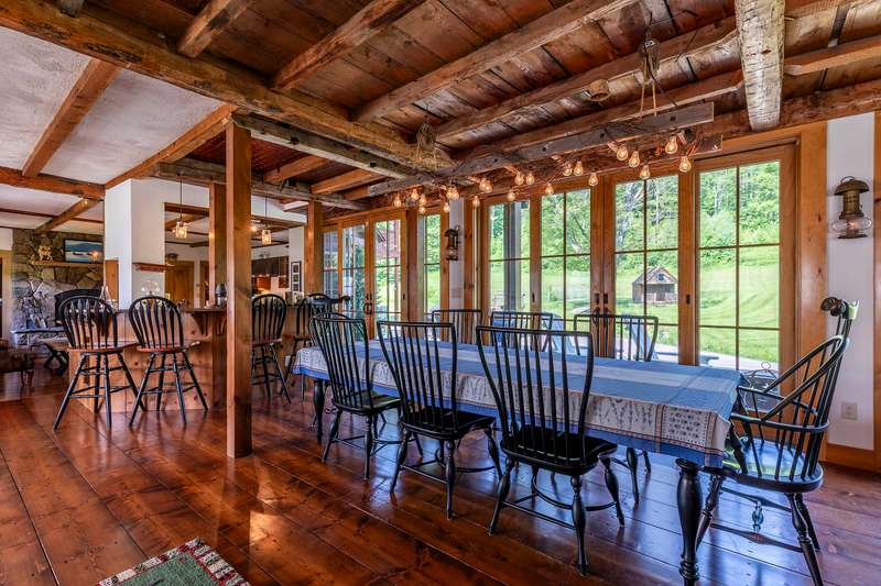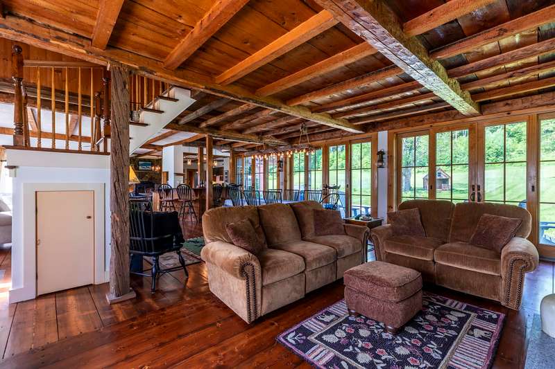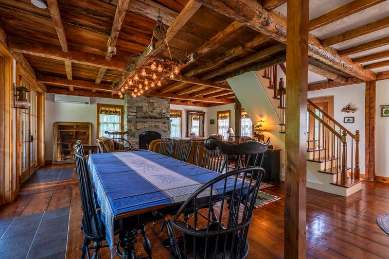Experience timeless elegance and modern luxury in this exquisitely renovated 1834 farmhouse, gracefully sited on one of Cavendish s most sought-after country roads. Thoughtfully updated while preserving its historic charm, this extraordinary residence features a state-of-the-art chef s kitchen, whole house a/c and an expansive open-concept main level adorned with original hand-hewn beams and architectural character throughout. French doors lead to an oversized deck, ideal for alfresco entertaining, with sweeping views of the serene swimming pond and pastoral fields. Choose between the warmth of a classic stone hearth wood-burning fireplace or the ease of a sophisticated new propane fireplace for the perfect apr s-ski ambiance. The home offers a luxurious primary suite and three additional en-suite guest rooms, ensuring comfort and privacy for all. A spacious media and bunkroom above the attached three-bay garage, along with a fully finished lower-level game room, provide exceptional sp
