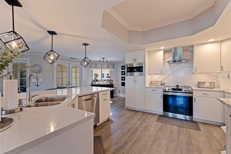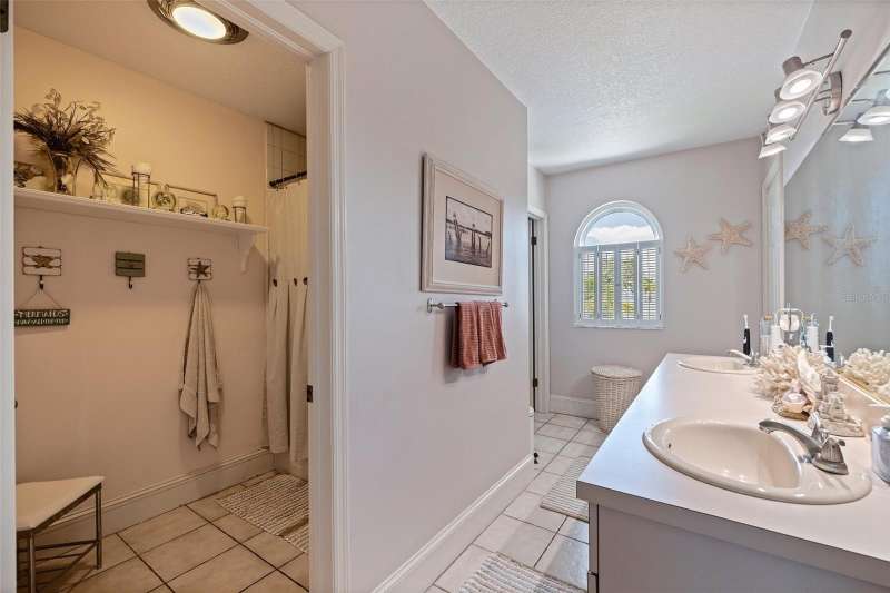 ISLAND LIVING ON AN OVERSIZED CORNER LOT!! This expansive, four-bedroom elevated residence offers generous living and entertaining spaces, set on a rare oversized corner lot in a sought-after island community. While not waterfront, the upper levels reveal partial views of Tampa Bay, enjoyed from the new high impact windows and multiple vantage points throughout the home. As you arrive, the oversized circular paved driveway welcomes you home. Ascend the elegant front staircase to the newly installed high-impact rated front door, a great entry point leads into a contemporary, sunlit, open floor plan featuring high ceilings. Thoughtful interior flow seamlessly connecting your formal dining room, spacious living area, and an elegantly freshly updated kitchen with white cabinetry, quartz countertops, pull-out drawers, and new stainless appliances. Large island allows for comfortable breakfast bar seating. The adjoining family room, with its cozy wood-burning fireplace and new window treatments, flows seamlessly to the relaxing outdoor balcony overlooking the lushly landscaped yard and oversize pool. The main level includes a guest bedroom (or office) with adjacent full bath, while the oversized primary suite boasts balcony access, a generous walk-in closet, and a spa-inspired bath with Jacuzzi tub and large walk-in shower. Upstairs, you’ll find two additional bedrooms with its own closets, a full bath, and a secondary living area—ideal for lounging, watching tv or use as a game room. Beautiful views or Tampa Bay from the top floor! The ground floor offers over 2300sf of an impressive multi-car garage with workshop, bonus room, and direct access to the pool with spa and shaded patio, creating a perfect space for hobbies or entertaining. Ideally located just 15 minutes from downtown St. Petersburg and close to award-winning beaches and dining, this beautifully maintained home offers the space, flexibility, and lifestyle of true island living.