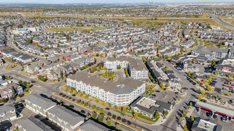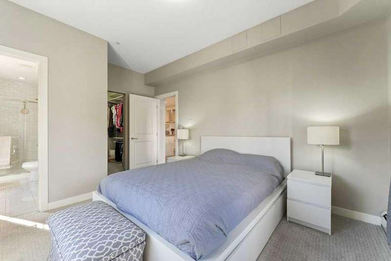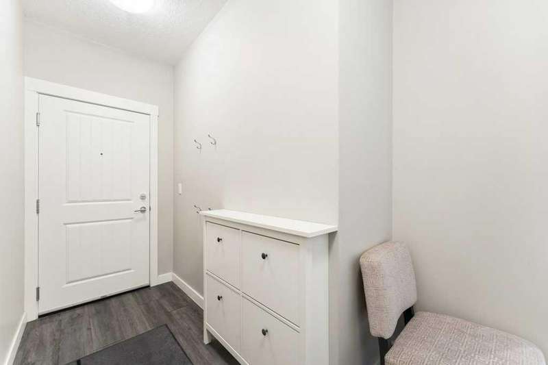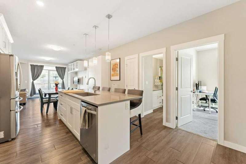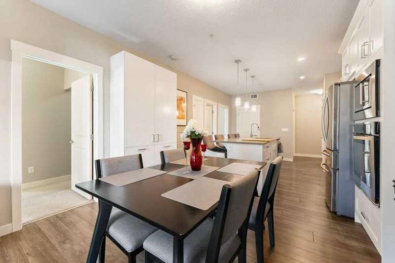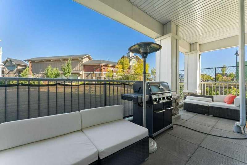 Welcome to this executive 2-bedroom, 2-bath condo in the desirable lake community of Auburn Bay! This superior Muskoka main floor corner unit is the largest floorplan in the building’s design, and with 9-foot high ceilings, it offers a spacious, light-filled layout that truly stands out. This Condo is perfect for those who are looking to downsize without compromising space and storage. From the moment you step inside, the large foyer sets the tone with plenty of room to welcome family and guests. The luxury vinyl plank flooring flows seamlessly into the beautifully upgraded kitchen, featuring an oversized quartz island with farmhouse-style undermount sink—perfect for extra seating and casual dining. The kitchen is a chef’s dream with: upgraded stainless steel appliance package (including built-in wall oven & microwave), Ceramic cooktop range with hood fan, refrigerator with water line, 42" upper cabinets, pot drawers & under-cabinet lighting, and Bonus extra cabinetry on the opposite wall. The bright, modern color palette makes this space both functional and stylish. There’s also plenty of room for a full dining table, so you don’t have to compromise on entertaining. The spacious living room is enhanced with custom shelving and cabinetry for storage and a perfect TV nook. From here, step out onto your expansive covered patio with a gas BBQ line—ideal for year-round outdoor enjoyment. The primary suite is a true retreat, benefiting from corner-unit windows that flood the room with natural light. The spa-inspired ensuite features: Dual undermount vanities with quartz counters, Walk-in glass shower with full-height designer tile and walk-in closet for ample storage. The second bedroom is bright and versatile, with a cheater door to the second full bathroom, which boasts matching quartz counters and upgraded finishes. Also included is your own in suite laundry with full sized stacked washer and dryer, (1) Titled underground heated parking stall, an assigned storage locker conveniently located right in front of your parking spot, plenty of visitor parking. Best of all, this building is PET FRIENDLY and just steps to shops, groceries, dining, and more. Plus, as part of the Auburn Bay community, you’ll enjoy exclusive year-round lake access—swimming, skating, paddleboarding, or simply relaxing at the beach. This rare floorplan doesn’t come to market often—don’t miss your opportunity to call it home!