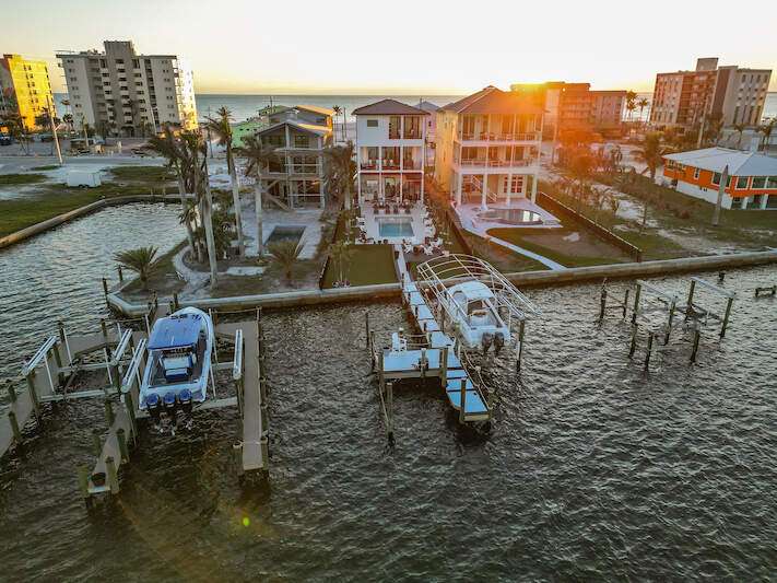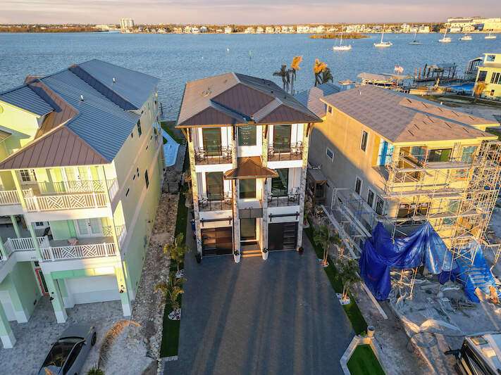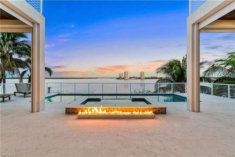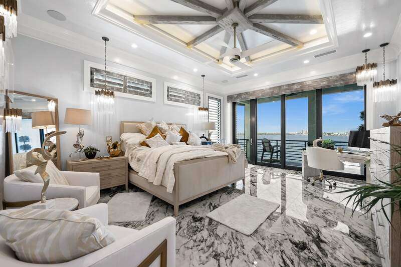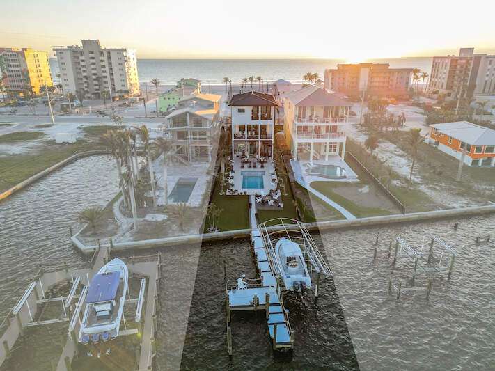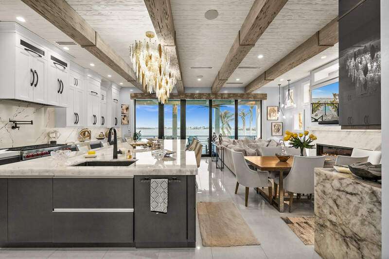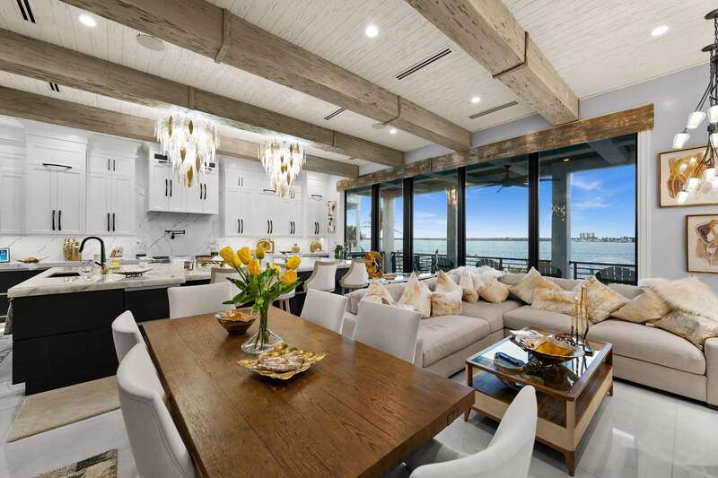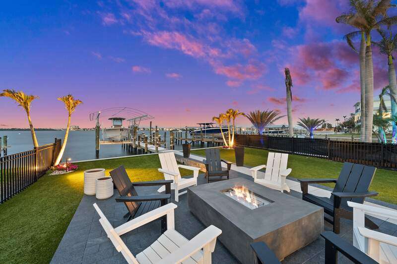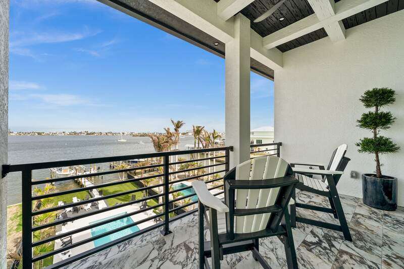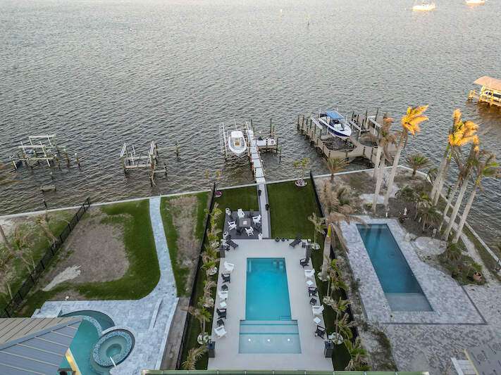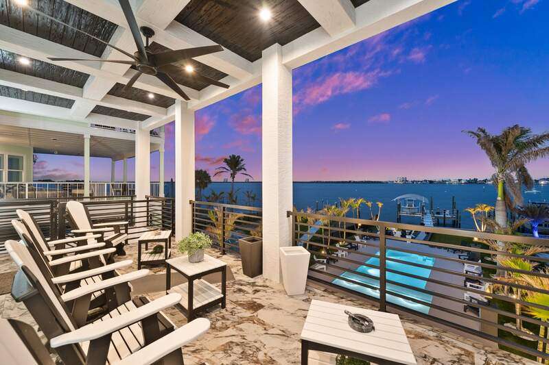 441 seamlessly merges modern luxury with coastal elegance while featuring 4 bedrooms and 4 bathrooms. This architectural masterpiece is designed for those who demand the unparalleled. Elevated to perfection, this home features 30-inch reinforced concrete slabs, PGT windows with advanced tinted glass, 2 Insta-hot Water Heaters, and a robust 24-gauge standing seam metal roof. The expansive bayside veranda offers panoramic views of San Carlos Bay and radiant sunrises. Inside, a symphony of curated details creates an ambiance of refined elegance. Architectural resin pecky cypress beam ceilings, monolithic quartzite slab surfaces, and Lauriermax cabinetry add depth and texture. A Sonos entertainment system, smart-controlled blinds, and a full-spectrum LED lighting design enhance modern living. The gourmet culinary space is a showpiece, with a Wolf gas 6-burner stove, Sub-Zero panel refrigerator, quartzite surfaces, and integrated barista system. The living and dining areas are adorned with polished 24"x48" flooring, custom cabinetry, interior gas fireplace, and unobstructed bayfront views. 2 Guest bedrooms offer luxury en-suite baths, while all bathrooms are highlighted by quartzite counters, custom cabinetry, and spa-like showers. All bedrooms offer a private balcony. The owner's suite features a hydrotherapy jet tub, walk-in wardrobe, custom finishes and serene views of the Bay. The exterior is a private oasis with an alfresco culinary space including roll down screens and shutters, a pool featuring custom underwater seating, Outdoor fire pit, Florida landscaping with artificial grass (no cutting!) plus Native palm trees and plants with hydration system. Walk out to the high-performance dock with 2 boat lifts: one up to 15,000 lbs and one up to 6,000lbs, and a brand new seawall! The intricate details and bespoke appointments are abundant, defying description-A true masterpiece that must be experienced to be fully appreciated.