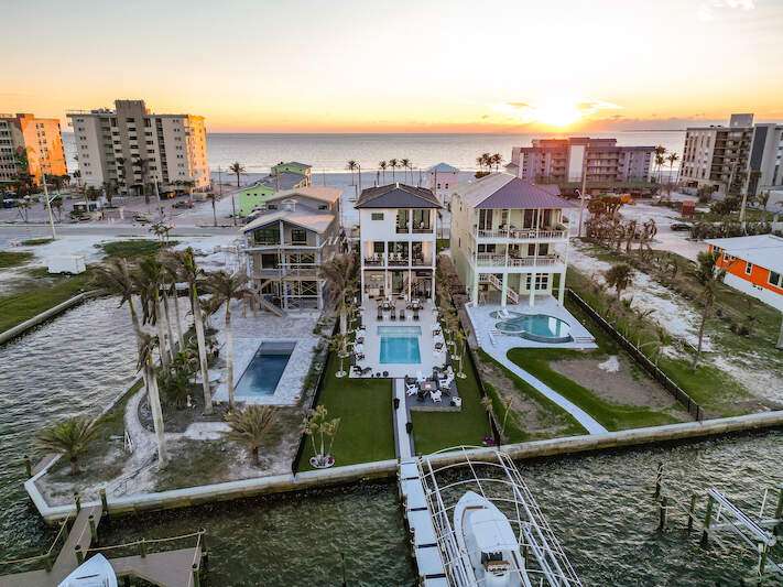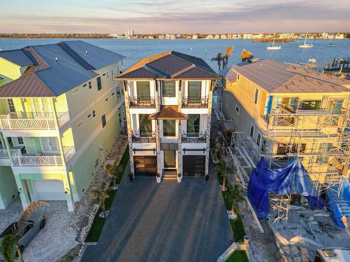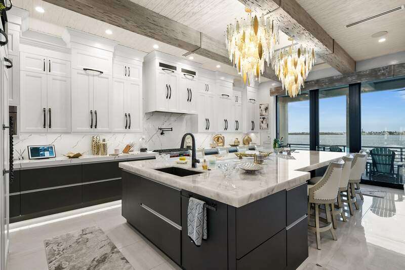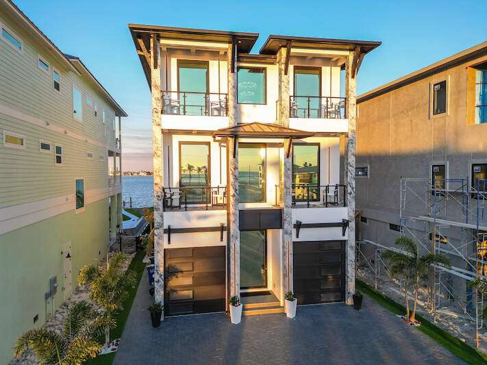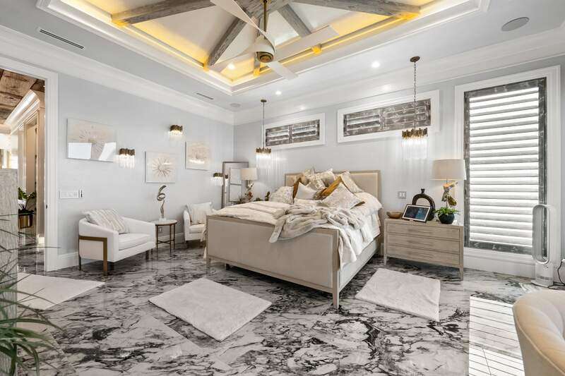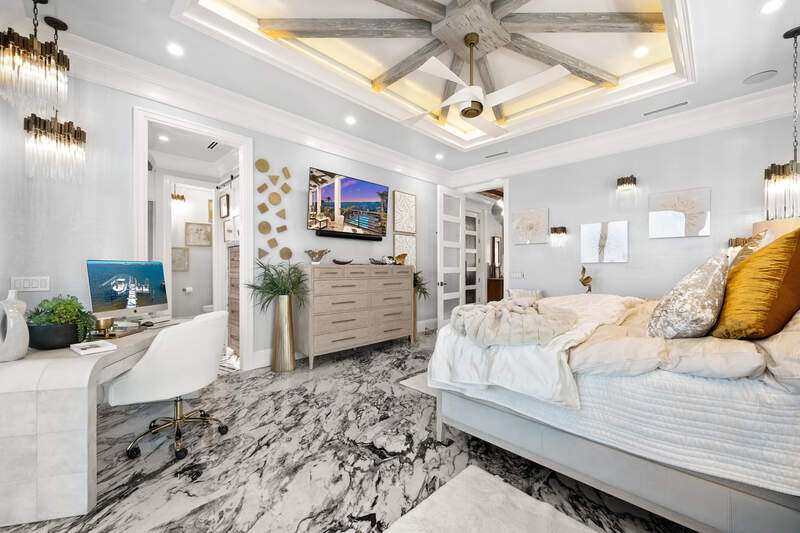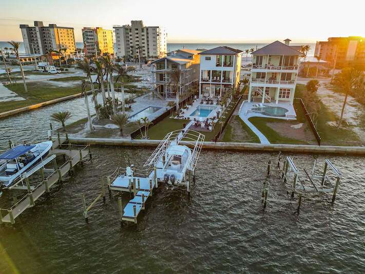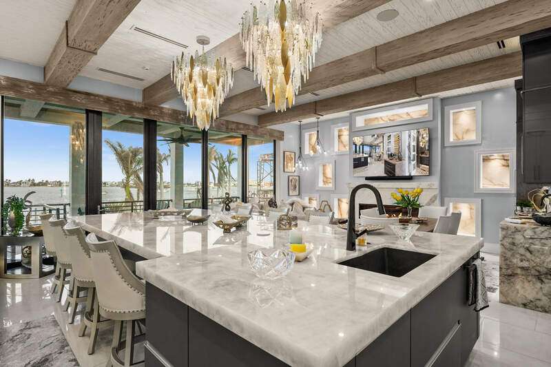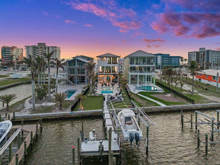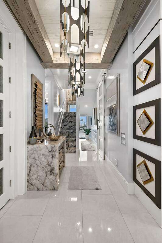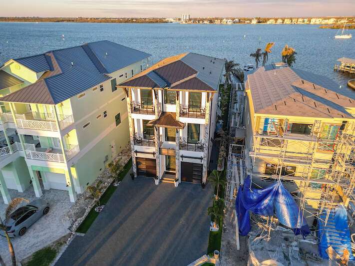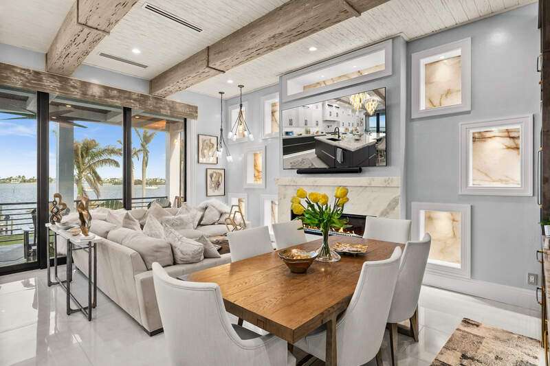 441 seamlessly merges modern luxury with coastal elegance while featuring 4 bedrooms and 4 bathrooms. This architectural masterpiece is designed for those who demand the unparalleled. Elevated to perfection, this home features 30-inch reinforced concrete slabs, PGT windows with advanced tinted glass, 2 Insta-hot Water Heaters, and a robust 24-gauge standing seam metal roof. The expansive bayside veranda offers panoramic views of San Carlos Bay and radiant sunrises. Inside, a symphony of curated details creates an ambiance of refined elegance. Architectural resin pecky cypress beam ceilings, monolithic quartzite slab surfaces, and Lauriermax cabinetry add depth and texture. A Sonos entertainment system, smart-controlled blinds, and a full-spectrum LED lighting design enhance modern living. The gourmet culinary space is a showpiece, with a Wolf gas 6-burner stove, Sub-Zero panel refrigerator, quartzite surfaces, and integrated barista system. The living and dining areas are adorned with polished 24"x48" flooring, custom cabinetry, interior gas fireplace, and unobstructed bayfront views. 2 Guest bedrooms offer luxury en-suite baths, while all bathrooms are highlighted by quartzite counters, custom cabinetry, and spa-like showers. All bedrooms offer a private balcony. The owner's suite features a hydrotherapy jet tub, walk-in wardrobe, custom finishes and serene views of the Bay. The exterior is a private oasis with an alfresco culinary space including roll down screens and shutters, a pool featuring custom underwater seating, Outdoor fire pit, Florida landscaping with artificial grass (no cutting!) plus Native palm trees and plants with hydration system. Walk out to the high-performance dock with 2 boat lifts: one up to 15,000 lbs and one up to 6,000lbs, and a brand new seawall! The intricate details and bespoke appointments are abundant, defying description-A true masterpiece that must be experienced to be fully appreciated.