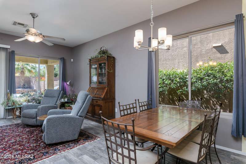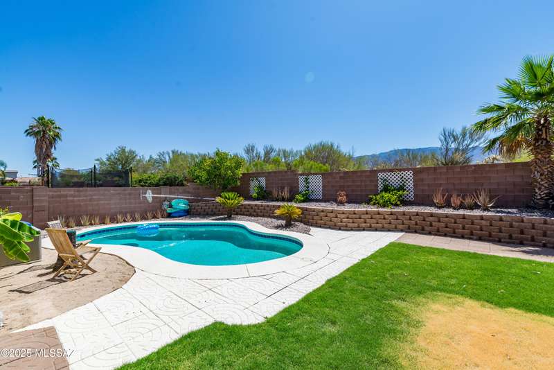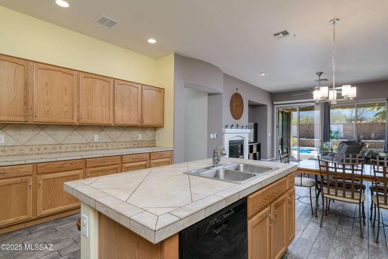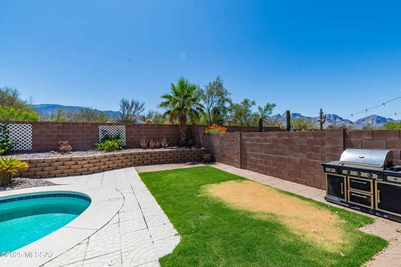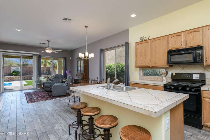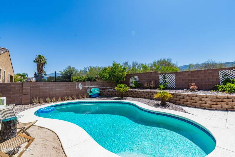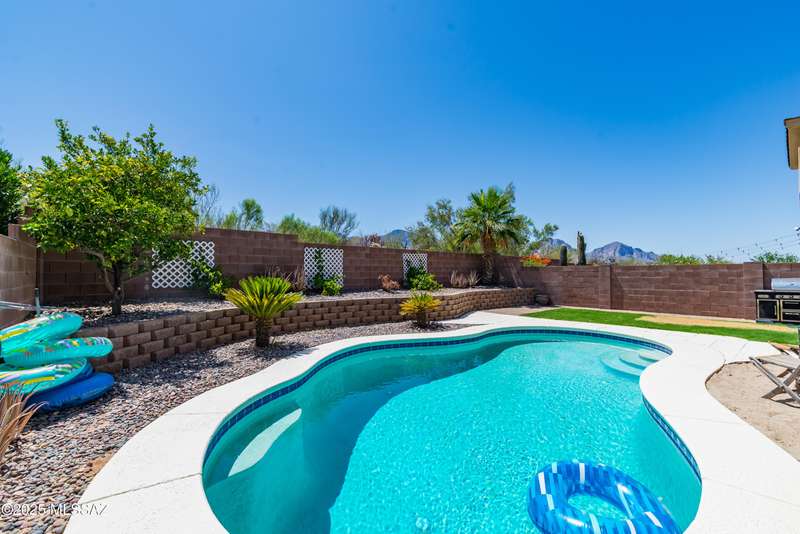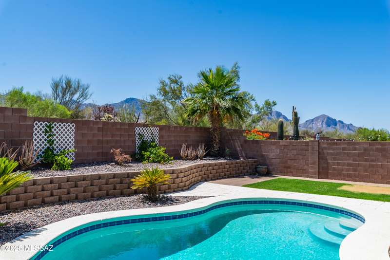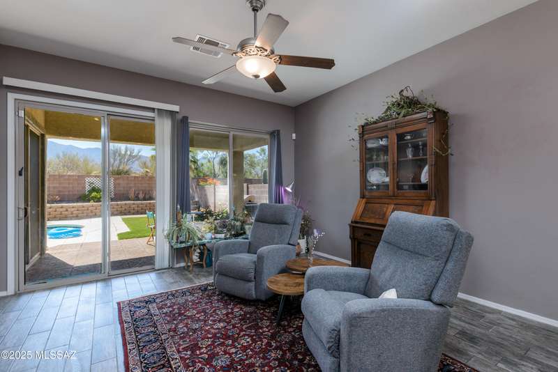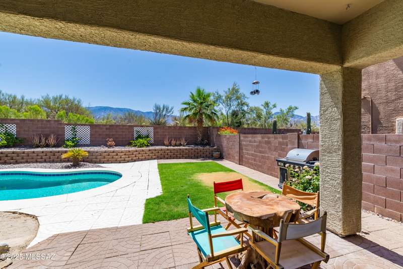 Mountain Views front and back from this immaculate 3-Bedroom, 2-Bath, 2-Car Garage home, with pool. Kitchen features a 5-burner gas stove, tiled countertop island with sink and breakfast bar, plenty of lite oak kitchen cabinets for storage, along with pull-out shelving in lower cabinets. Buffet upper and lower cabinets increase the storage. Plank tile flooring throughout, with carpet in guest bedrooms and living room. Fans in every room, high ceilings, updated interior paint and lighting. Gas log fireplace. Primary suite features a good-sized office area, workout room, crafting area or nursery, a walk-in closet, and separate shower and tub. Sliding glass doors from the family room and primary bedroom lead to the covered patio, just steps away from the heated pool with mountain views.