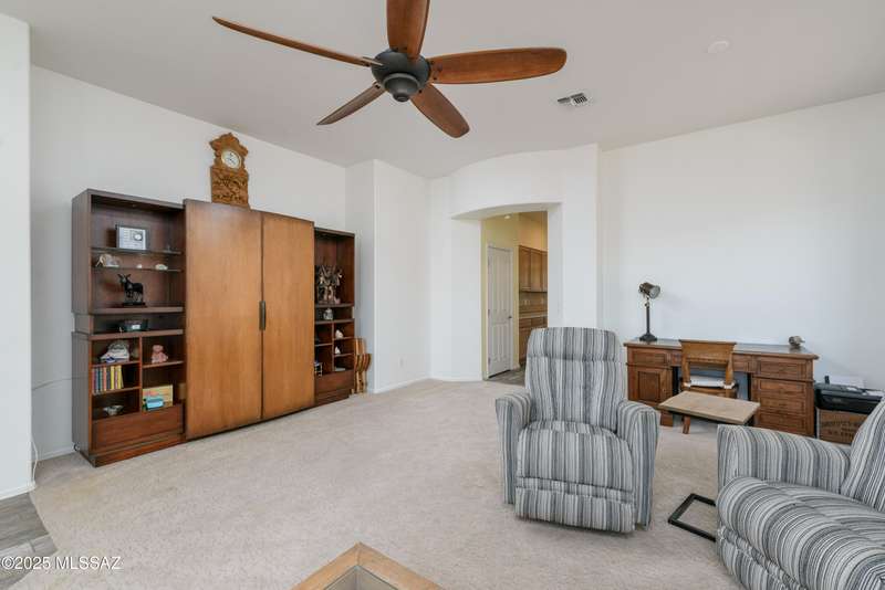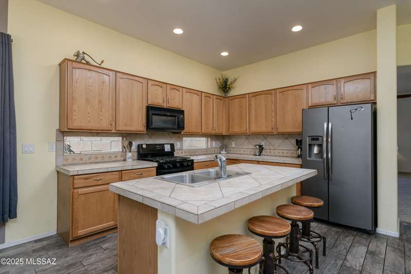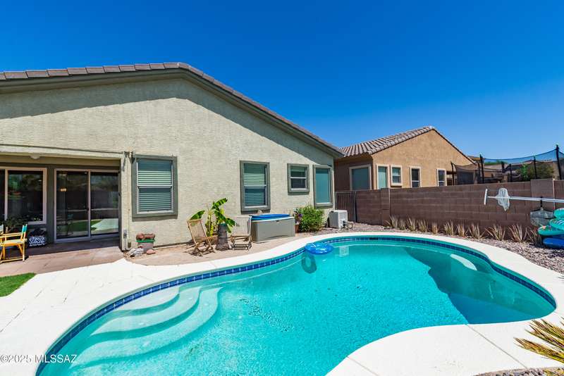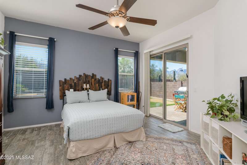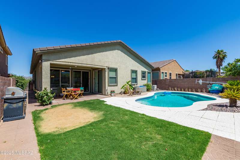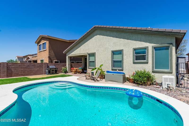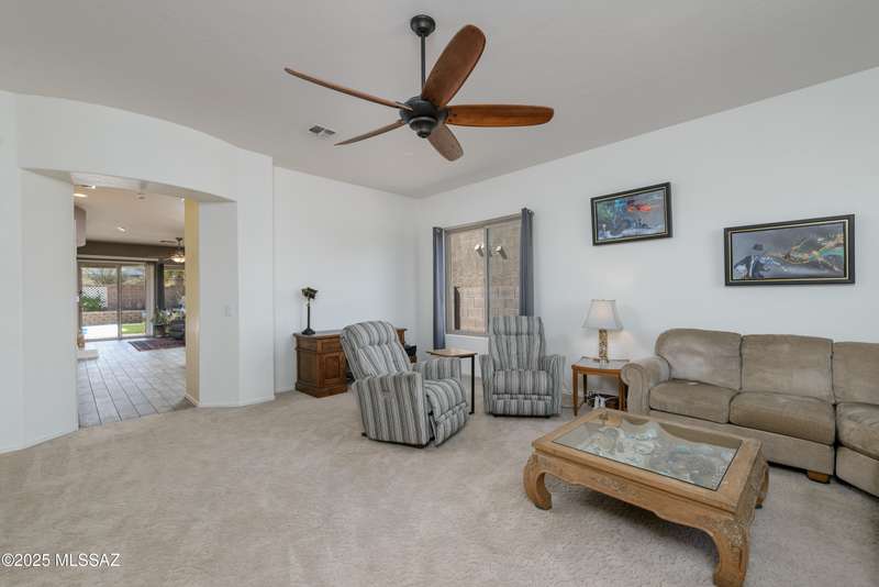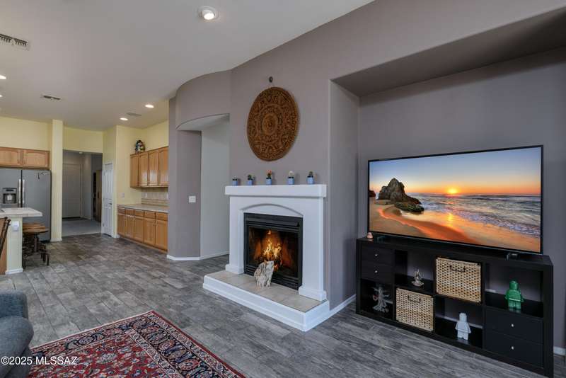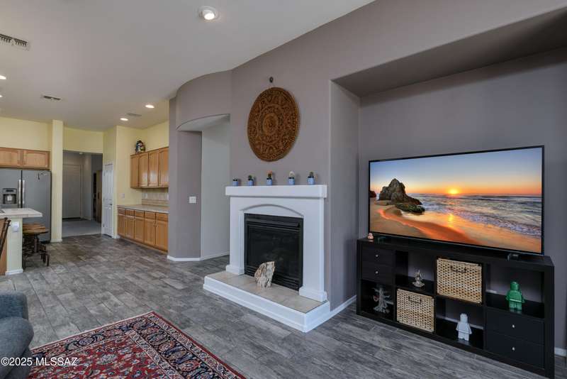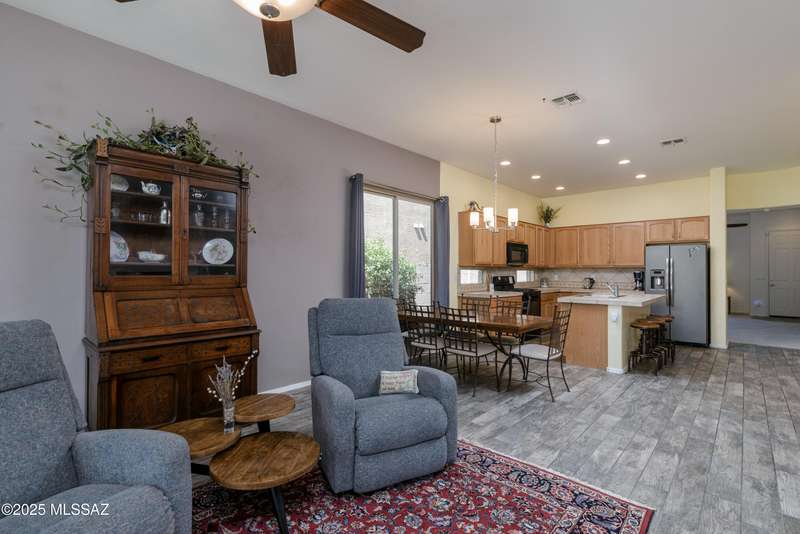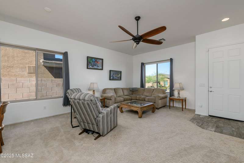 Mountain Views front and back from this immaculate 3-Bedroom, 2-Bath, 2-Car Garage home, with pool. Kitchen features a 5-burner gas stove, tiled countertop island with sink and breakfast bar, plenty of lite oak kitchen cabinets for storage, along with pull-out shelving in lower cabinets. Buffet upper and lower cabinets increase the storage. Plank tile flooring throughout, with carpet in guest bedrooms and living room. Fans in every room, high ceilings, updated interior paint and lighting. Gas log fireplace. Primary suite features a good-sized office area, workout room, crafting area or nursery, a walk-in closet, and separate shower and tub. Sliding glass doors from the family room and primary bedroom lead to the covered patio, just steps away from the heated pool with mountain views.