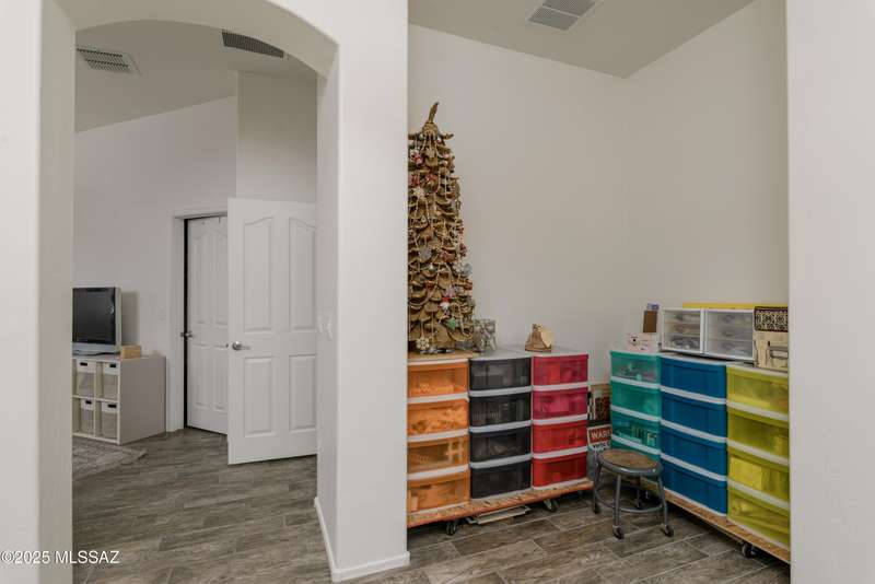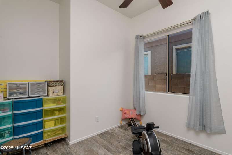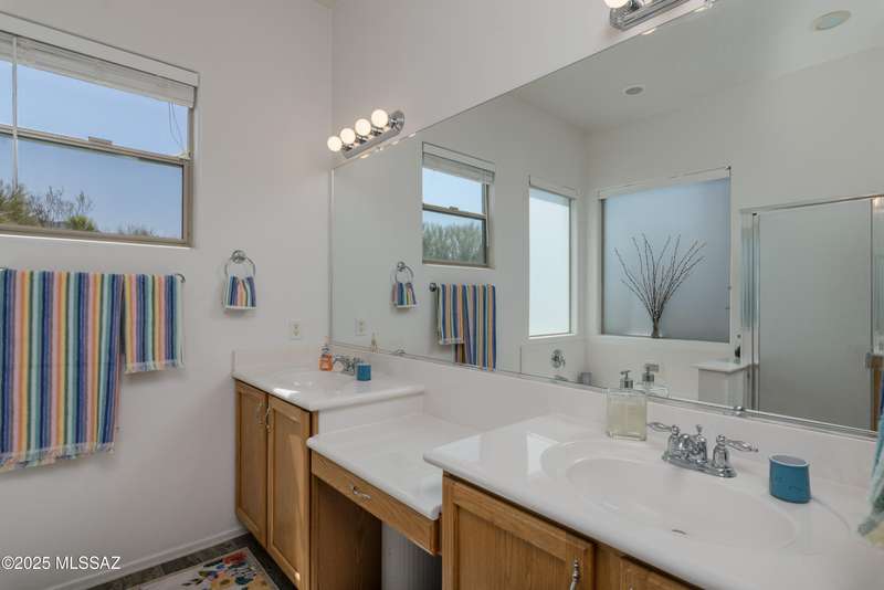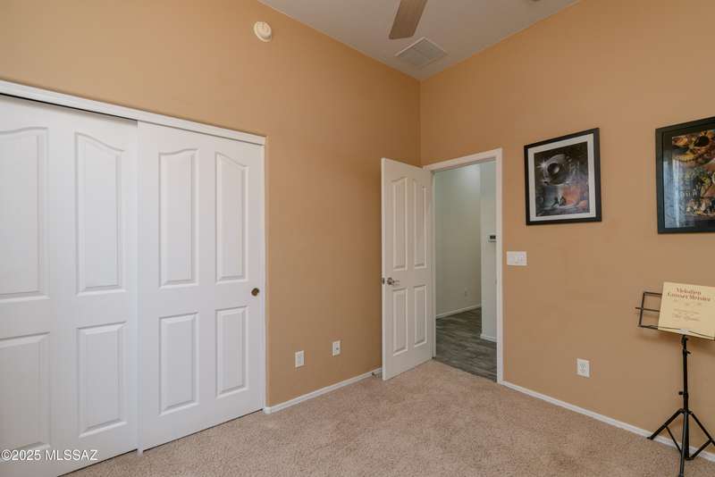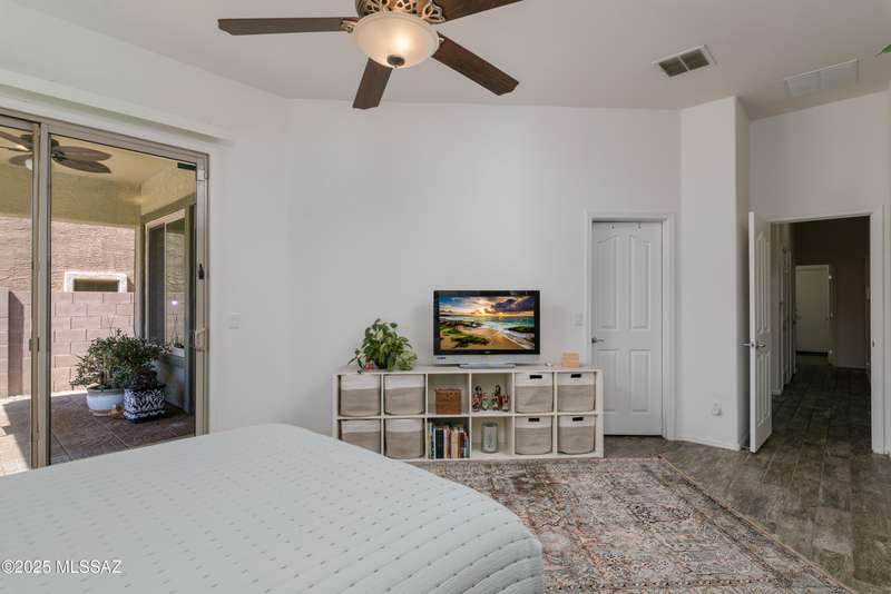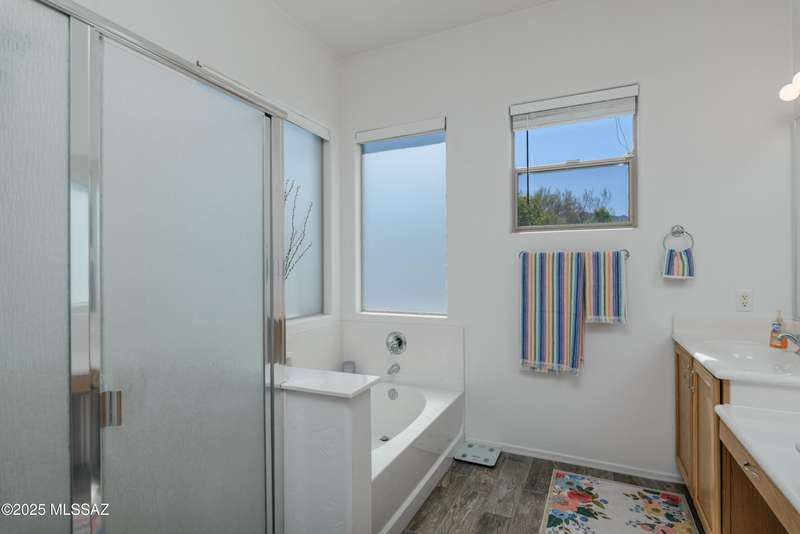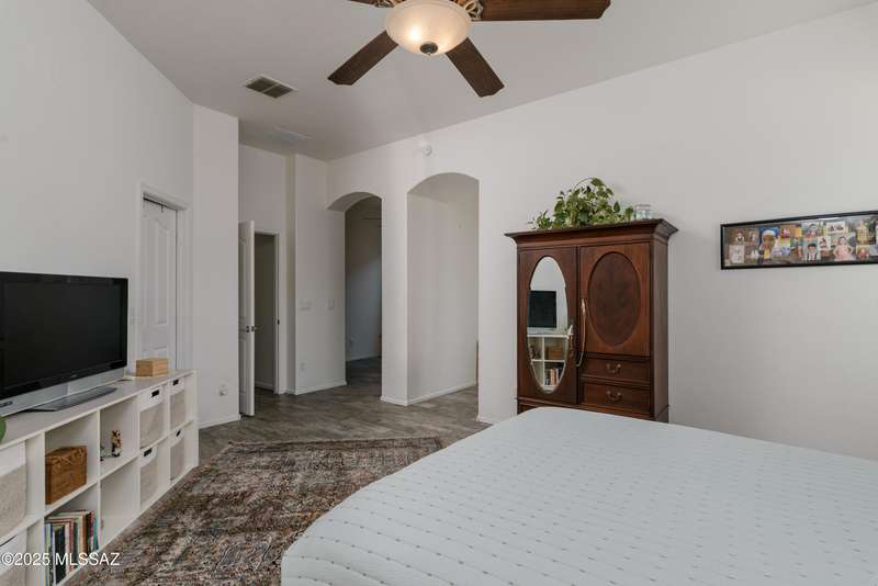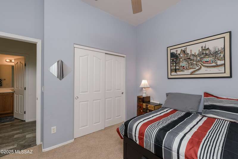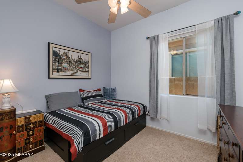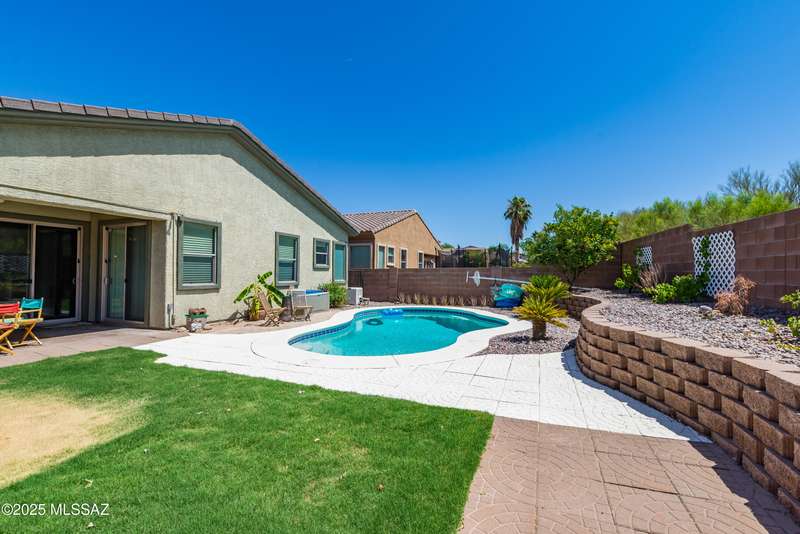 Mountain Views front and back from this immaculate 3-Bedroom, 2-Bath, 2-Car Garage home, with pool. Kitchen features a 5-burner gas stove, tiled countertop island with sink and breakfast bar, plenty of lite oak kitchen cabinets for storage, along with pull-out shelving in lower cabinets. Buffet upper and lower cabinets increase the storage. Plank tile flooring throughout, with carpet in guest bedrooms and living room. Fans in every room, high ceilings, updated interior paint and lighting. Gas log fireplace. Primary suite features a good-sized office area, workout room, crafting area or nursery, a walk-in closet, and separate shower and tub. Sliding glass doors from the family room and primary bedroom lead to the covered patio, just steps away from the heated pool with mountain views.
