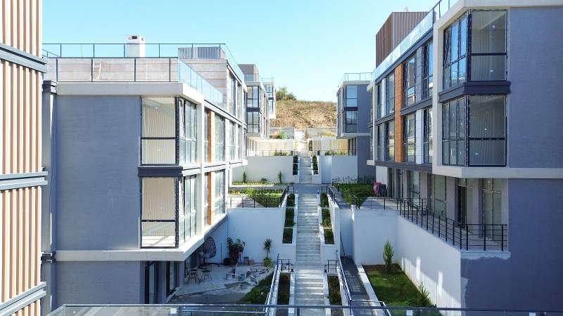 Built on a 4.864 m² plot, the project has a total of 50 independent sections, three of which are commercial. The apartments offer high investment value due to their proximity to all amenities and being located right behind the New Education and Research Hospital. There are two types of apartments in the project, 2 bedroom and 3 bedroom. The apartments have balconies and en-suite bathrooms. Built-in set is ready in all apartments. In the project produced with first-class workmanship; There is a pool, indoor parking lot, playground and storage area for the apartments. The open terrace area in all blocks of the project is a common use area for the apartment owners. There is a 40 m² terrace right per apartment. In the terrace area, which can be used as a relaxation and entertainment area, you can enjoy the tranquility with sea and city views.