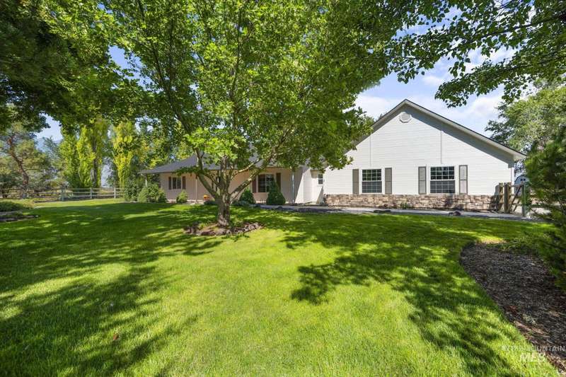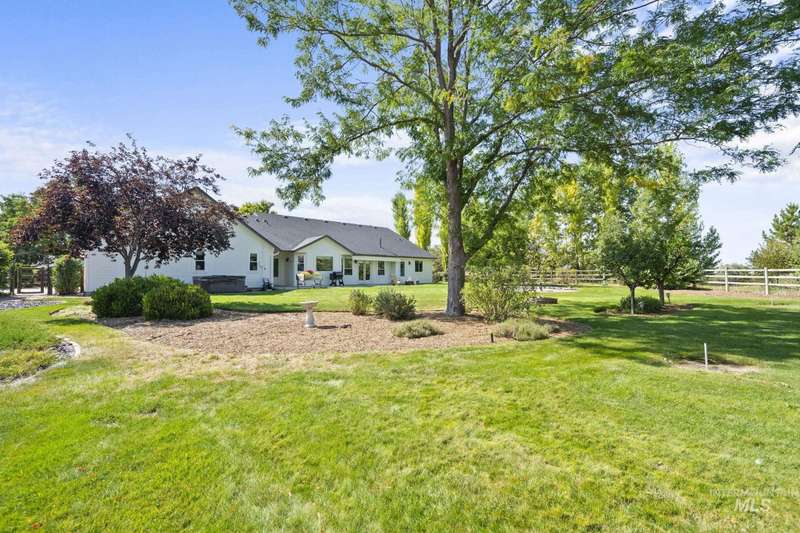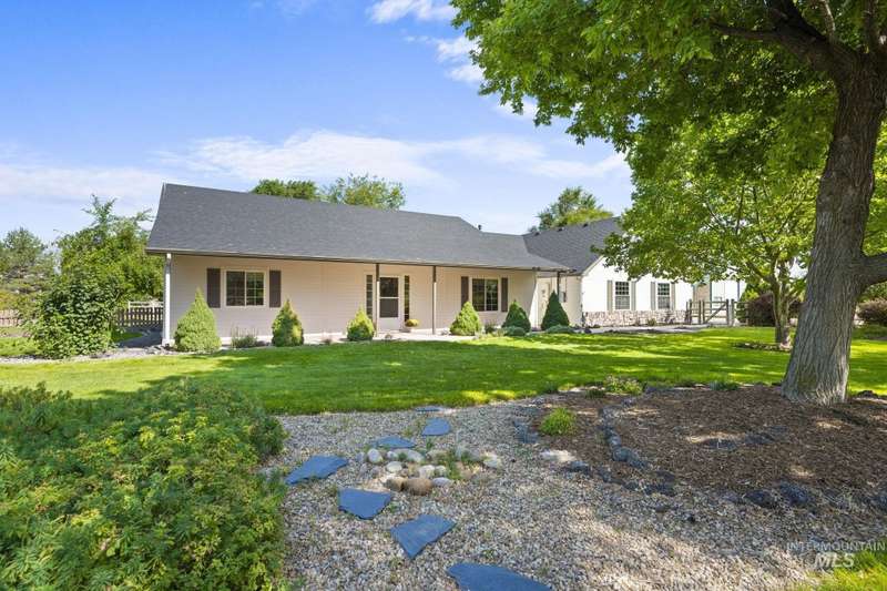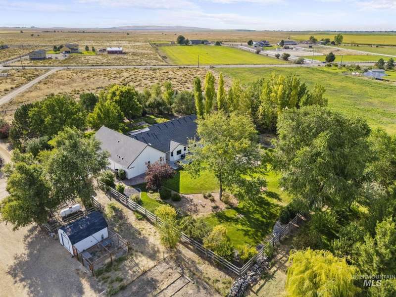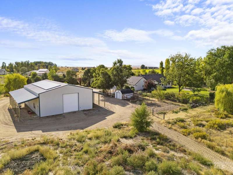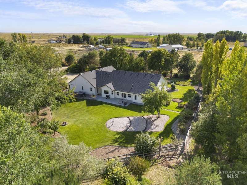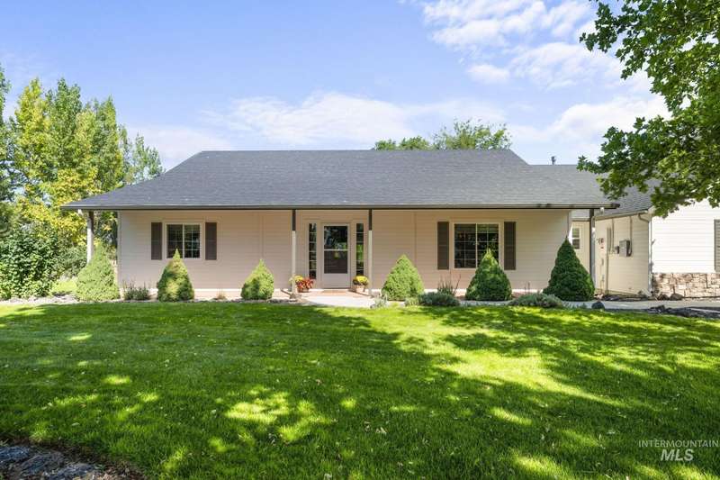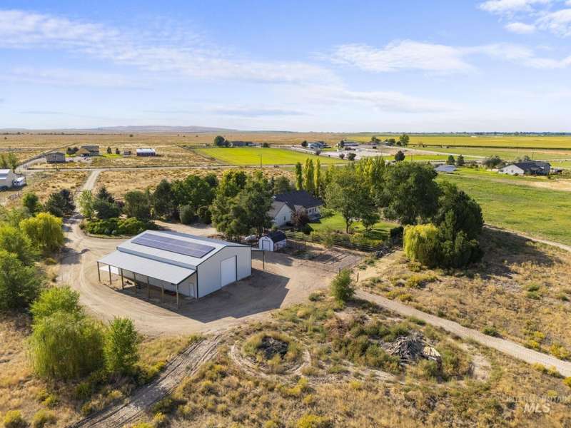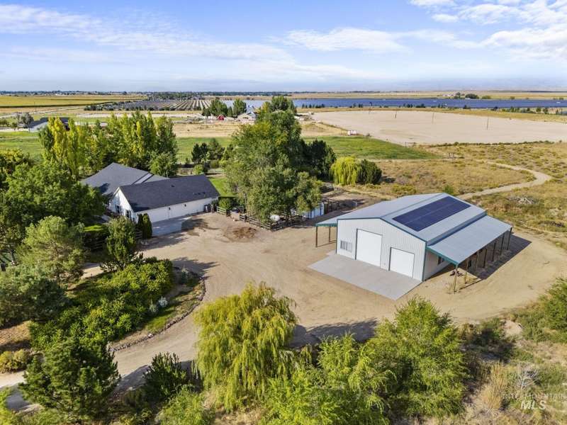 Sprawling Farmland and Open Skies, a Peaceful Retreat. This beautifully renovated single-level home blends refined country living with modern comfort. The open floor plan highlights sleek finishes and expansive windows that capture panoramic views. The large chef's kitchen opens to a spacious dining area perfect for gatherings, while the great room with pellet stove creates a warm retreat. A billiards room offers a pool table and entertaining space. The large private primary suite opens to lush green space and a hot tub, a true sanctuary. Solar panels deliver efficient, low cost electricity. The property boasts a 60'x40" insulated shop, mature trees including peach pear, plum, cherry apricot & apple, complement expansive irrigable acreage inviting your dream lifestyle- whether equestrian pursuits, hobby farming, or simply savoring wide open Idaho skies. Tractor and farm equipment included. Located just minutes from Kuna and a short drive to Boise, this property offers peace, privacy and endless possibilities.