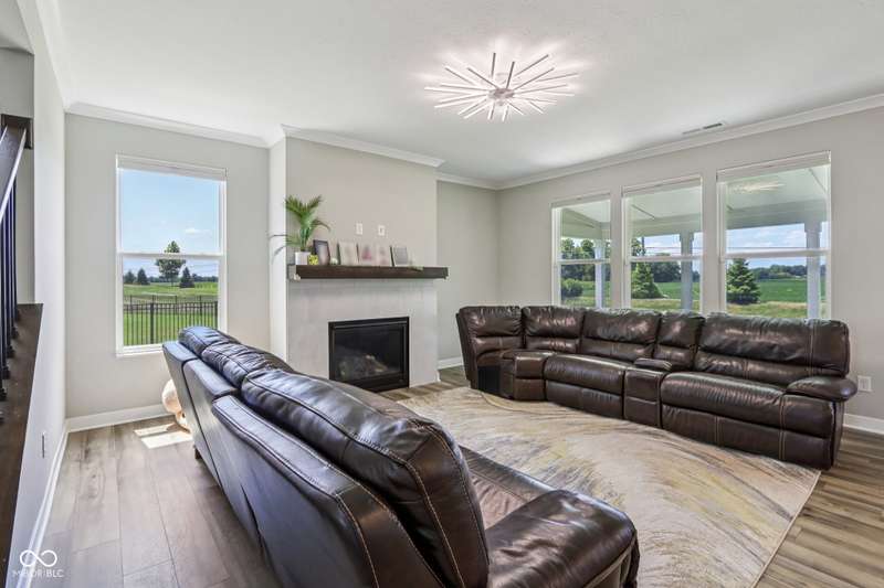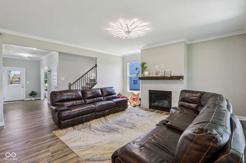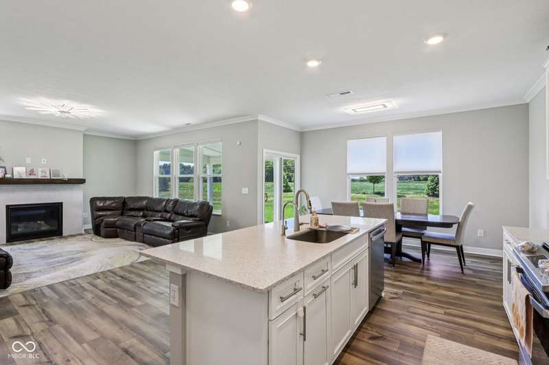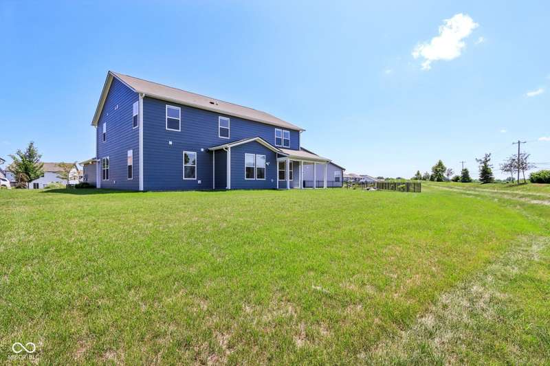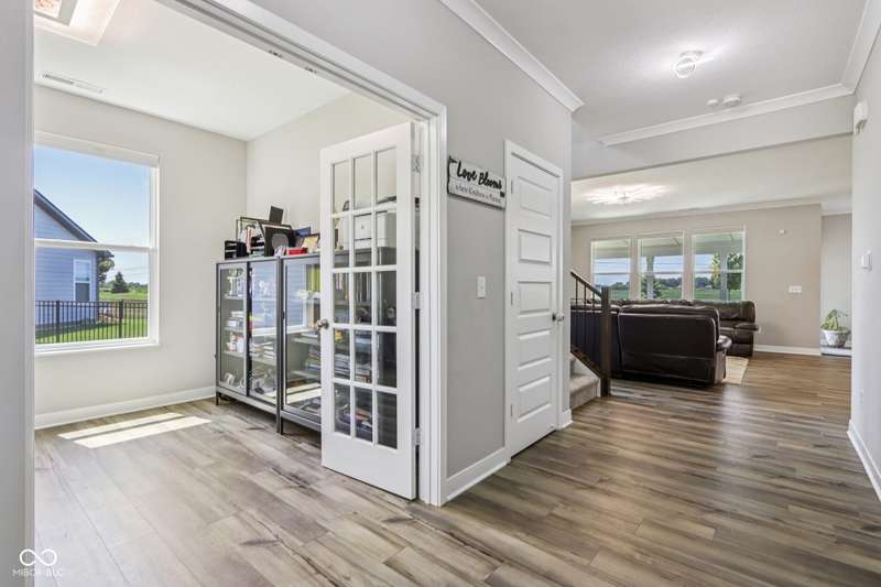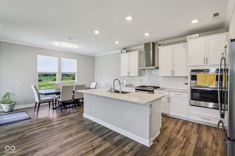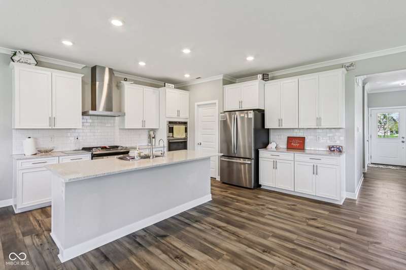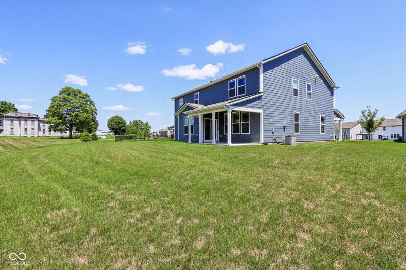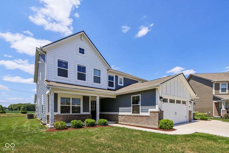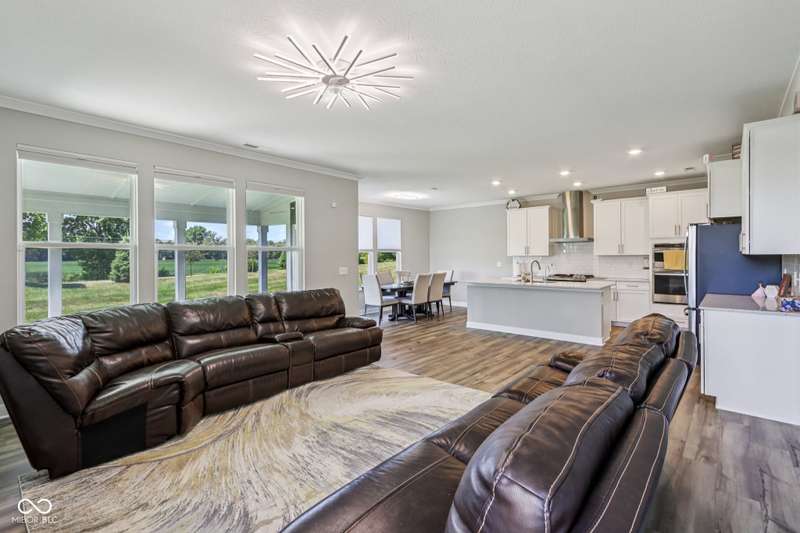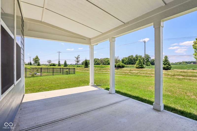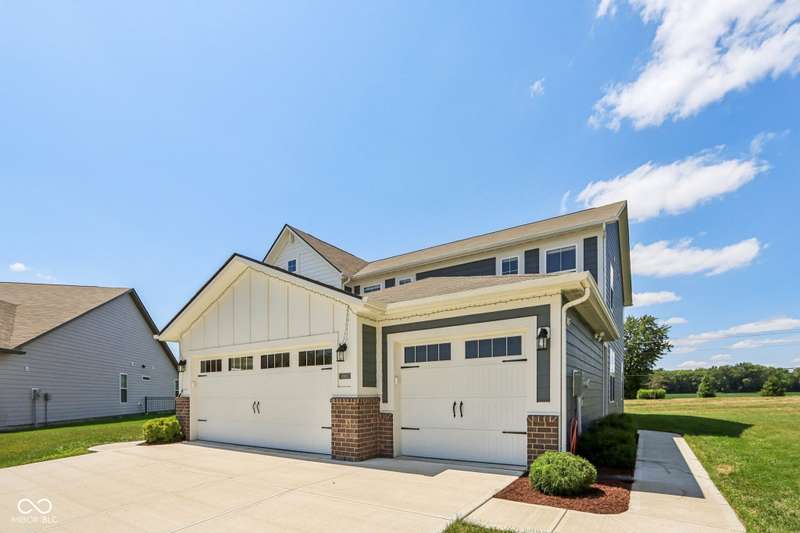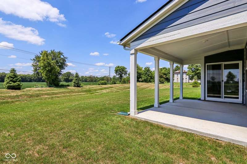 Welcome home to this stunning 5 bedroom, 4.5 bath residence in New Palestine, perfectly situated on a peaceful cul-de-sac. Practically new and filled with upgrades, this home was designed for both everyday living and entertaining. One of only five homes in the neighborhood with a true generational studio suite, it offers unmatched versatility. Complete with a living area, private bedroom and bath, kitchenette, stackable laundry, and its own private entrance, this space is ideal for in-laws, adult children, guests, or even a home office. The open-concept main level features premium LVP flooring, crown molding, a morning room, and a gourmet kitchen with white cabinetry, soft-close drawers, pullout shelves, quartz countertops, a spacious island, gas range with vented hood, plus an additional built-in oven and microwave. Upstairs, a large loft provides extra living space. The luxurious primary suite boasts dual vanities and dual walk-in closets, while the secondary bedrooms are split between an ensuite, and a Jack & Jill bath. Relax on the covered front porch or take in sunsets from the covered back patio with an unbeatable view. Additional highlights include: quartz countertops in bathrooms, higher-quality LVP flooring installed in 2024, full-house water system with reverse osmosis & alkaline water, 3-zone climate control, allergen-friendly living (no pets, no shoes, ducts cleaned post-construction), and generous storage with large closets & pull down ladder attic access. This home combines thoughtful design, premium finishes, and modern comfort. Schedule your showing today-you won't want to miss it!