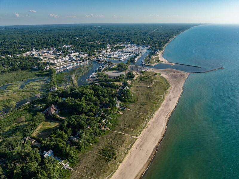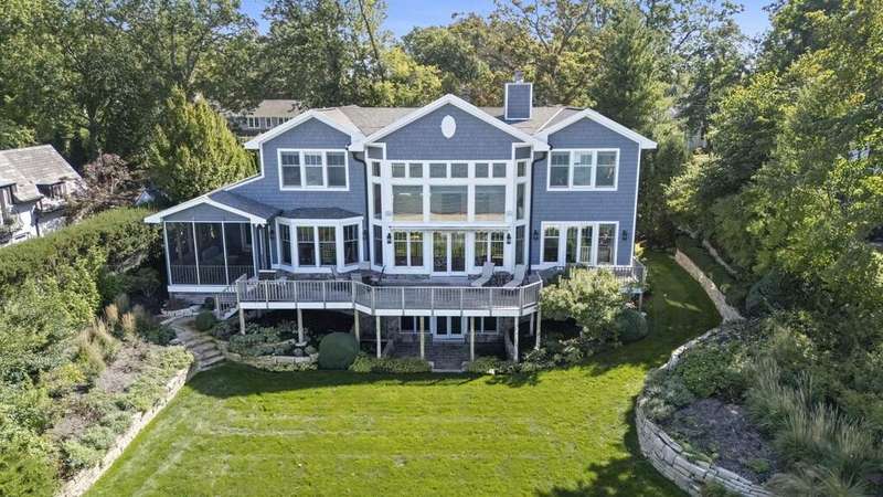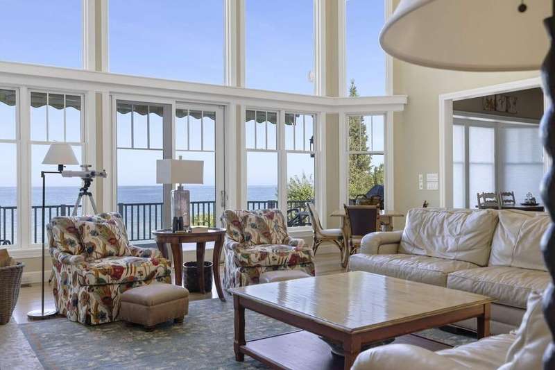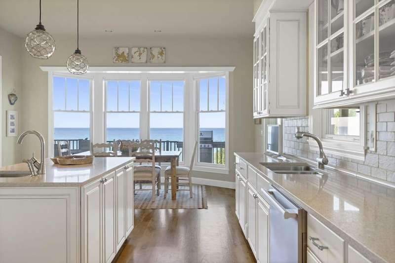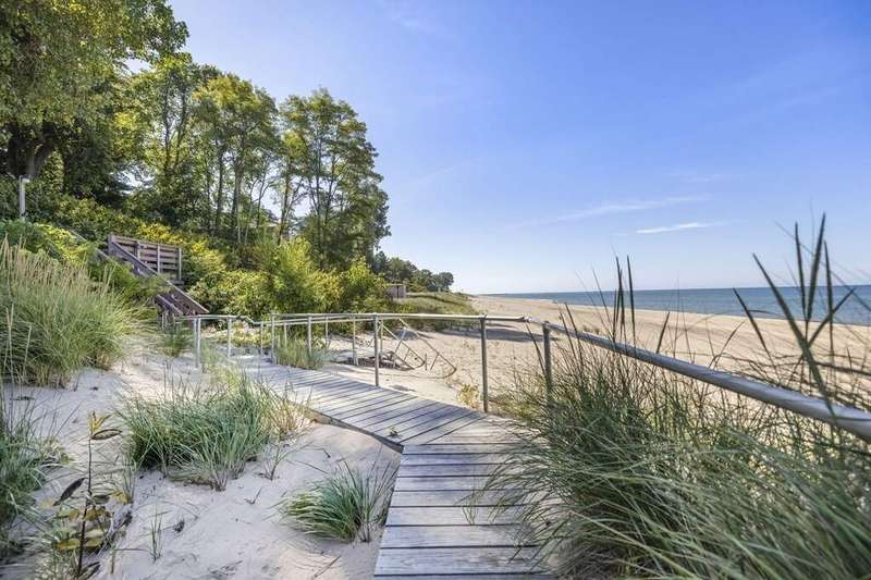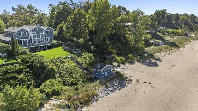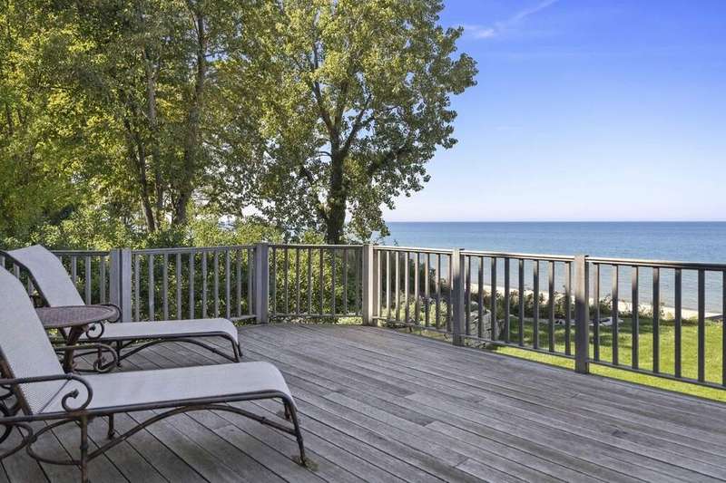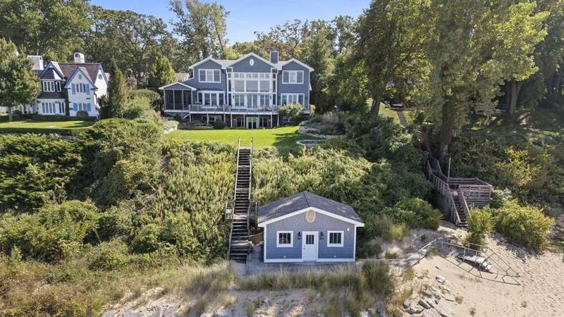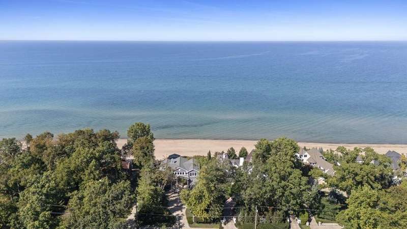 Along the shores of Lake Michigan within the beautiful Riviera Association, experience Harbor Country at its most refined in this Cape Cod-inspired lakefront residence with 100 feet of pristine sandy beach frontage. Designed with an eye toward timeless architecture and effortless living, the home offers 5 bedrooms and 5.1 baths across generous, light-filled interiors. A soaring great room showcases a stone fireplace framed by custom millwork, while wide-plank wood floors flow seamlessly throughout. The chef's kitchen is a study in sophistication with Viking & Bosch professional appliances and panoramic lake views. Outdoor living is equally compelling, with an expansive lakefront terrace, manicured gardens, and a private beach cabana. Every element-inside and out-reflects impeccable craftsmanship and a rare opportunity to embrace the very best of Harbor Country living, just 70 miles from Chicago.