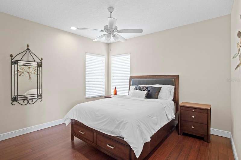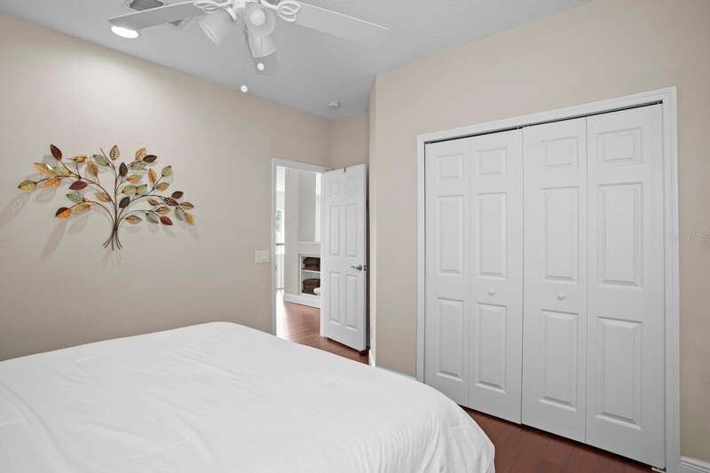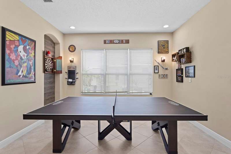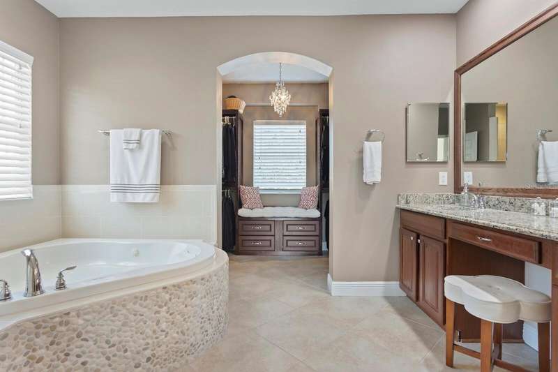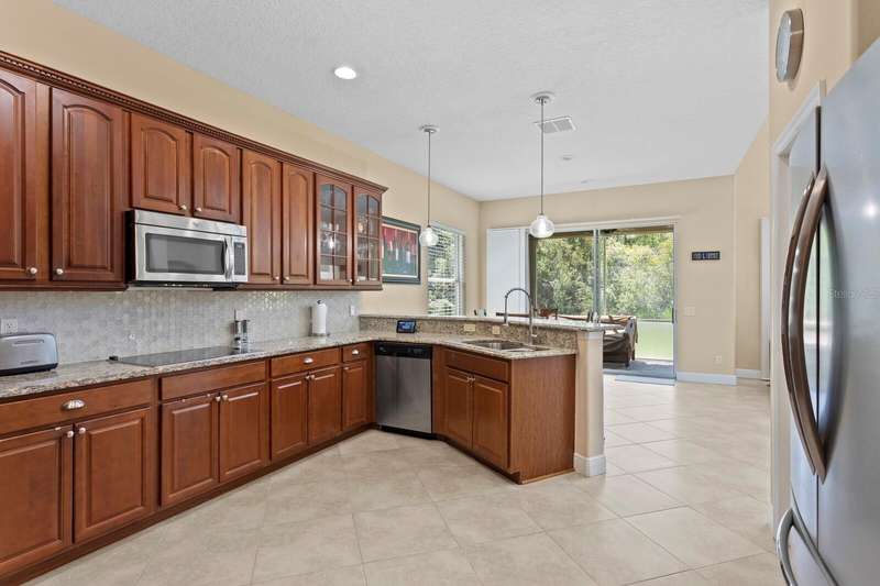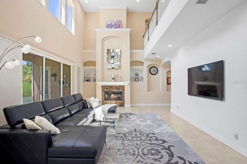 Welcome to this stunning residence in the gated Arbor Greene community. Located within the sought-after Parkview Village, this custom-built home is perfectly positioned on an oversized lot at the end of a quiet cul-de-sac with expansive conservation views and a community open space directly across from the home for added privacy and a park-like setting.Offering 5 bedrooms, 3.5 baths, a theater room, and a game room, it delivers the space and flexibility today’s buyers crave. The inviting courtyard entry and separate three-car garage create a warm first impression. Step through the leaded, beveled-glass door and you’ll immediately feel the difference: soaring two-story ceilings in both the entry foyer and family room flood the home with natural light. Beautiful finishes include engineered wood flooring in the formal dining room, oversized baseboards, and 18x18 tile laid on the diagonal throughout the foyer, kitchen, family room, and breakfast nook. A stack-stone wood-burning fireplace with wood mantle and built-ins anchors the family room. The gourmet kitchen is a chef’s dream, showcasing 42” maple cabinetry with dental molding and glass-front uppers, granite countertops, stainless steel double ovens, a walk-in pantry, and pendant lighting. The adjacent breakfast nook overlooks the lanai and lush backyard, while the powder bath is conveniently located just off the main living space. Flexible living continues on the main floor with a bonus room featuring double-door entry, a guest bedroom with custom built-in bookshelves, and an in-home theater room, perfect for entertaining. Upstairs, rich wood flooring flows throughout all bedrooms. The primary suite offers a luxurious retreat with a custom walk-in closet, granite-topped maple cabinetry, a pebblestone shower, and an oversized jetted Jacuzzi tub. All secondary bathrooms have been updated with granite as well. A utility closet upstairs provides added convenience. Outdoor living is equally impressive. A spacious lanai with built-in grill overlooks the large, private backyard and wooded conservation views — ideal for gatherings or quiet evenings alike. Residents of Arbor Greene enjoy resort-style amenities including a fitness center, lap pool, resort-style pool with slide, tennis and basketball courts, dog park, playgrounds, and miles of scenic walking trails, all with modest HOA fees. This extraordinary Parkview home combines luxury finishes, thoughtful upgrades, and a prime location just minutes from top-rated schools, shopping, dining, I-75, I-275, and USF.