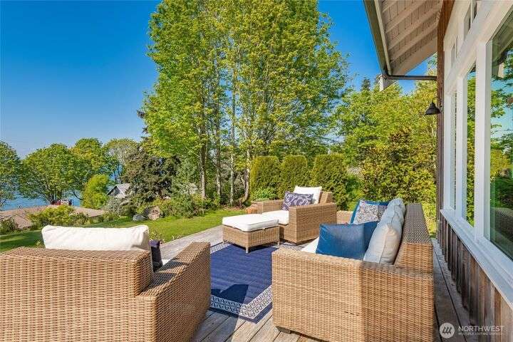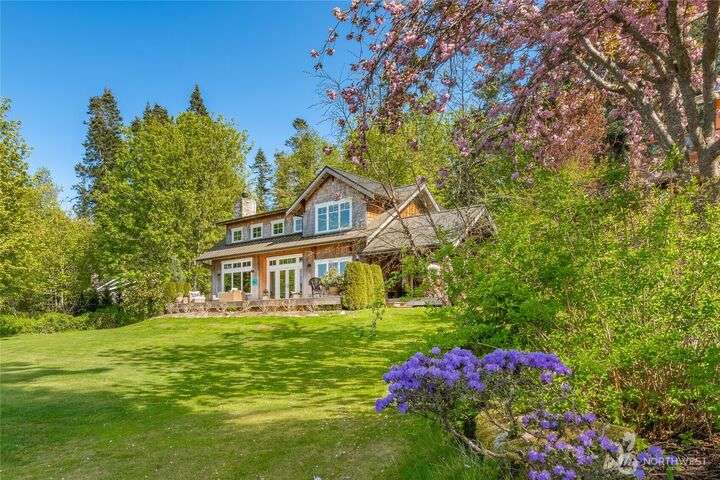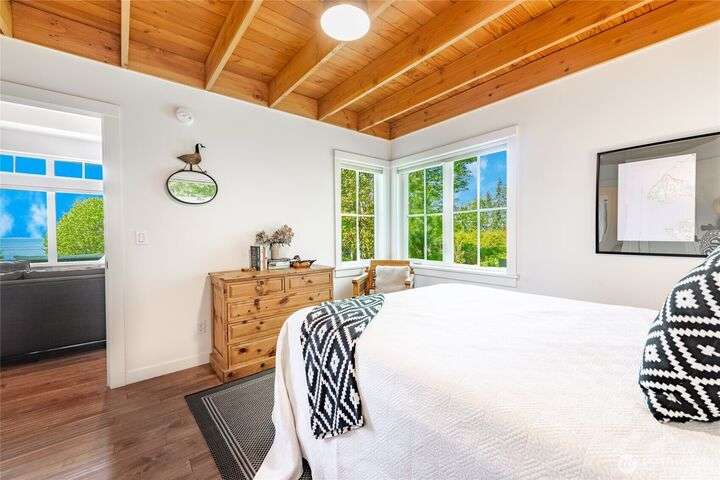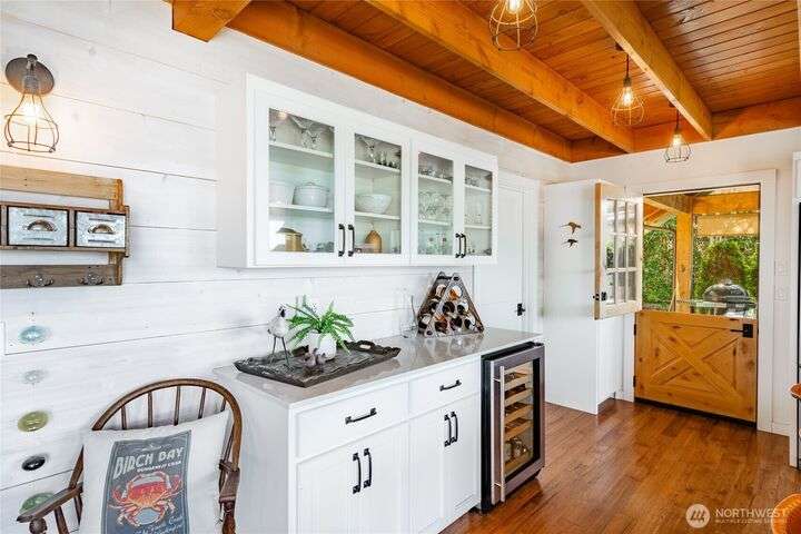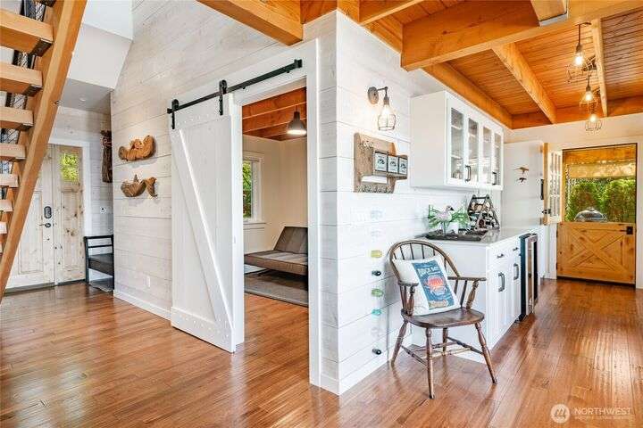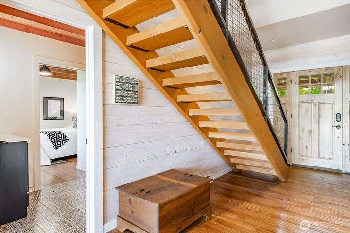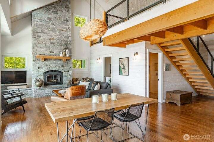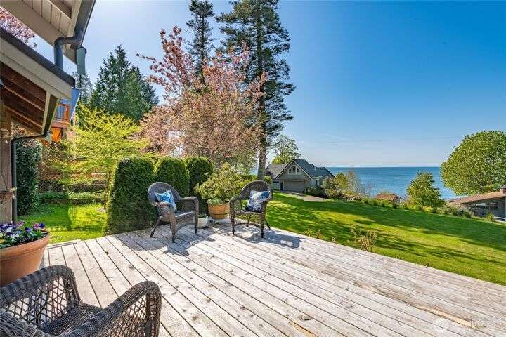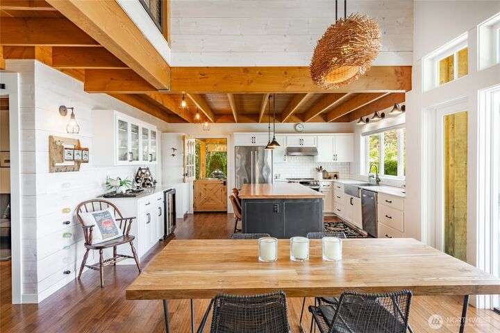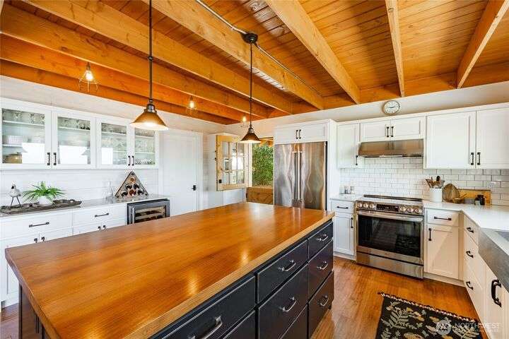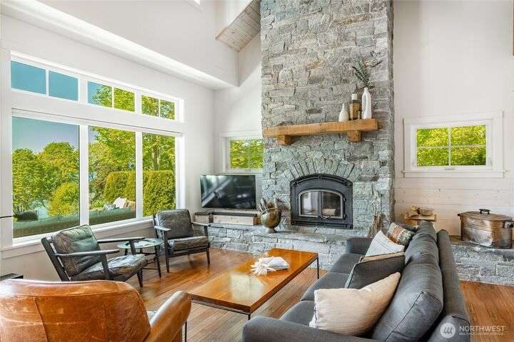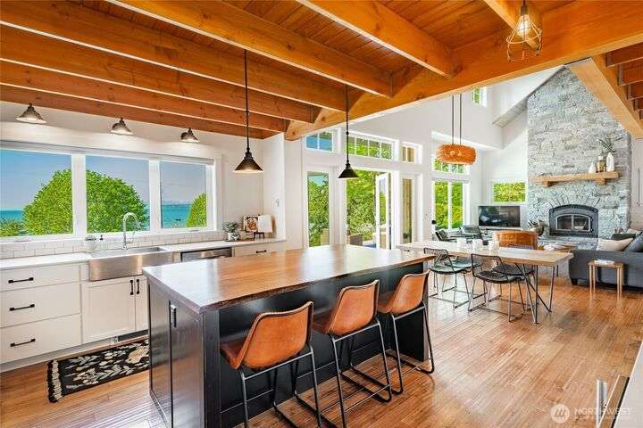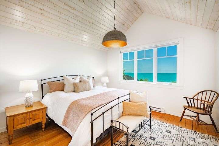 Nestled into a hillside overlooking the breathtaking Strait of Georgia, this warm & inviting home seamlessly blends rustic charm with refined craftsmanship - a modern cabin retreat. From the moment you arrive, the home's unique character is apparent. White-washed shiplap walls, exposed framing, & heavy timber beam work create a cozy yet sophisticated ambiance. A striking floor-to-ceiling stone wood-burning fireplace anchors the heart of the home, while a gorgeous floating staircase built from massive timbers adds architectural interest. The modern kitchen is both functional & beautiful, featuring high-end appliances, a generous island, & ample storage. A rare opportunity to own a truly special property in a premier location near Semiahmoo.