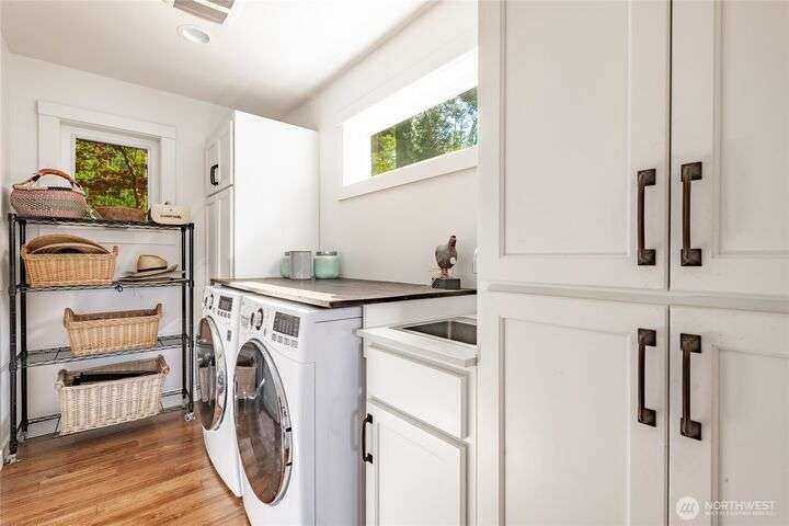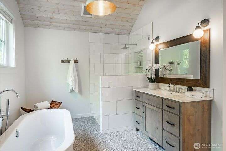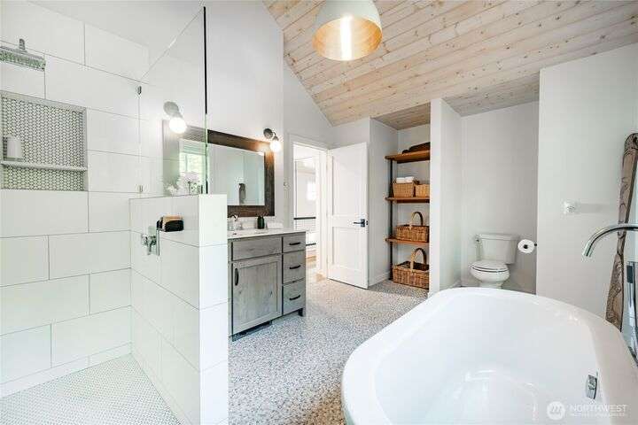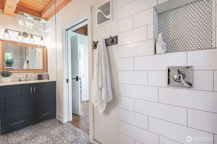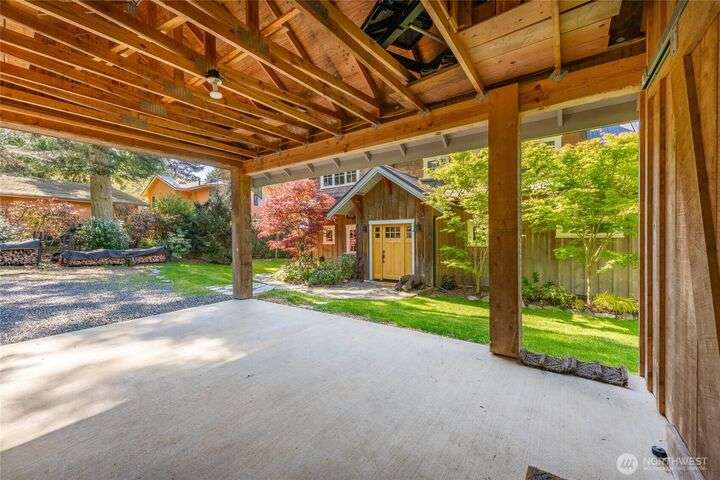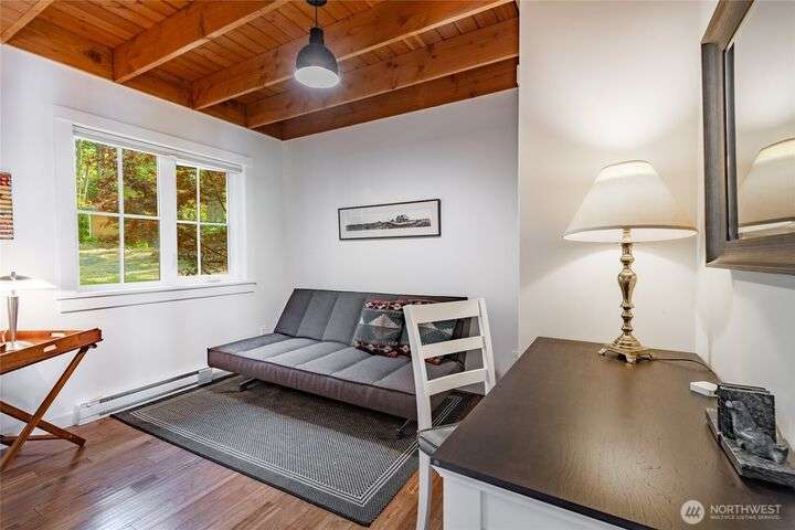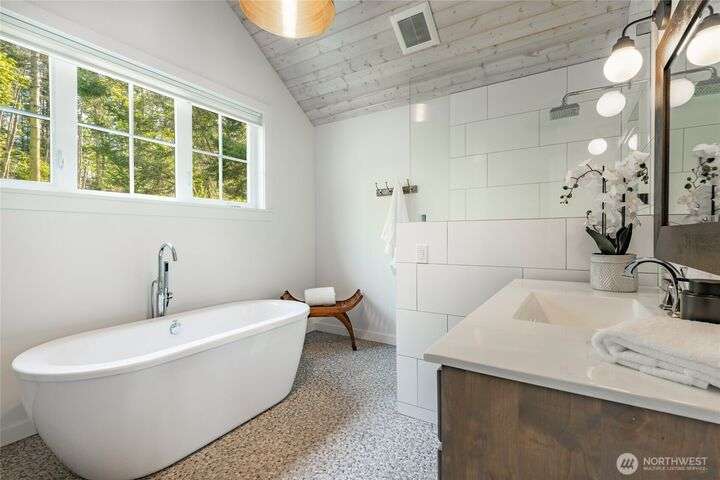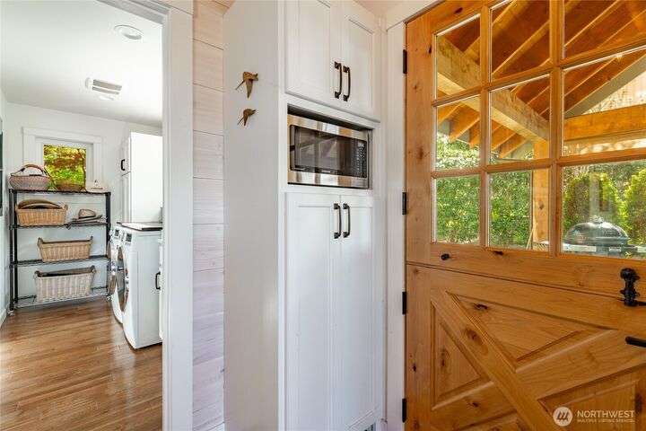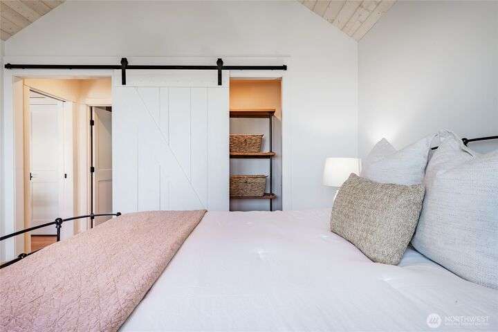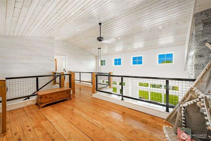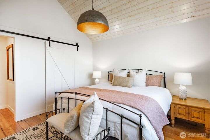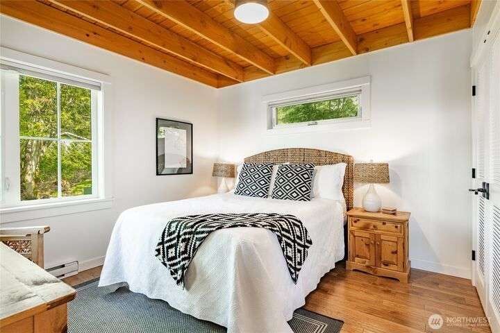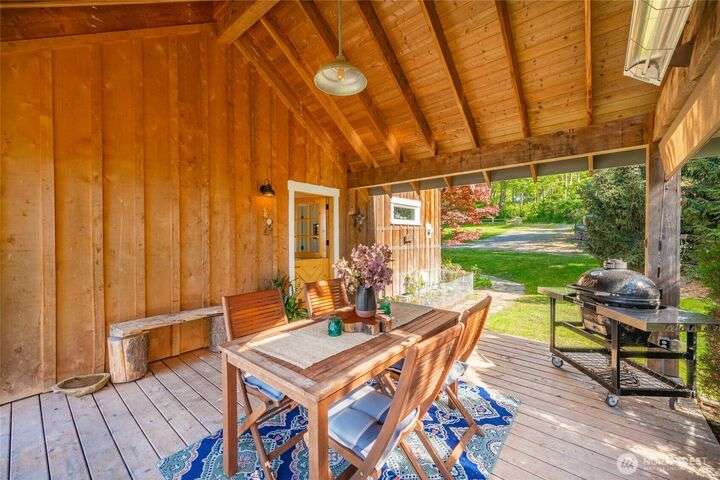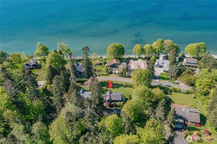 Nestled into a hillside overlooking the breathtaking Strait of Georgia, this warm & inviting home seamlessly blends rustic charm with refined craftsmanship - a modern cabin retreat. From the moment you arrive, the home's unique character is apparent. White-washed shiplap walls, exposed framing, & heavy timber beam work create a cozy yet sophisticated ambiance. A striking floor-to-ceiling stone wood-burning fireplace anchors the heart of the home, while a gorgeous floating staircase built from massive timbers adds architectural interest. The modern kitchen is both functional & beautiful, featuring high-end appliances, a generous island, & ample storage. A rare opportunity to own a truly special property in a premier location near Semiahmoo.